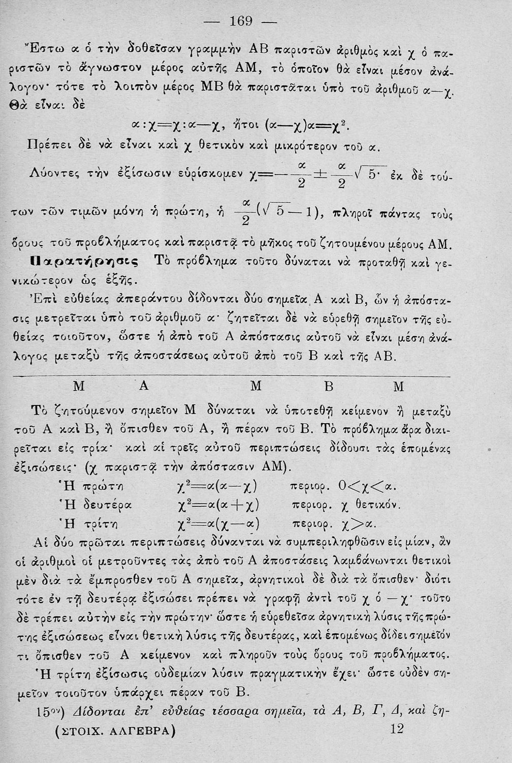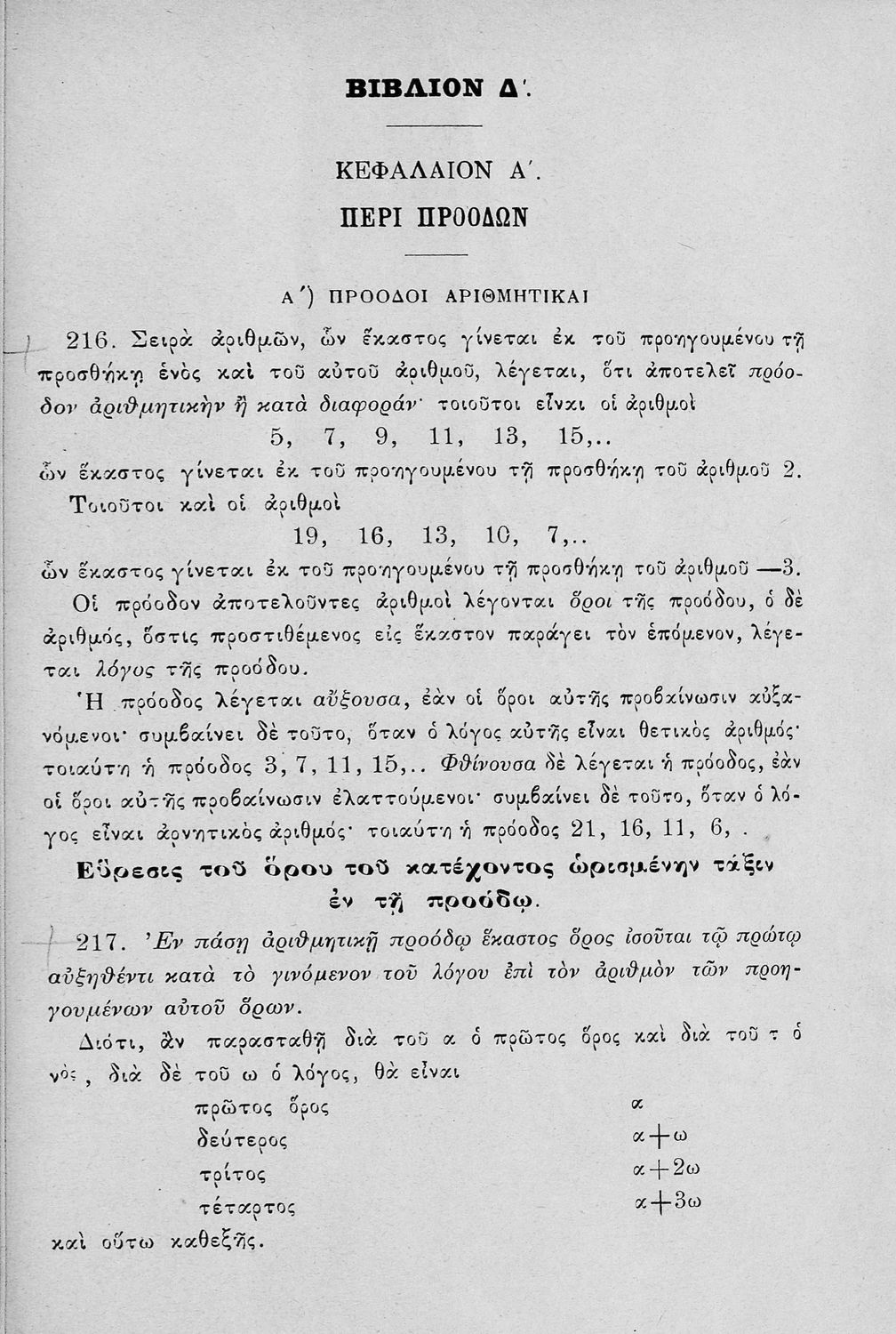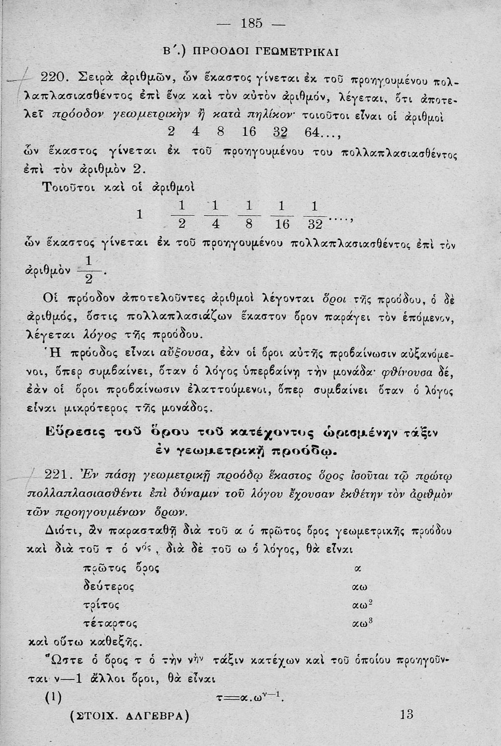 Βαθμίδα εκπαίδευσης: Δευτεροβάθμια Τάξη: Γυμνάσιο Μάθημα: Μαθηματικά Γλώσσα: Καθαρεύουσα Παρουσίαση περιεχομένου: Σχολικό εγχειρίδιο για τις τάξεις του Γυμνασίου για το μάθημα των Μαθηματικών και συγκεκριμένα της Άλγεβρας. Το εγχειρίδιο περιλαμβάνει εισαγωγικά γενικές πληροφορίες για τις 4 βασικές πράξεις συνεχίζει με τις αλγεβρικές παραστάσεις, εξισώσεις πρώτου και δευτέρου βαθμού, δυνάμεις και πολυώνυμα, πρόοδοι, λογάριθμοι, κ.α. |
