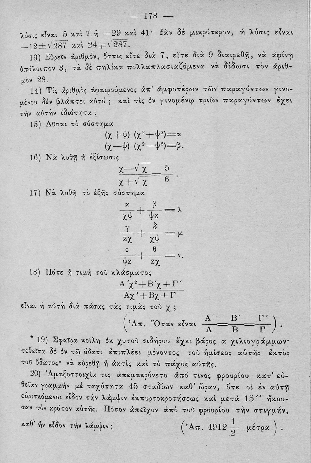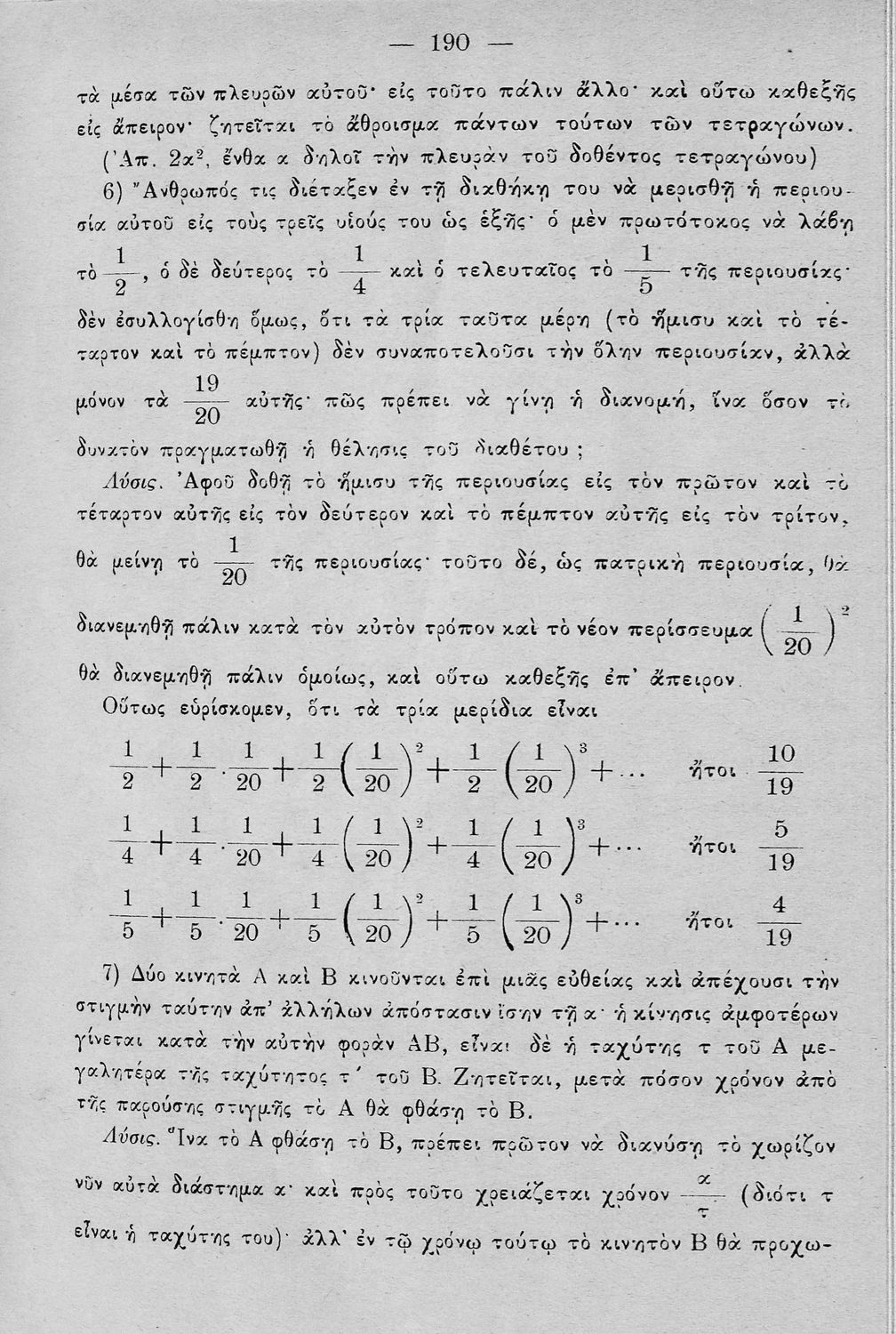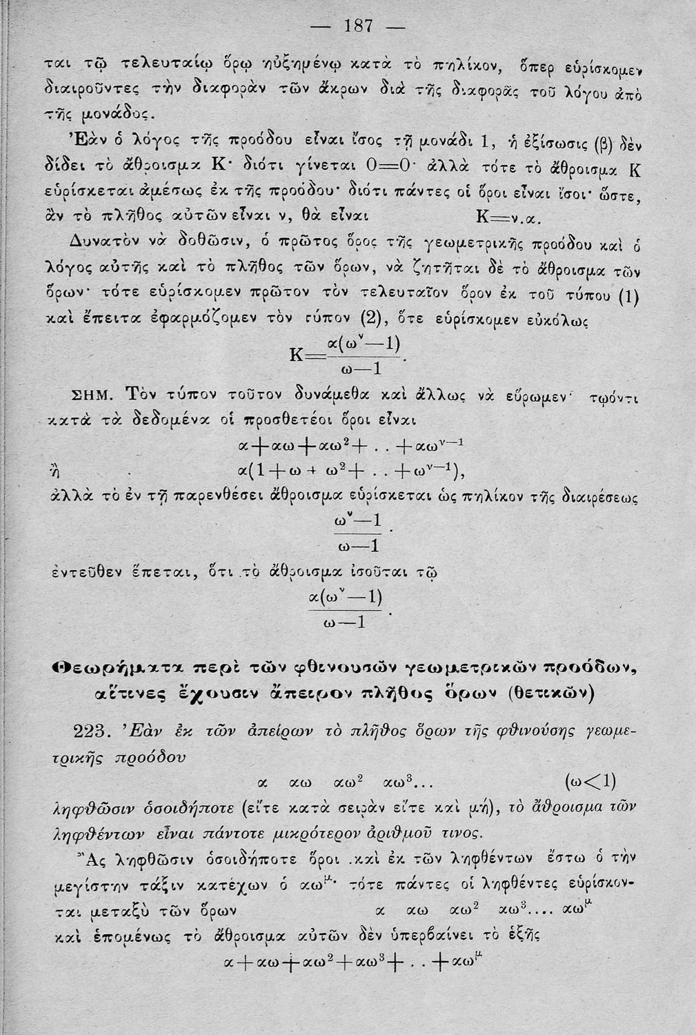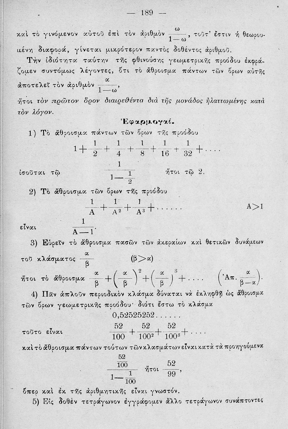 Βαθμίδα εκπαίδευσης: Δευτεροβάθμια Τάξη: Γυμνάσιο Μάθημα: Μαθηματικά Γλώσσα: Καθαρεύουσα Παρουσίαση περιεχομένου: Σχολικό εγχειρίδιο για τις τάξεις του Γυμνασίου για το μάθημα των Μαθηματικών και συγκεκριμένα της Άλγεβρας. Το εγχειρίδιο περιλαμβάνει εισαγωγικά γενικές πληροφορίες για τις 4 βασικές πράξεις συνεχίζει με τις αλγεβρικές παραστάσεις, εξισώσεις πρώτου και δευτέρου βαθμού, δυνάμεις και πολυώνυμα, πρόοδοι, λογάριθμοι, κ.α. |
