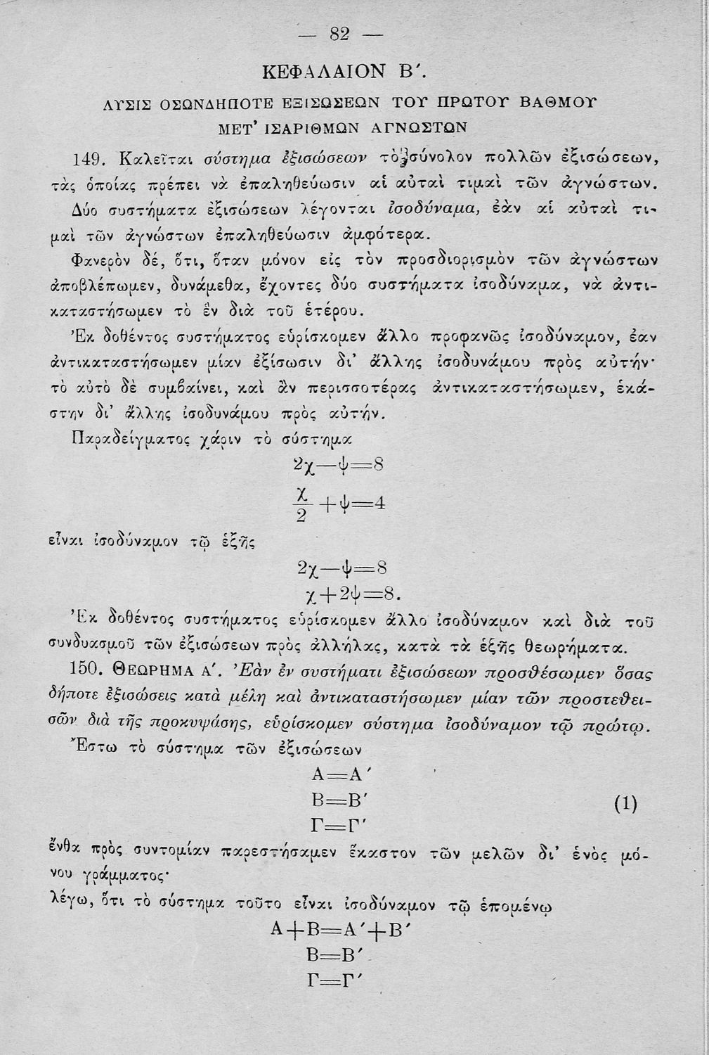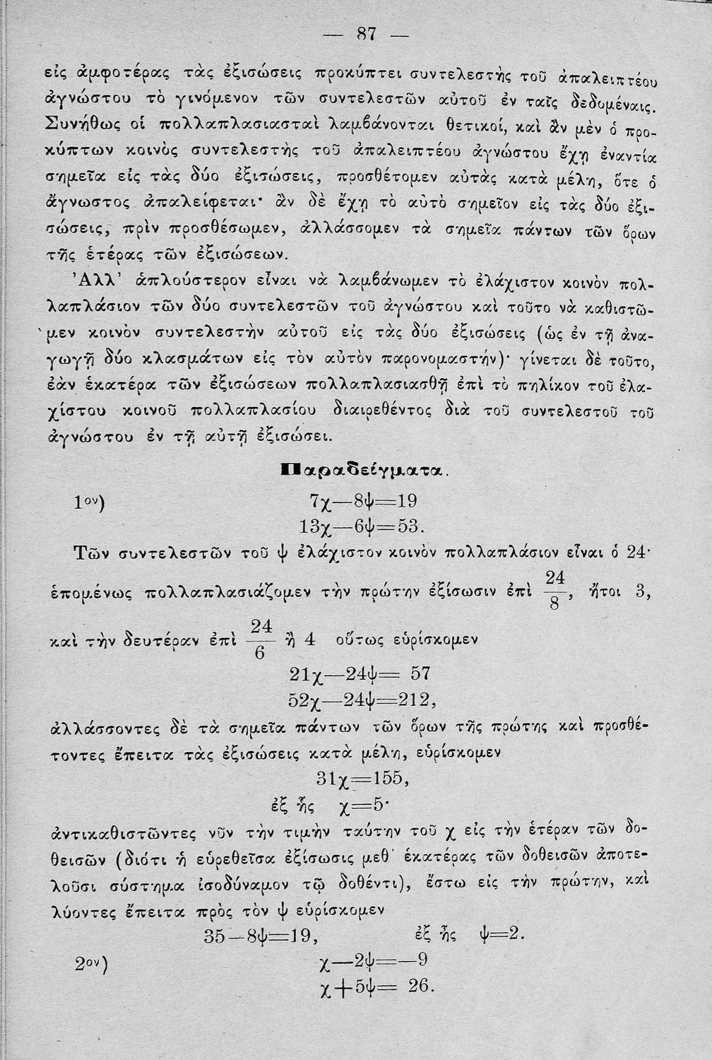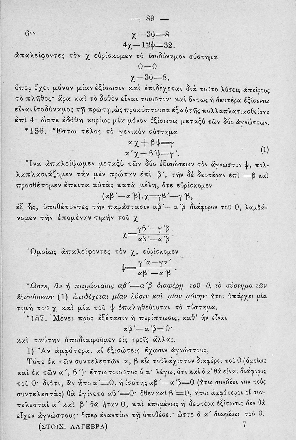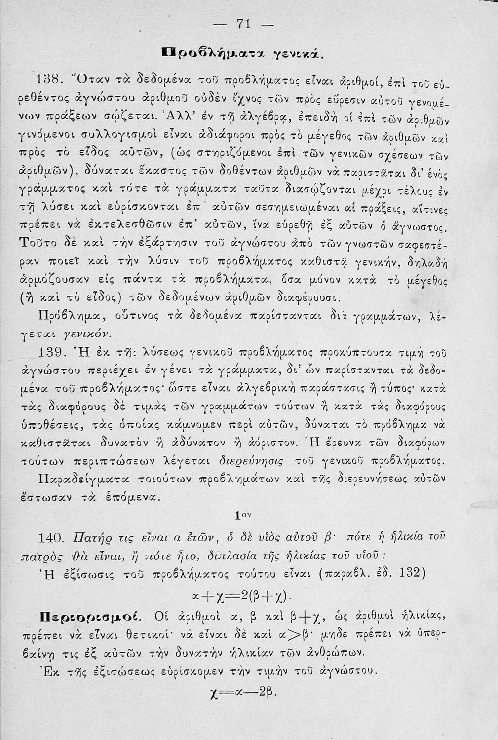 Βαθμίδα εκπαίδευσης: Δευτεροβάθμια Τάξη: Γυμνάσιο Μάθημα: Μαθηματικά Γλώσσα: Καθαρεύουσα Παρουσίαση περιεχομένου: Σχολικό εγχειρίδιο για τις τάξεις του Γυμνασίου για το μάθημα των Μαθηματικών και συγκεκριμένα της Άλγεβρας. Το εγχειρίδιο περιλαμβάνει εισαγωγικά γενικές πληροφορίες για τις 4 βασικές πράξεις συνεχίζει με τις αλγεβρικές παραστάσεις, εξισώσεις πρώτου και δευτέρου βαθμού, δυνάμεις και πολυώνυμα, πρόοδοι, λογάριθμοι, κ.α. |
