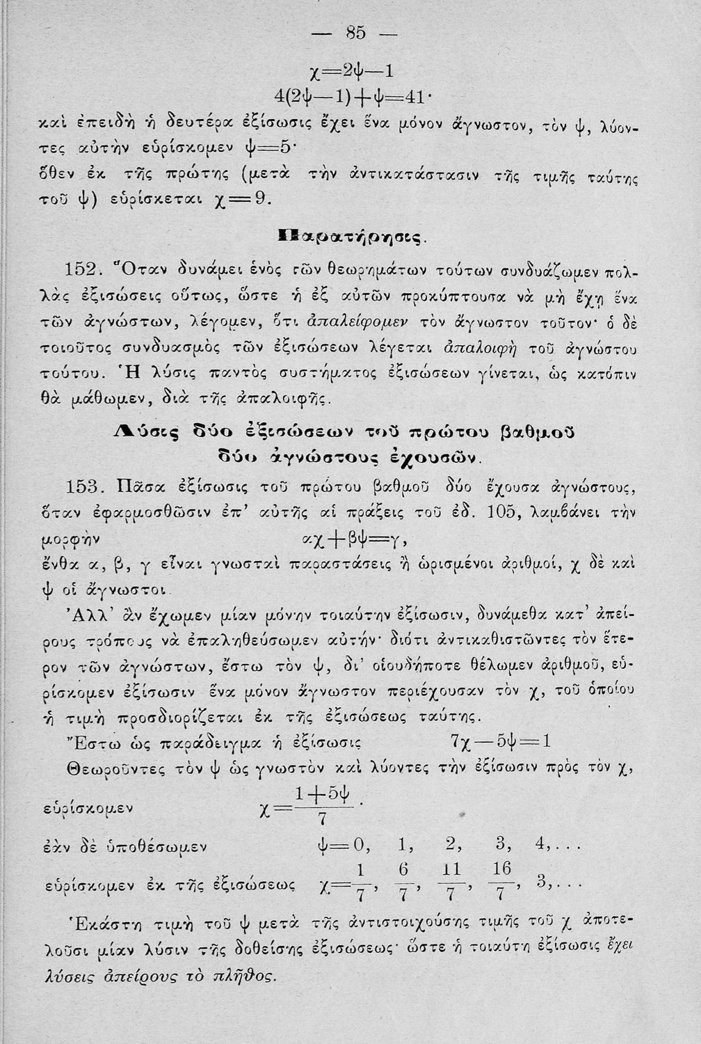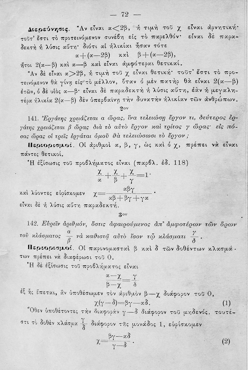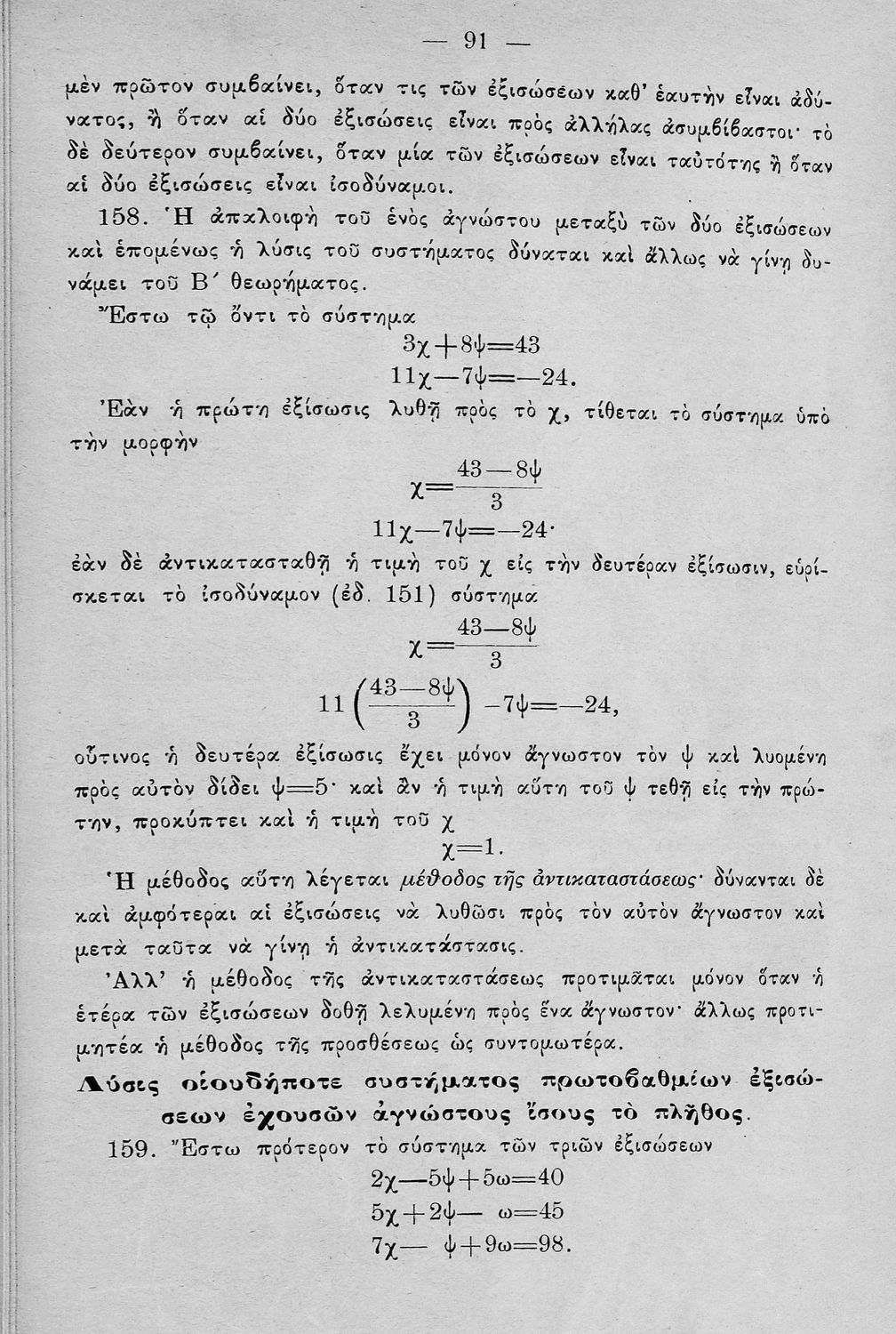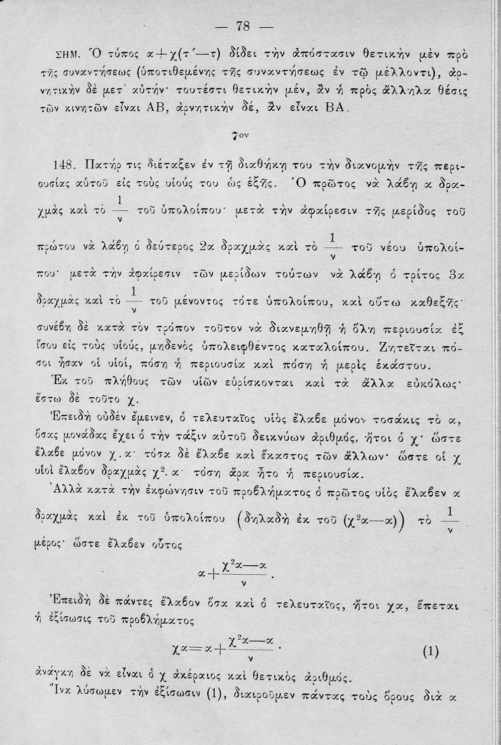 Βαθμίδα εκπαίδευσης: Δευτεροβάθμια Τάξη: Γυμνάσιο Μάθημα: Μαθηματικά Γλώσσα: Καθαρεύουσα Παρουσίαση περιεχομένου: Σχολικό εγχειρίδιο για τις τάξεις του Γυμνασίου για το μάθημα των Μαθηματικών και συγκεκριμένα της Άλγεβρας. Το εγχειρίδιο περιλαμβάνει εισαγωγικά γενικές πληροφορίες για τις 4 βασικές πράξεις συνεχίζει με τις αλγεβρικές παραστάσεις, εξισώσεις πρώτου και δευτέρου βαθμού, δυνάμεις και πολυώνυμα, πρόοδοι, λογάριθμοι, κ.α. |