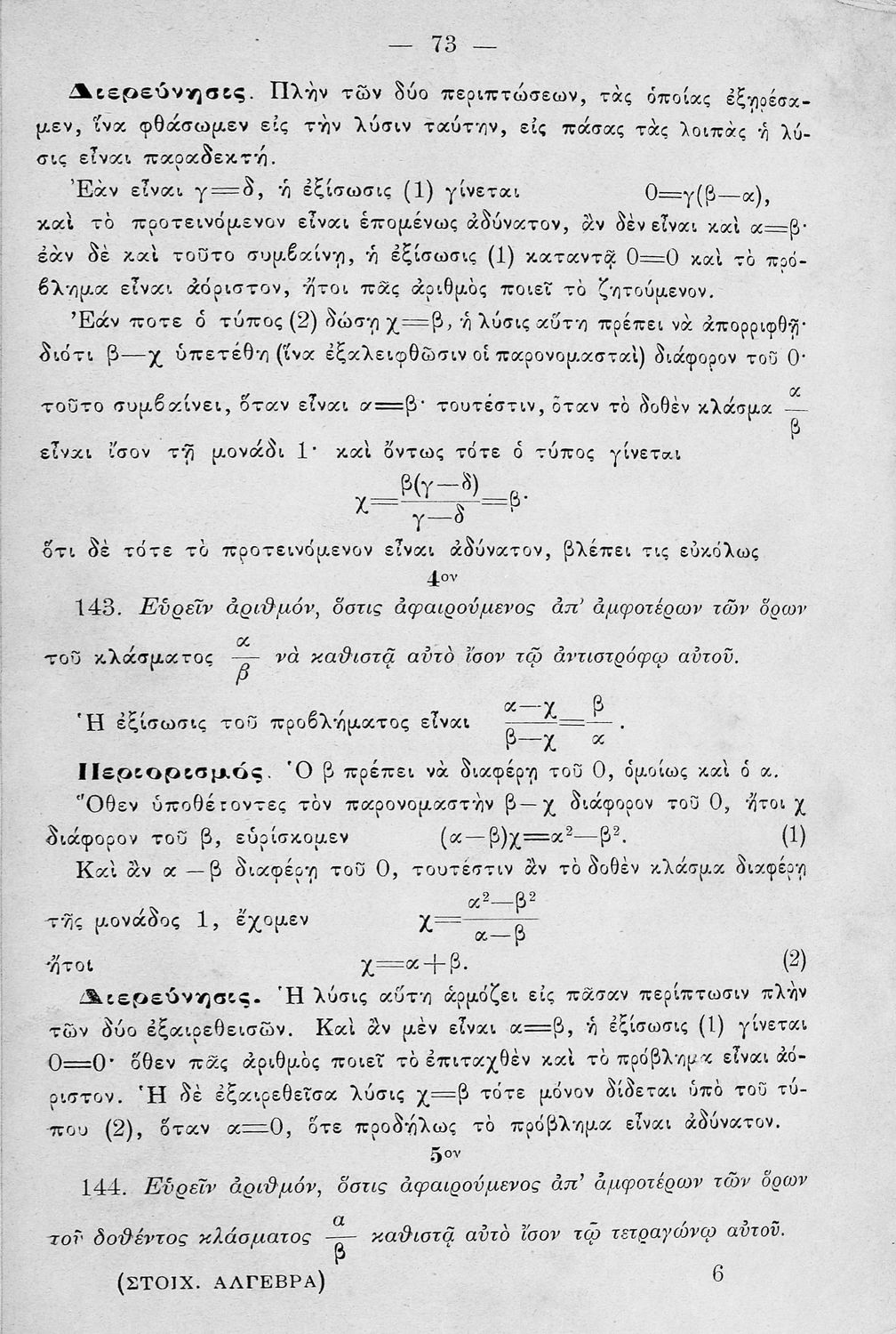 LDR 01500 2200205 4500 035 ## _a09-160622 040 ## _aΑκαδημία Αθηνών 041 ## _ael 100 ## _aΙωάννης Ν. Χατζιδάκις 110 ## _a160622 245 0# _aΣτοιχειώδης άλγεβρα η μόνη εγκριθείσα εν τοις γενομένοις διαγωνισμοίς προς χρήσιν των Γυμνασίων 250 ## _a9η Έκδοση 260 ## _aΑθήνα _bΠ. Δ. Σακελλαρίου _c1906 300 ## _a252 520 ## _aΣχολικό εγχειρίδιο για τις τάξεις του Γυμνασίου για το μάθημα των Μαθηματικών και συγκεκριμένα της Άλγεβρας. Το εγχειρίδιο περιλαμβάνει εισαγωγικά γενικές πληροφορίες για τις 4 βασικές πράξεις συνεχίζει με τις αλγεβρικές παραστάσεις, εξισώσεις πρώτου και δευτέρου βαθμού, δυνάμεις και πολυώνυμα, πρόοδοι, λογάριθμοι, κ.α. 521 ## _aΓυμνάσιο 522 ## _aΕλλάδα 546 ## _aΚαθαρεύουσα 563 ## _aΣκληρό Εξώφυλλο 650 #4 _aΆλγεβρα _aΓυμνασίου _aΔυνάμεις _aΕξισώσεις _aΚαθαρεύουσα _aΛογάριθμοι _aΜαθηματικά _aΠαραστάσεις _aΠολυώνυμα _aΠράξεις _aΡίζες