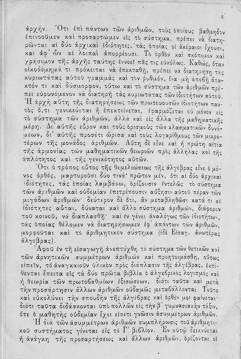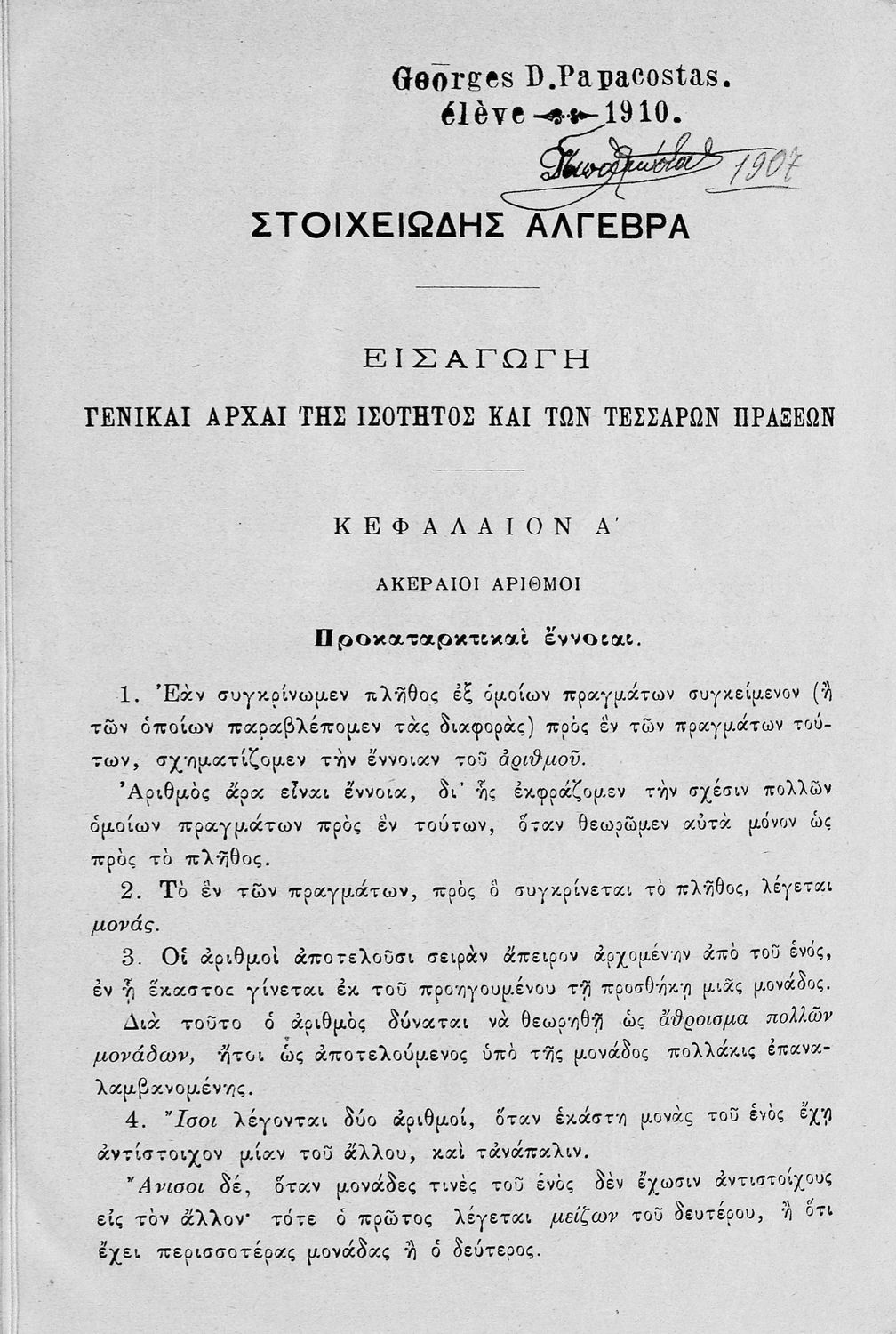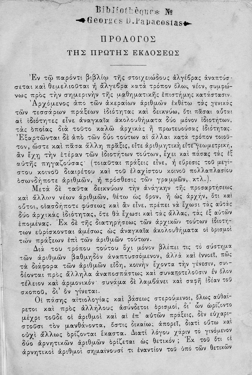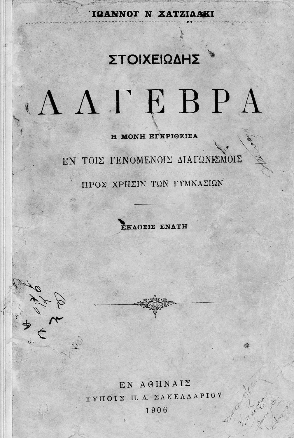 Βαθμίδα εκπαίδευσης: Δευτεροβάθμια Τάξη: Γυμνάσιο Μάθημα: Μαθηματικά Γλώσσα: Καθαρεύουσα Παρουσίαση περιεχομένου: Σχολικό εγχειρίδιο για τις τάξεις του Γυμνασίου για το μάθημα των Μαθηματικών και συγκεκριμένα της Άλγεβρας. Το εγχειρίδιο περιλαμβάνει εισαγωγικά γενικές πληροφορίες για τις 4 βασικές πράξεις συνεχίζει με τις αλγεβρικές παραστάσεις, εξισώσεις πρώτου και δευτέρου βαθμού, δυνάμεις και πολυώνυμα, πρόοδοι, λογάριθμοι, κ.α. |