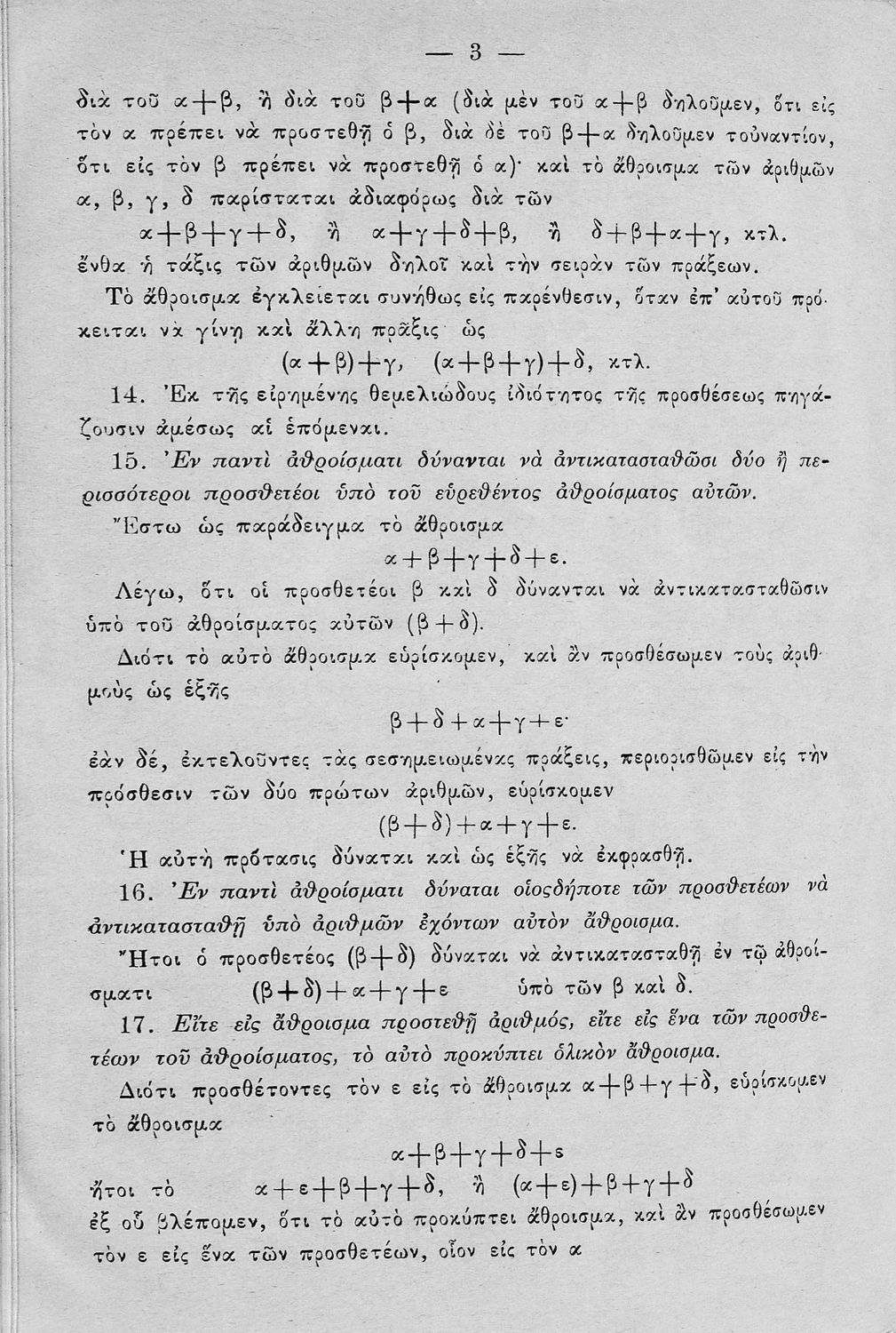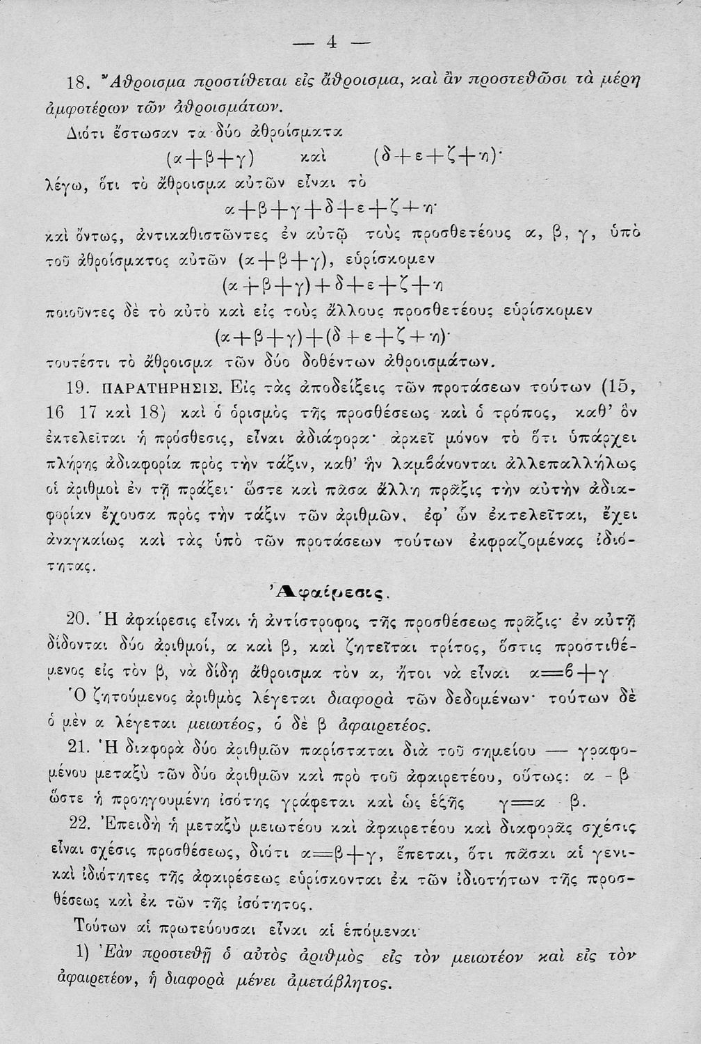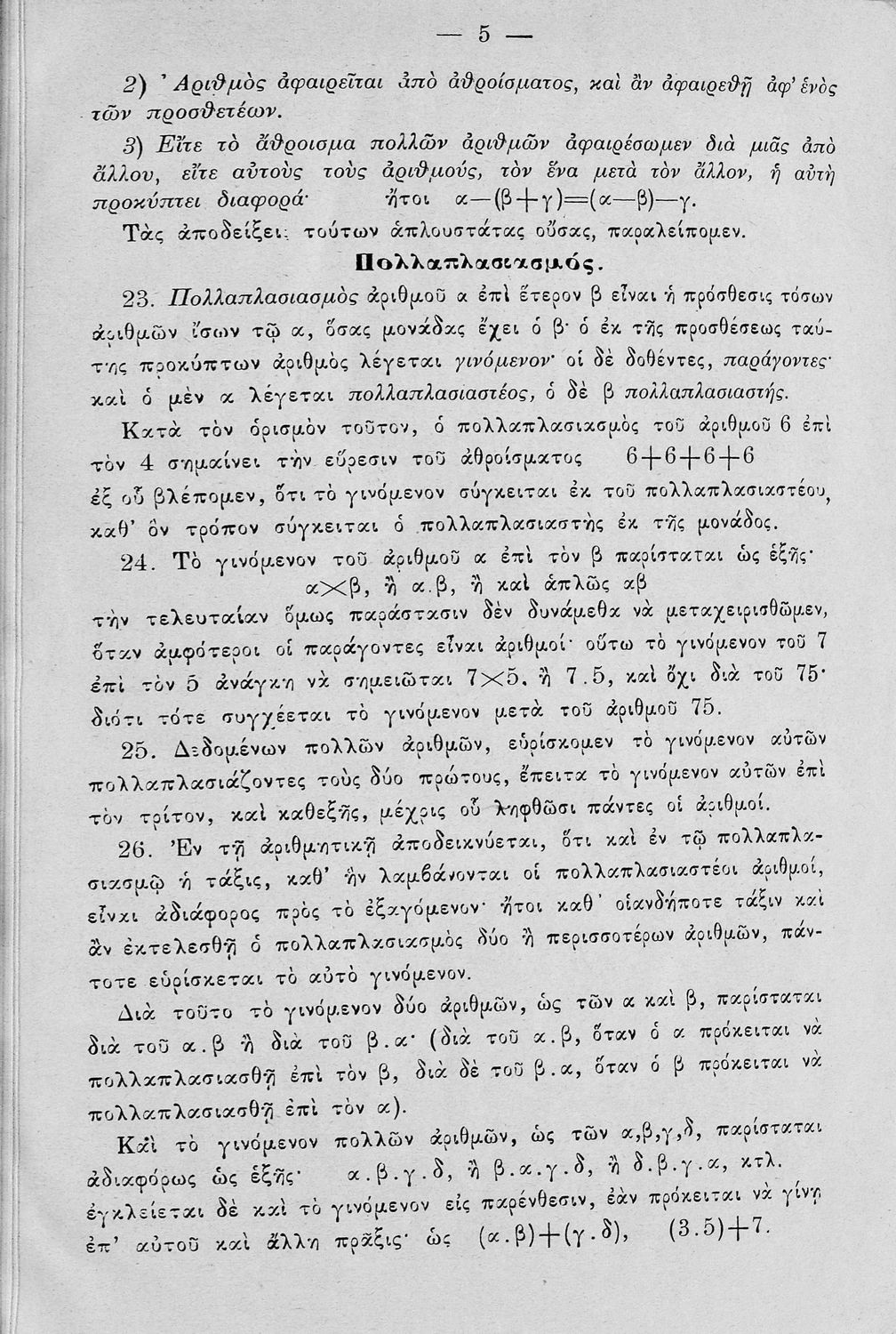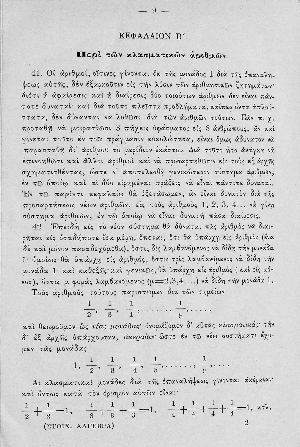 Βαθμίδα εκπαίδευσης: Δευτεροβάθμια Τάξη: Γυμνάσιο Μάθημα: Μαθηματικά Γλώσσα: Καθαρεύουσα Παρουσίαση περιεχομένου: Σχολικό εγχειρίδιο για τις τάξεις του Γυμνασίου για το μάθημα των Μαθηματικών και συγκεκριμένα της Άλγεβρας. Το εγχειρίδιο περιλαμβάνει εισαγωγικά γενικές πληροφορίες για τις 4 βασικές πράξεις συνεχίζει με τις αλγεβρικές παραστάσεις, εξισώσεις πρώτου και δευτέρου βαθμού, δυνάμεις και πολυώνυμα, πρόοδοι, λογάριθμοι, κ.α. |