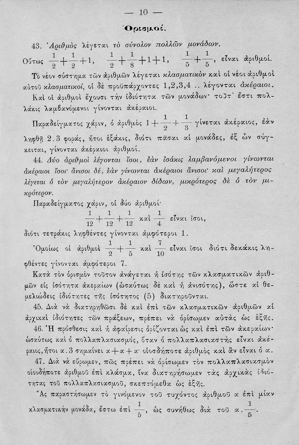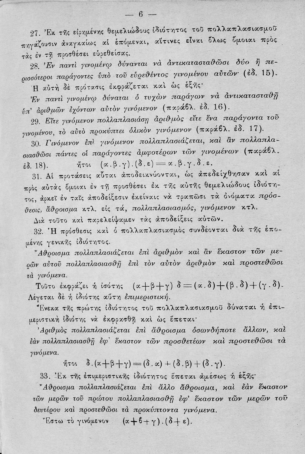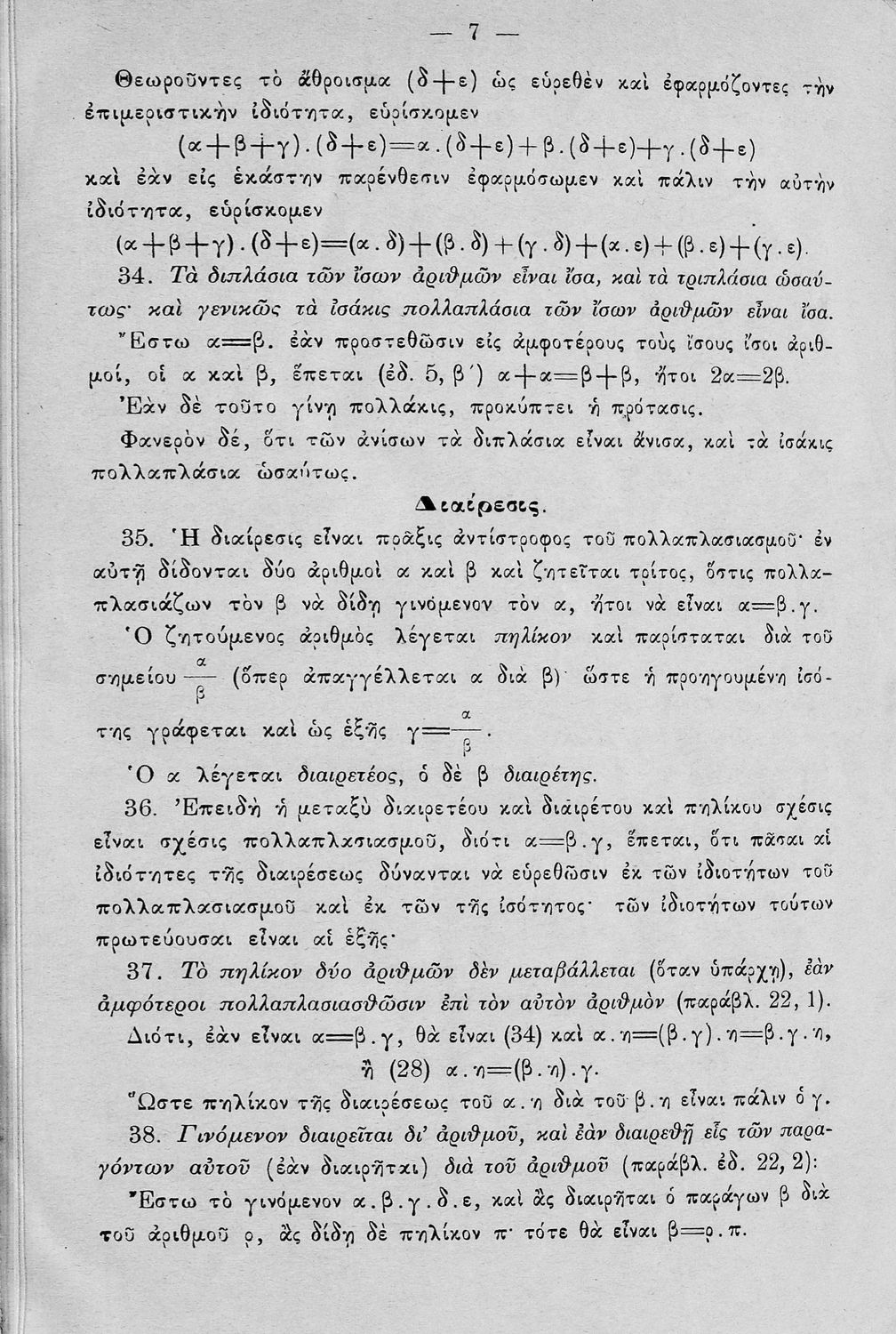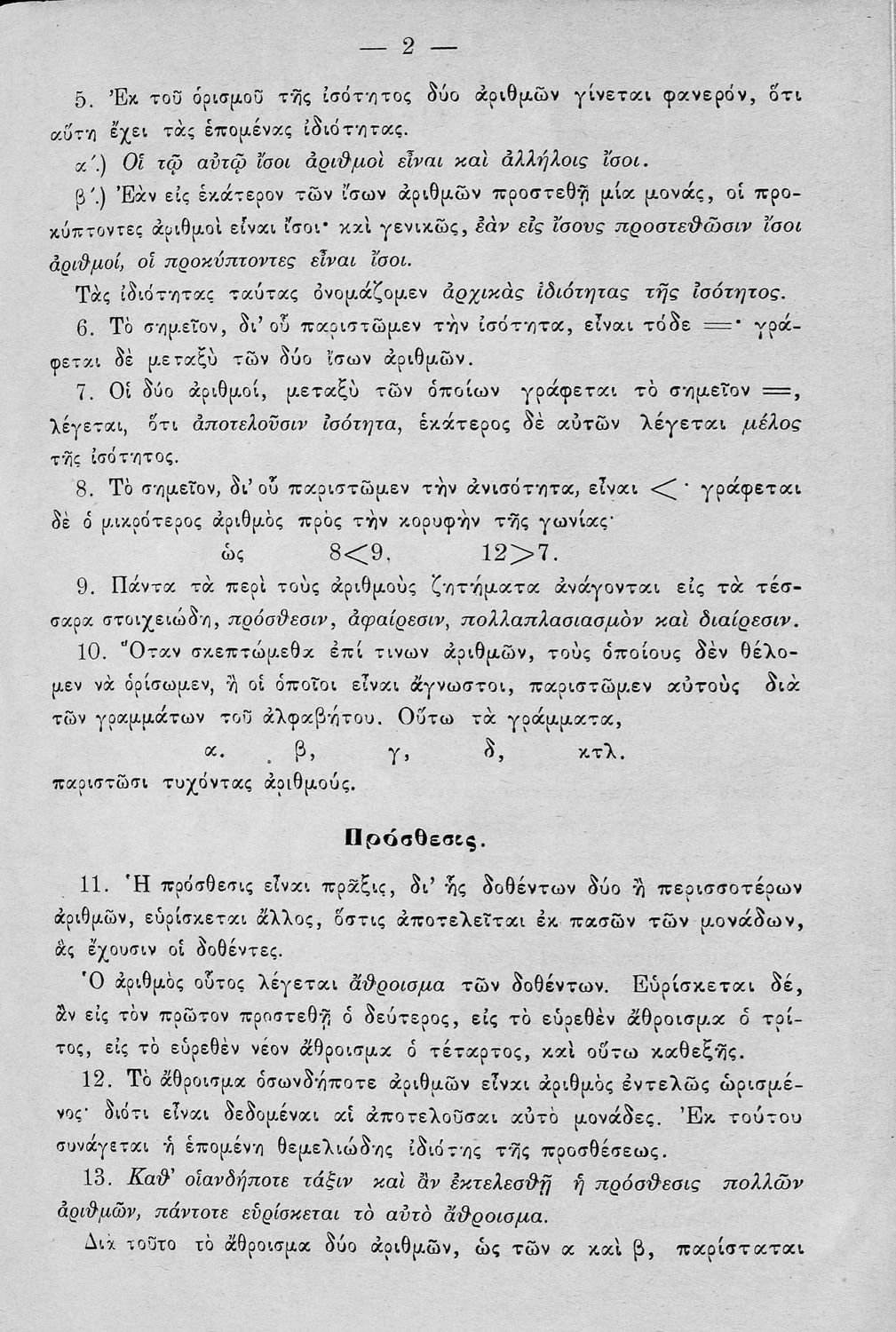 Βαθμίδα εκπαίδευσης: Δευτεροβάθμια Τάξη: Γυμνάσιο Μάθημα: Μαθηματικά Γλώσσα: Καθαρεύουσα Παρουσίαση περιεχομένου: Σχολικό εγχειρίδιο για τις τάξεις του Γυμνασίου για το μάθημα των Μαθηματικών και συγκεκριμένα της Άλγεβρας. Το εγχειρίδιο περιλαμβάνει εισαγωγικά γενικές πληροφορίες για τις 4 βασικές πράξεις συνεχίζει με τις αλγεβρικές παραστάσεις, εξισώσεις πρώτου και δευτέρου βαθμού, δυνάμεις και πολυώνυμα, πρόοδοι, λογάριθμοι, κ.α. |