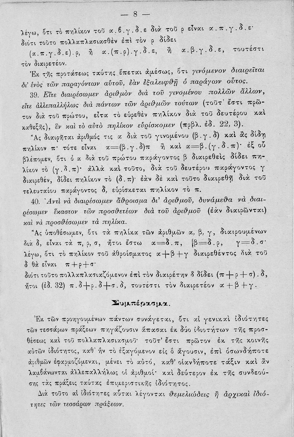 LDR 01500 2200205 4500 035 ## _a09-160622 040 ## _aΑκαδημία Αθηνών 041 ## _ael 100 ## _aΙωάννης Ν. Χατζιδάκις 110 ## _a160622 245 0# _aΣτοιχειώδης άλγεβρα η μόνη εγκριθείσα εν τοις γενομένοις διαγωνισμοίς προς χρήσιν των Γυμνασίων 250 ## _a9η Έκδοση 260 ## _aΑθήνα _bΠ. Δ. Σακελλαρίου _c1906 300 ## _a252 520 ## _aΣχολικό εγχειρίδιο για τις τάξεις του Γυμνασίου για το μάθημα των Μαθηματικών και συγκεκριμένα της Άλγεβρας. Το εγχειρίδιο περιλαμβάνει εισαγωγικά γενικές πληροφορίες για τις 4 βασικές πράξεις συνεχίζει με τις αλγεβρικές παραστάσεις, εξισώσεις πρώτου και δευτέρου βαθμού, δυνάμεις και πολυώνυμα, πρόοδοι, λογάριθμοι, κ.α. 521 ## _aΓυμνάσιο 522 ## _aΕλλάδα 546 ## _aΚαθαρεύουσα 563 ## _aΣκληρό Εξώφυλλο 650 #4 _aΆλγεβρα _aΓυμνασίου _aΔυνάμεις _aΕξισώσεις _aΚαθαρεύουσα _aΛογάριθμοι _aΜαθηματικά _aΠαραστάσεις _aΠολυώνυμα _aΠράξεις _aΡίζες