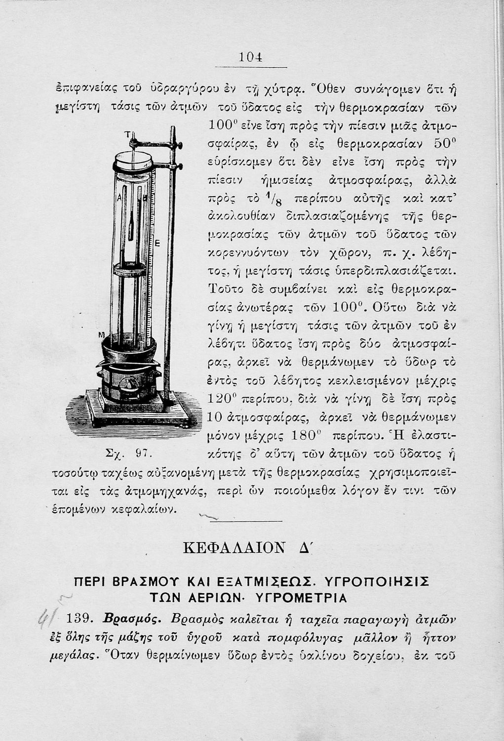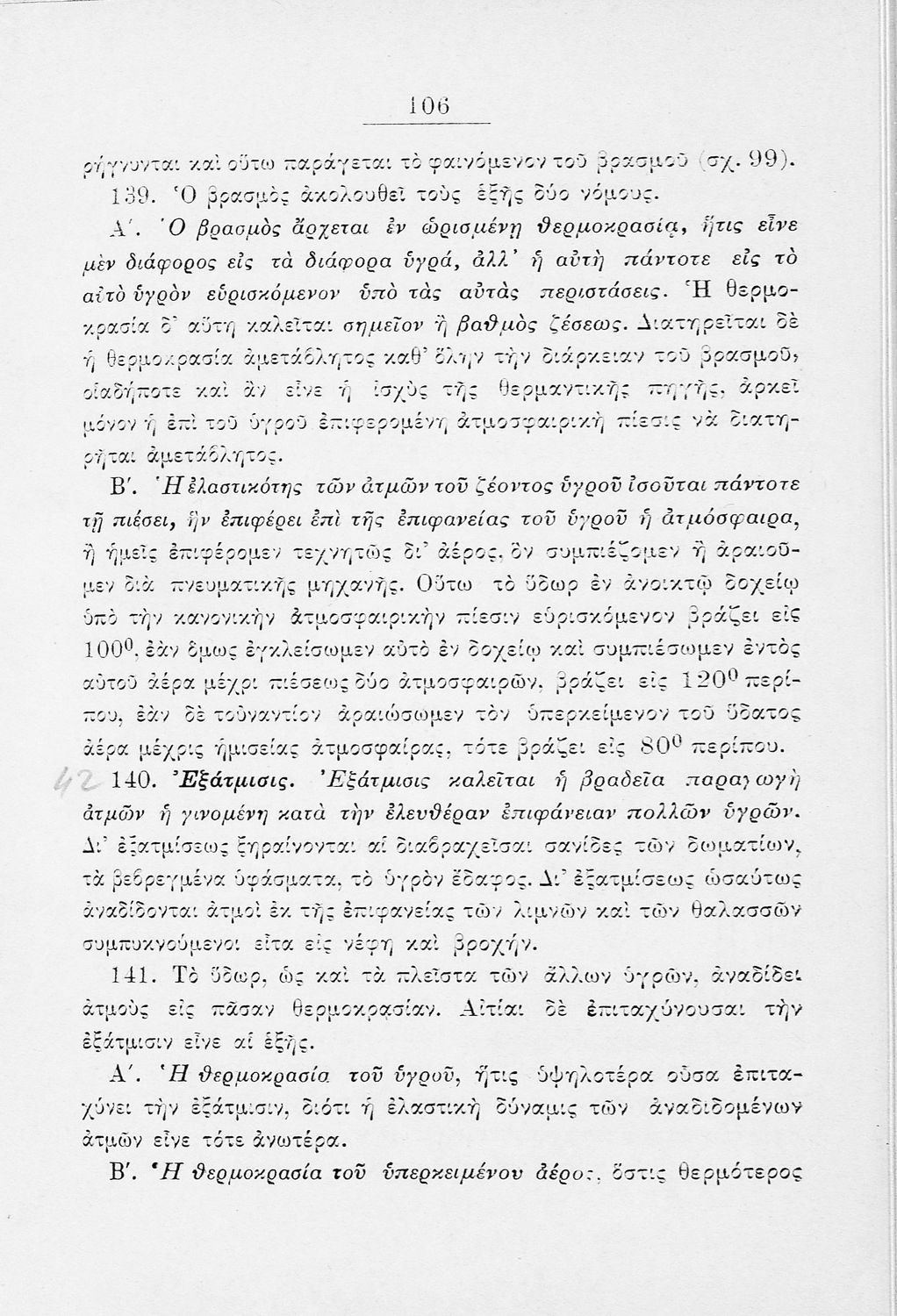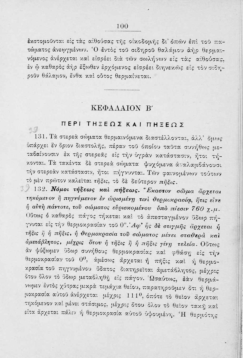 Σχολικό εγχειρίδιο για το μάθημα της Φυσικής. Το εγχειρίδιο περιλαμβάνει εισαγωγικά τις γενικές ιδιότητες των φυσικών σωμάτων και τις στοιχειώδεις γνώσεις της μηχανικής. Ο κύριος κορμός του βιβλίου αποτελείται από τις θεματικές της βαρύτητας, της υδροστατικής αρχής, της ατμοσφαιρικής πίεσης, της θερμότητας, της ακουστικής, της οπτικής, του μαγνητισμού, του ηλεκτρισμού, του στατικού και του δυναμικού ηλεκτρισμού.