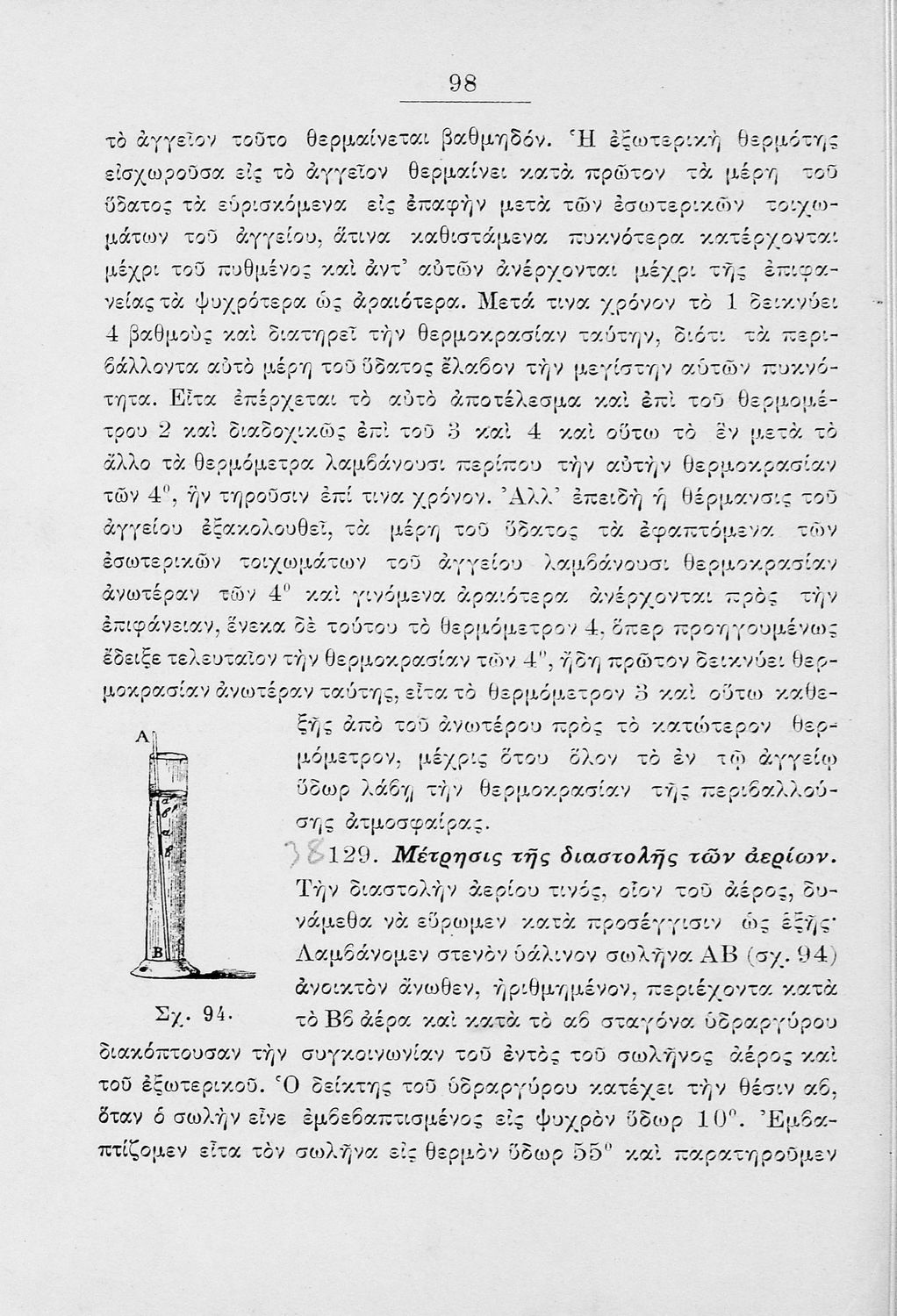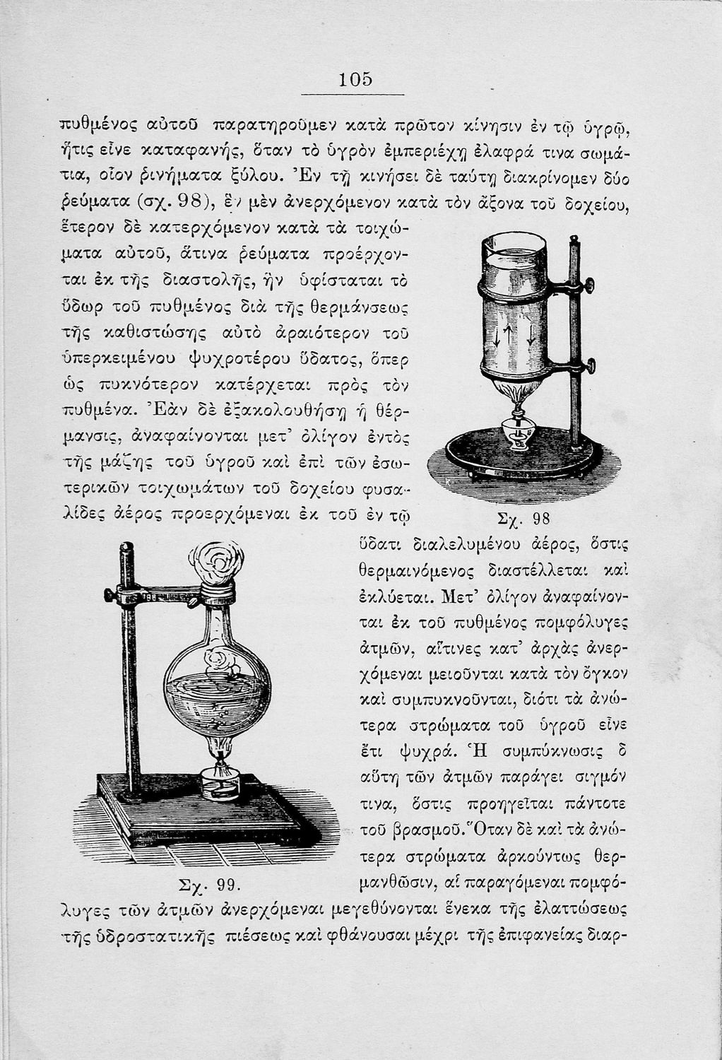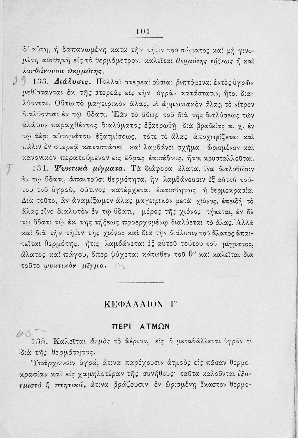 Σχολικό εγχειρίδιο για το μάθημα της Φυσικής. Το εγχειρίδιο περιλαμβάνει εισαγωγικά τις γενικές ιδιότητες των φυσικών σωμάτων και τις στοιχειώδεις γνώσεις της μηχανικής. Ο κύριος κορμός του βιβλίου αποτελείται από τις θεματικές της βαρύτητας, της υδροστατικής αρχής, της ατμοσφαιρικής πίεσης, της θερμότητας, της ακουστικής, της οπτικής, του μαγνητισμού, του ηλεκτρισμού, του στατικού και του δυναμικού ηλεκτρισμού.