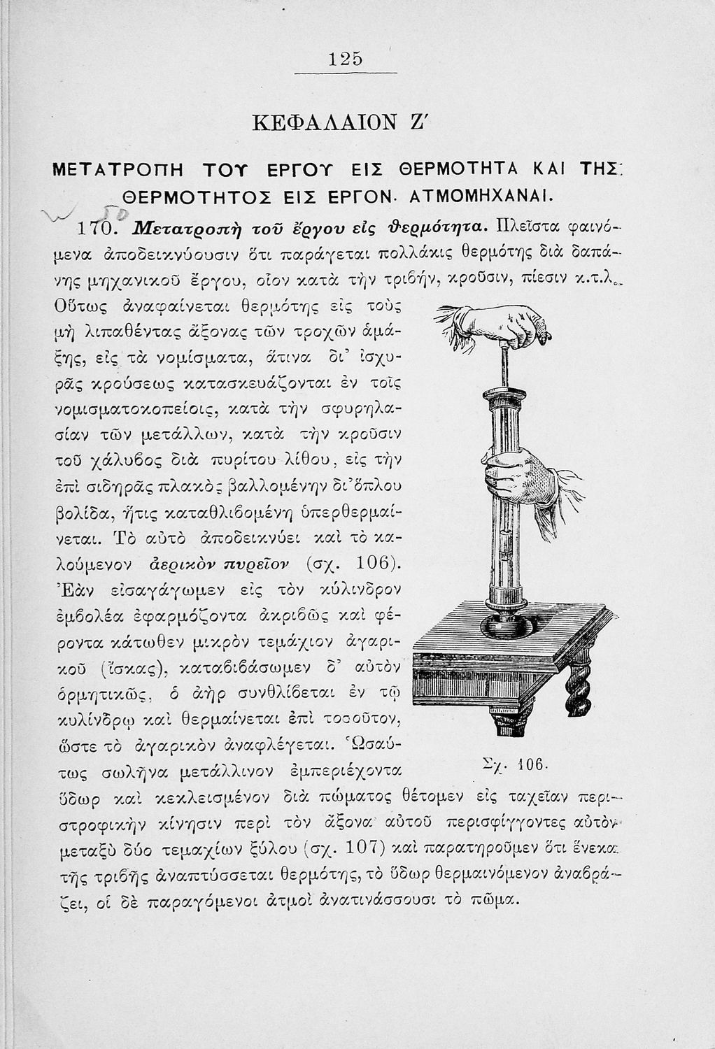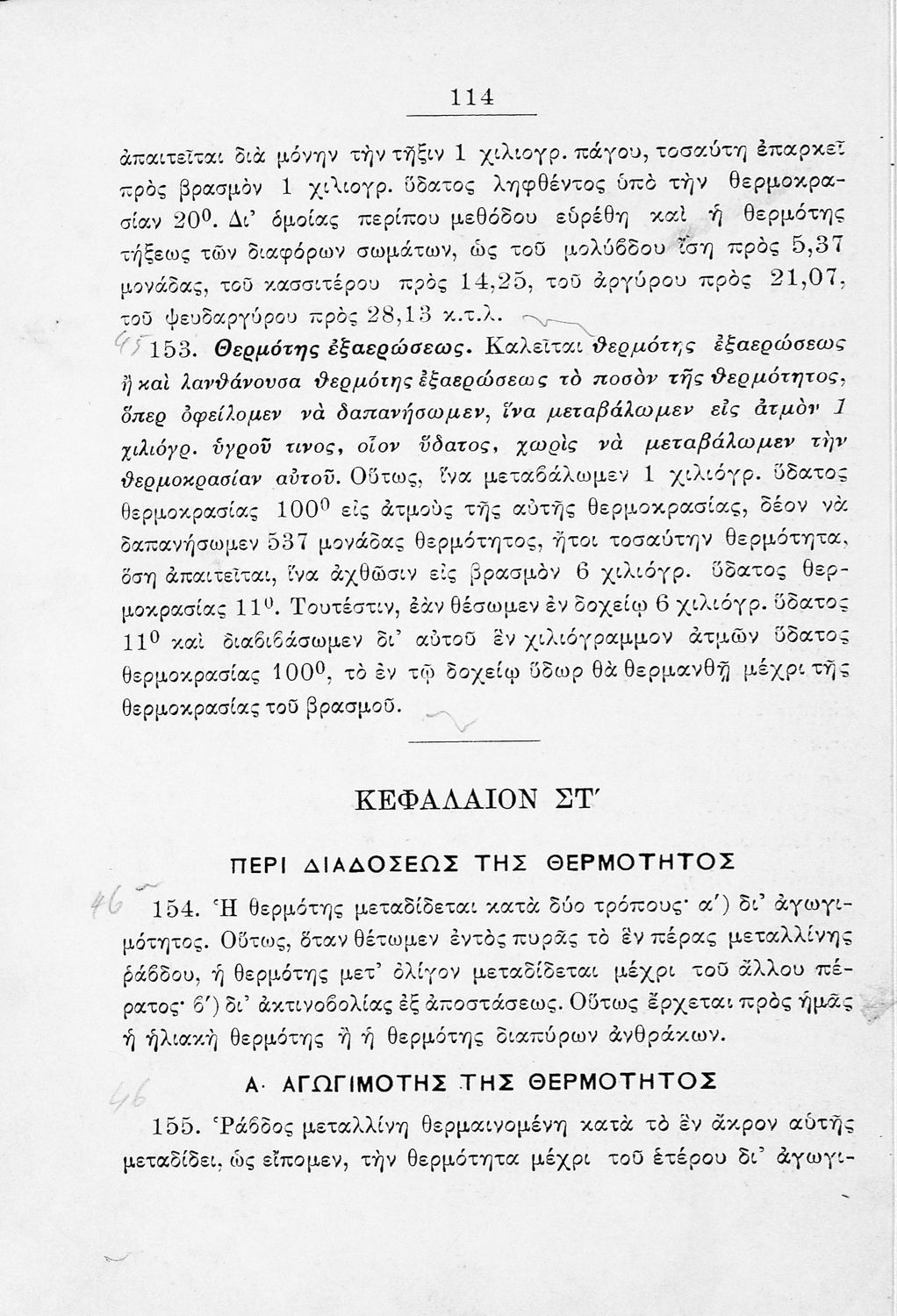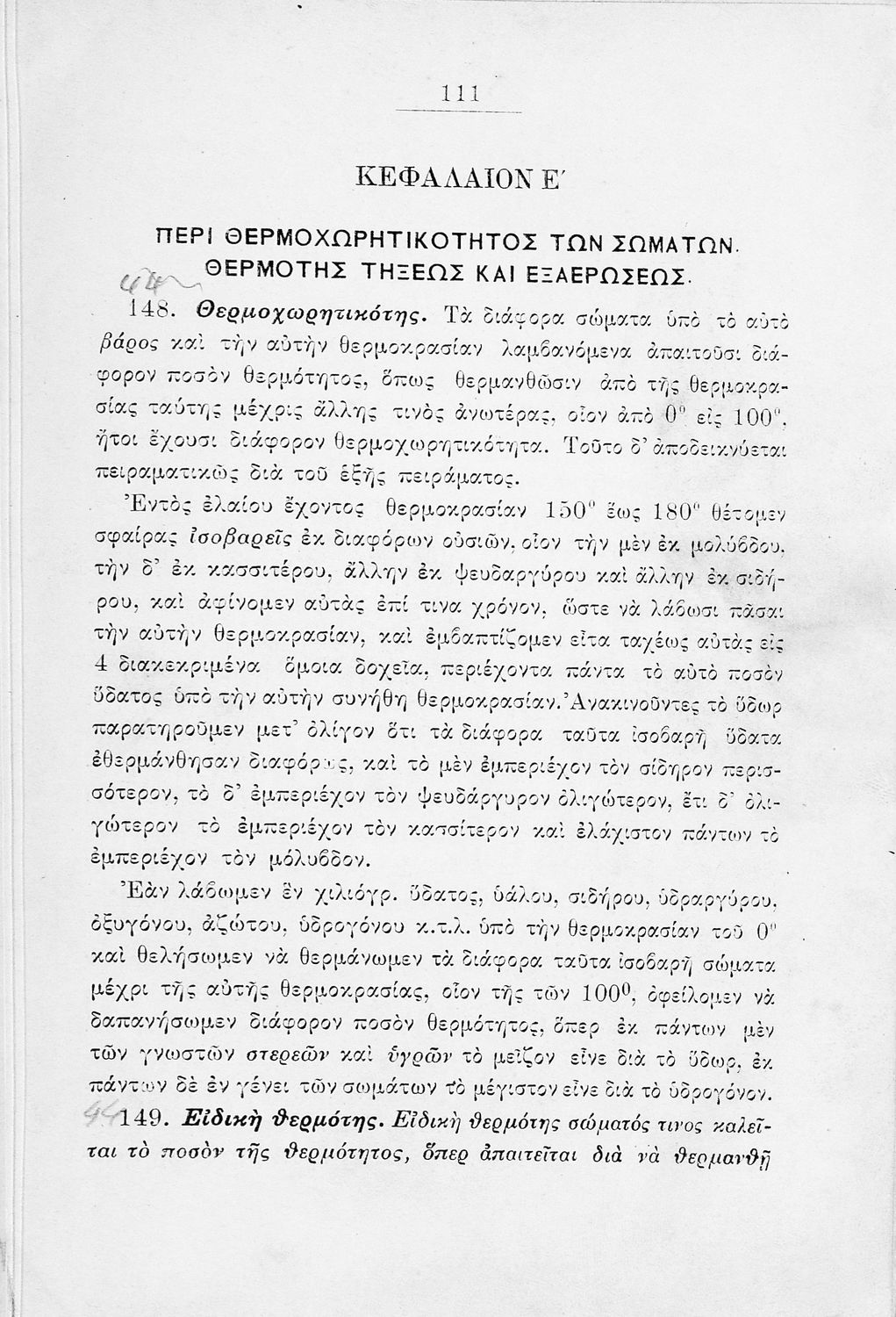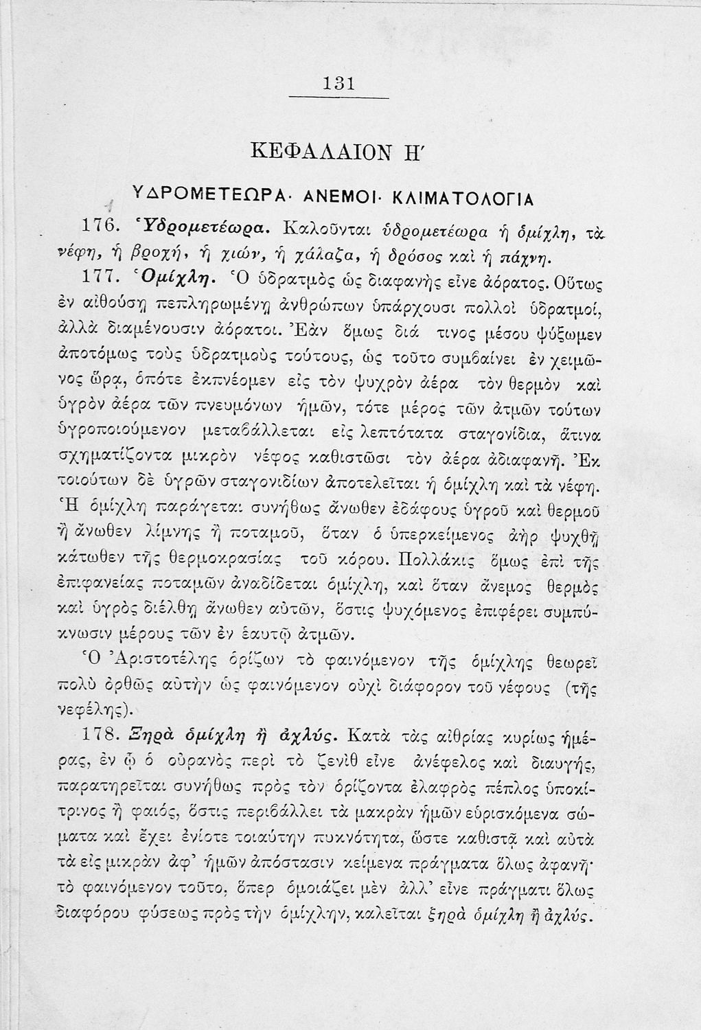 Σχολικό εγχειρίδιο για το μάθημα της Φυσικής. Το εγχειρίδιο περιλαμβάνει εισαγωγικά τις γενικές ιδιότητες των φυσικών σωμάτων και τις στοιχειώδεις γνώσεις της μηχανικής. Ο κύριος κορμός του βιβλίου αποτελείται από τις θεματικές της βαρύτητας, της υδροστατικής αρχής, της ατμοσφαιρικής πίεσης, της θερμότητας, της ακουστικής, της οπτικής, του μαγνητισμού, του ηλεκτρισμού, του στατικού και του δυναμικού ηλεκτρισμού.