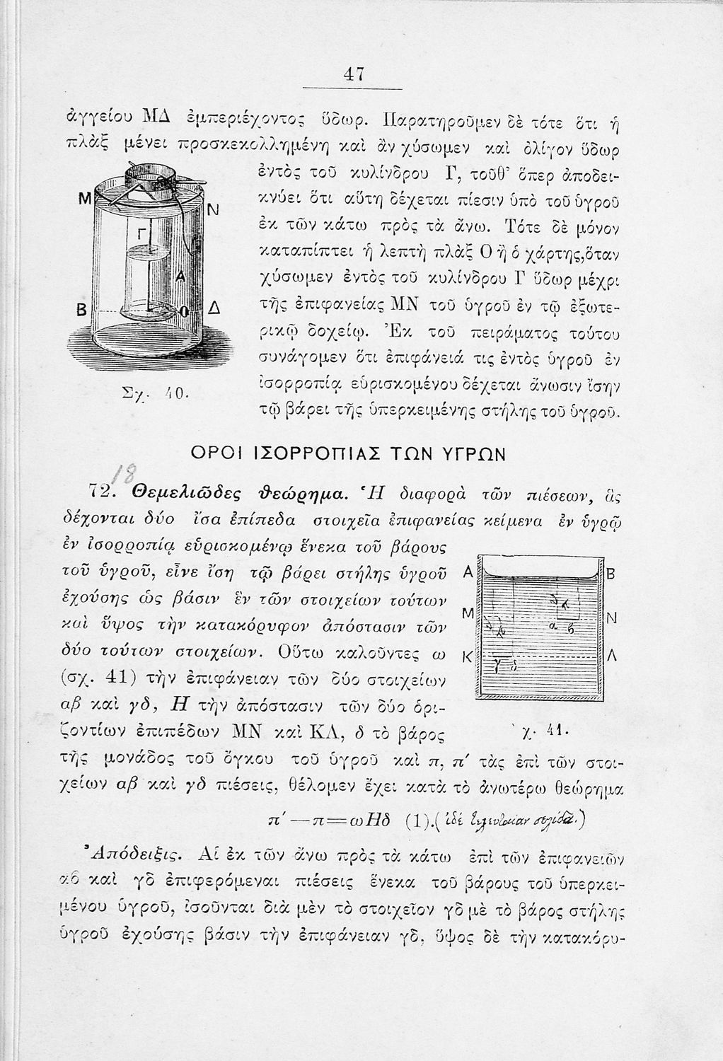 Σχολικό εγχειρίδιο για το μάθημα της Φυσικής. Το εγχειρίδιο περιλαμβάνει εισαγωγικά τις γενικές ιδιότητες των φυσικών σωμάτων και τις στοιχειώδεις γνώσεις της μηχανικής. Ο κύριος κορμός του βιβλίου αποτελείται από τις θεματικές της βαρύτητας, της υδροστατικής αρχής, της ατμοσφαιρικής πίεσης, της θερμότητας, της ακουστικής, της οπτικής, του μαγνητισμού, του ηλεκτρισμού, του στατικού και του δυναμικού ηλεκτρισμού.