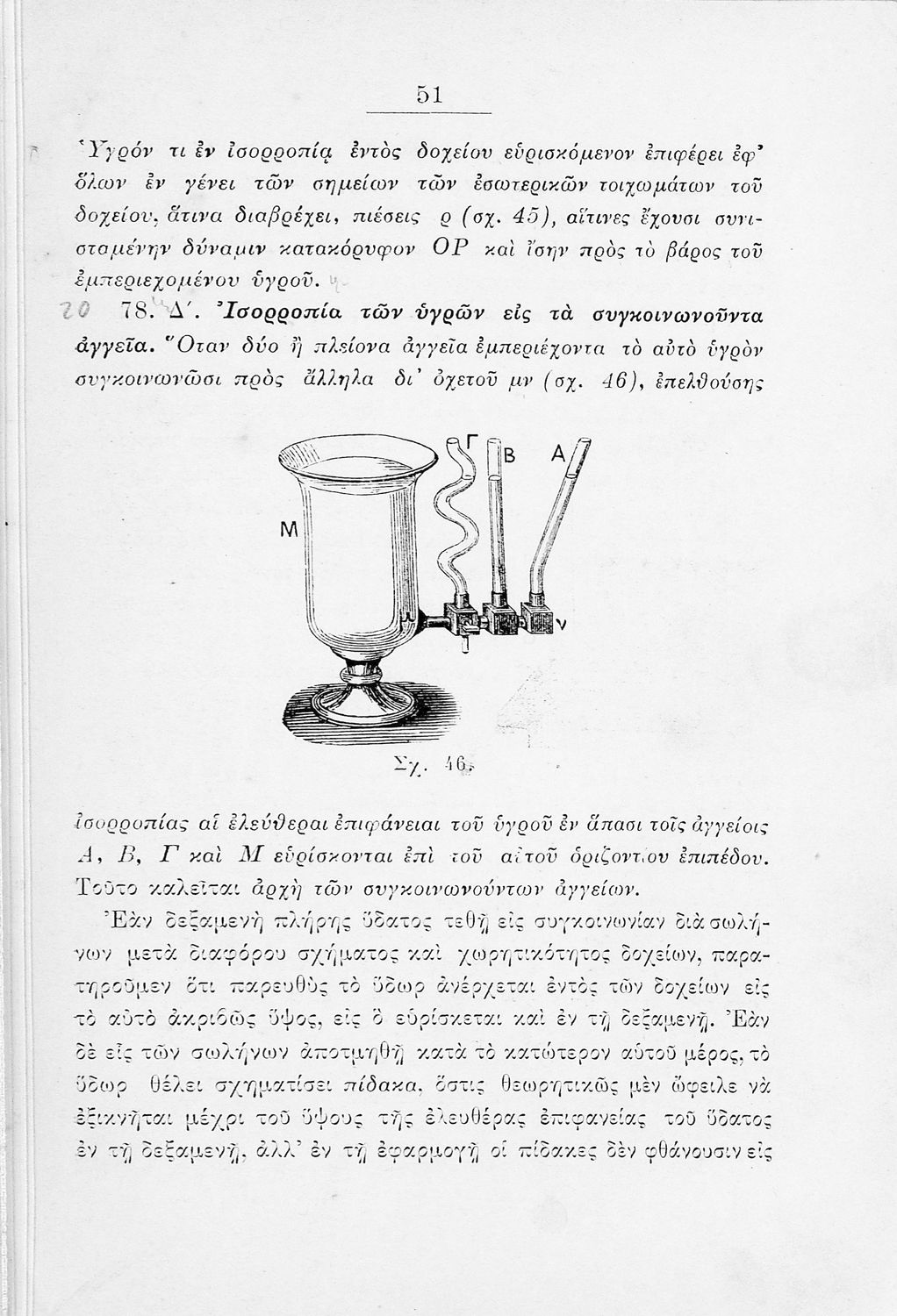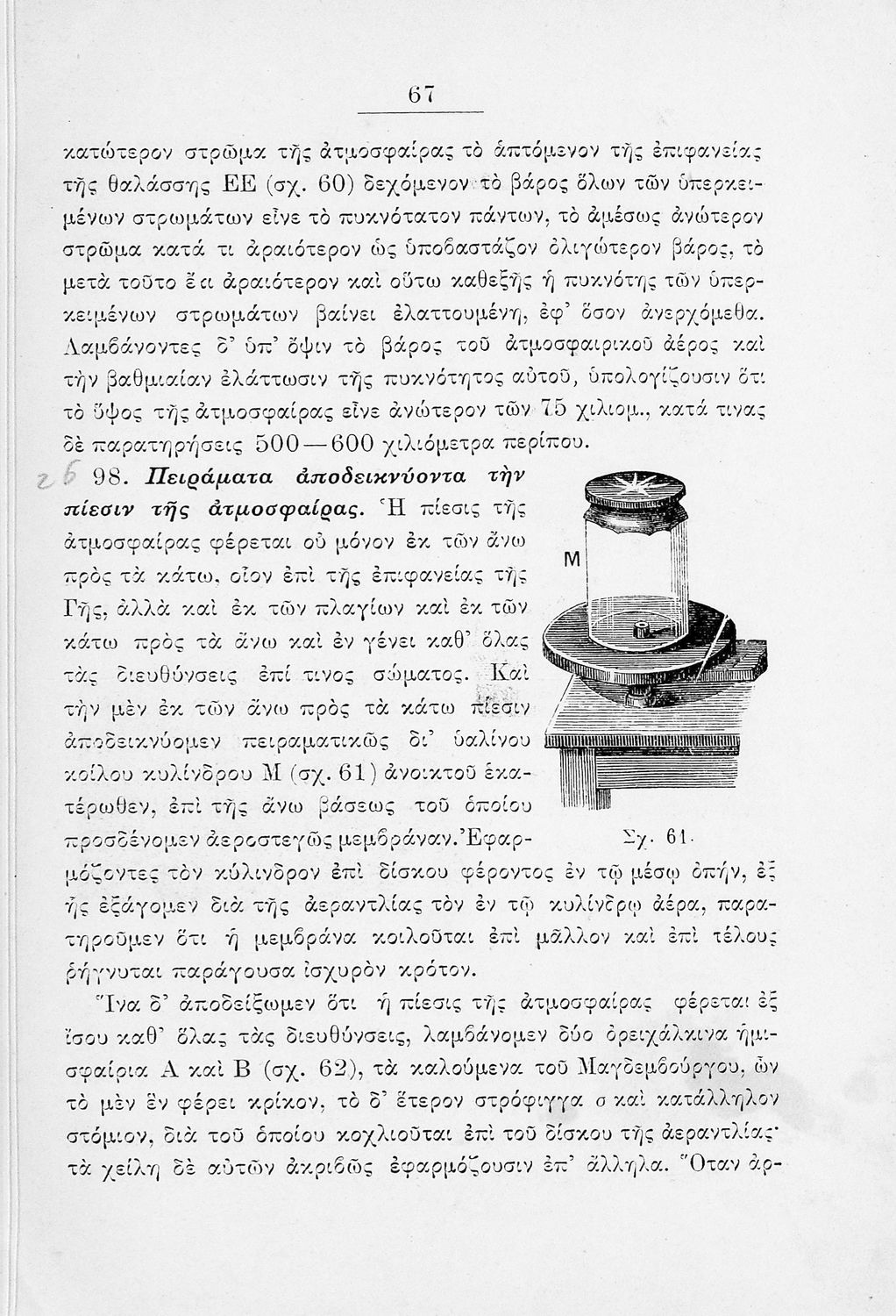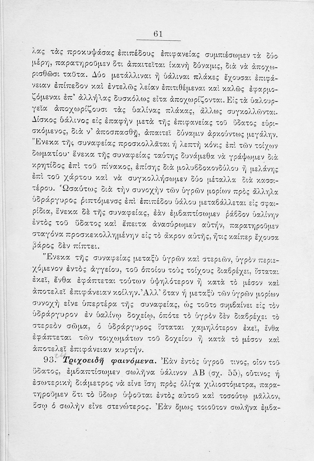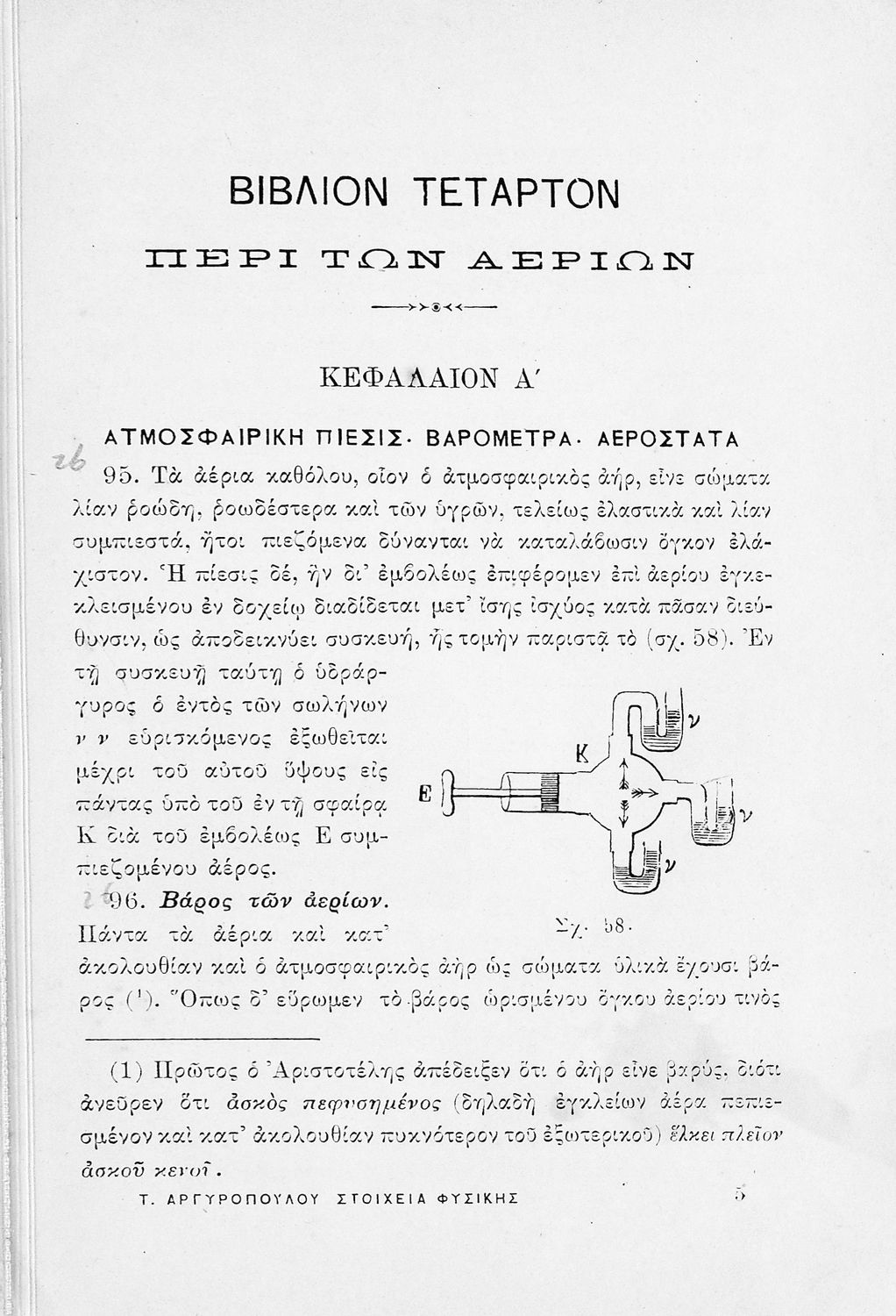 Σχολικό εγχειρίδιο για το μάθημα της Φυσικής. Το εγχειρίδιο περιλαμβάνει εισαγωγικά τις γενικές ιδιότητες των φυσικών σωμάτων και τις στοιχειώδεις γνώσεις της μηχανικής. Ο κύριος κορμός του βιβλίου αποτελείται από τις θεματικές της βαρύτητας, της υδροστατικής αρχής, της ατμοσφαιρικής πίεσης, της θερμότητας, της ακουστικής, της οπτικής, του μαγνητισμού, του ηλεκτρισμού, του στατικού και του δυναμικού ηλεκτρισμού.