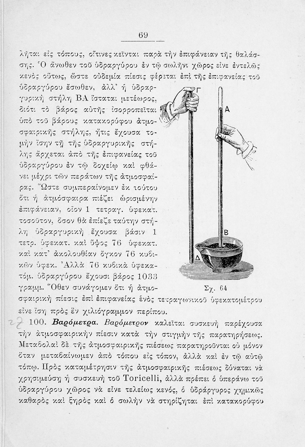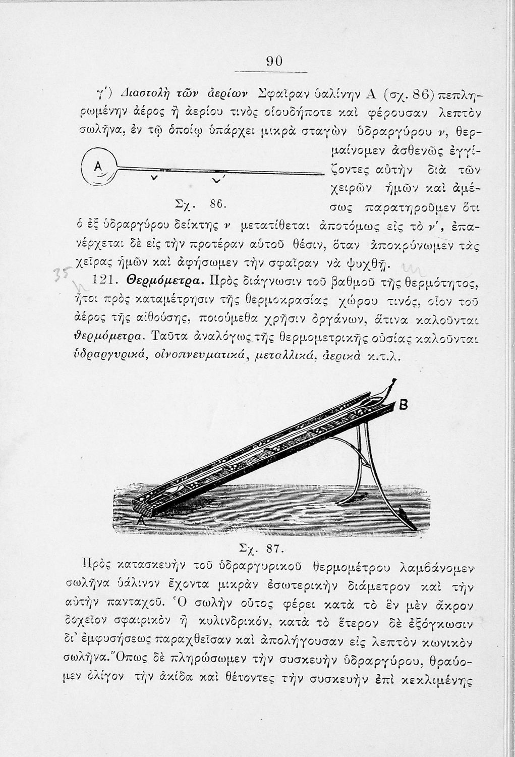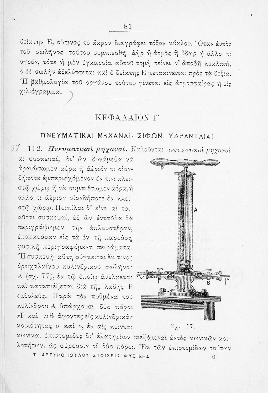 Σχολικό εγχειρίδιο για το μάθημα της Φυσικής. Το εγχειρίδιο περιλαμβάνει εισαγωγικά τις γενικές ιδιότητες των φυσικών σωμάτων και τις στοιχειώδεις γνώσεις της μηχανικής. Ο κύριος κορμός του βιβλίου αποτελείται από τις θεματικές της βαρύτητας, της υδροστατικής αρχής, της ατμοσφαιρικής πίεσης, της θερμότητας, της ακουστικής, της οπτικής, του μαγνητισμού, του ηλεκτρισμού, του στατικού και του δυναμικού ηλεκτρισμού.