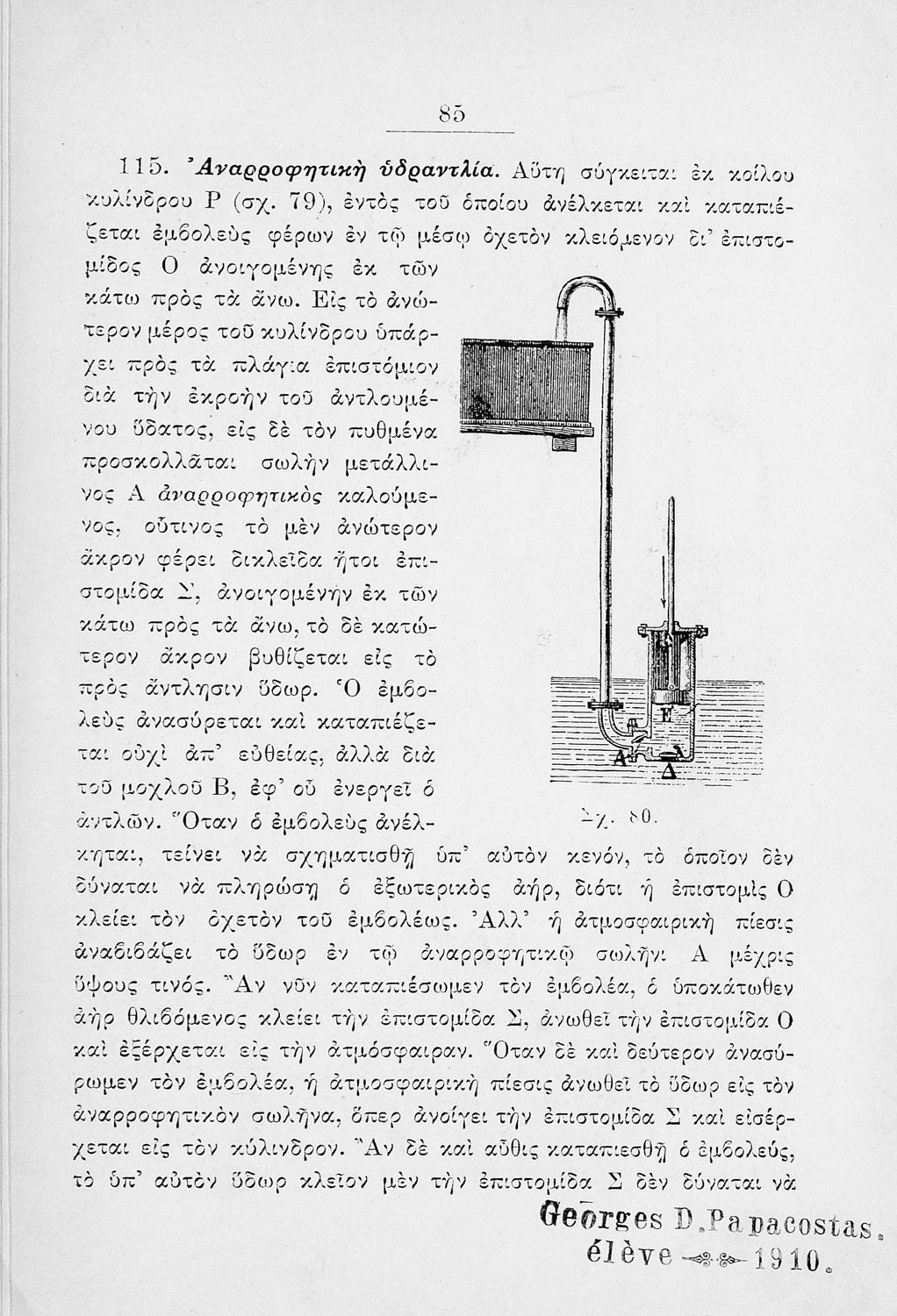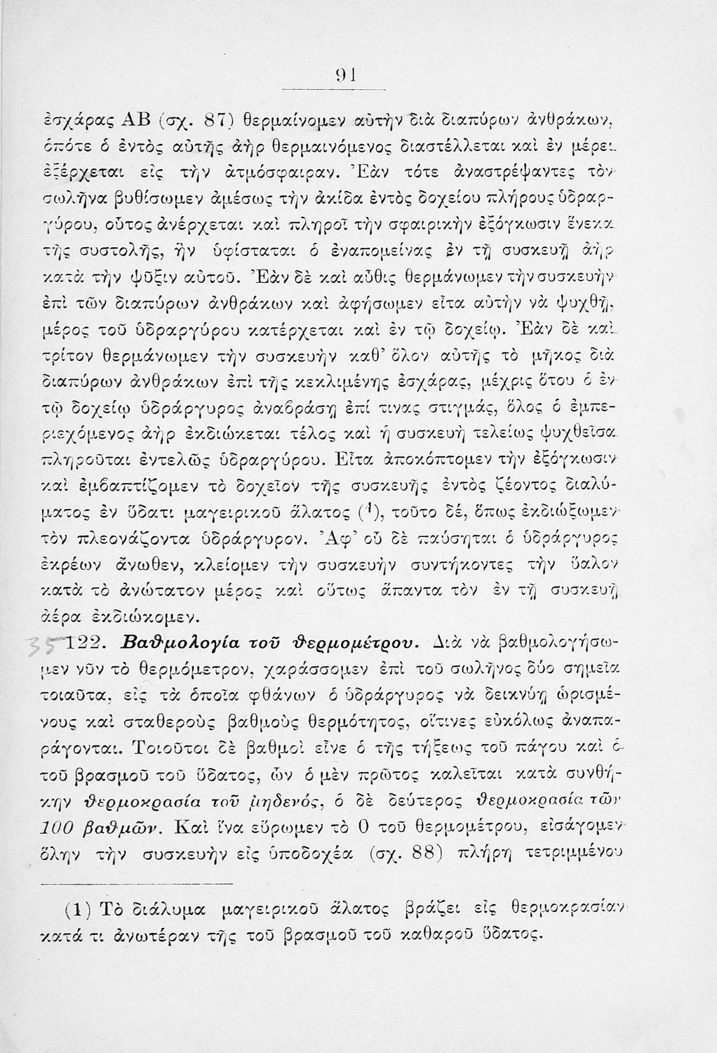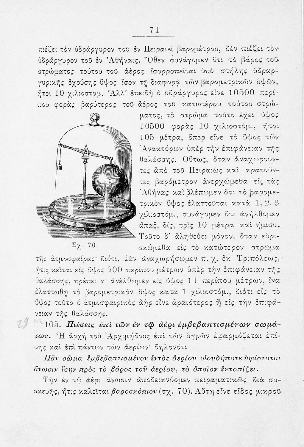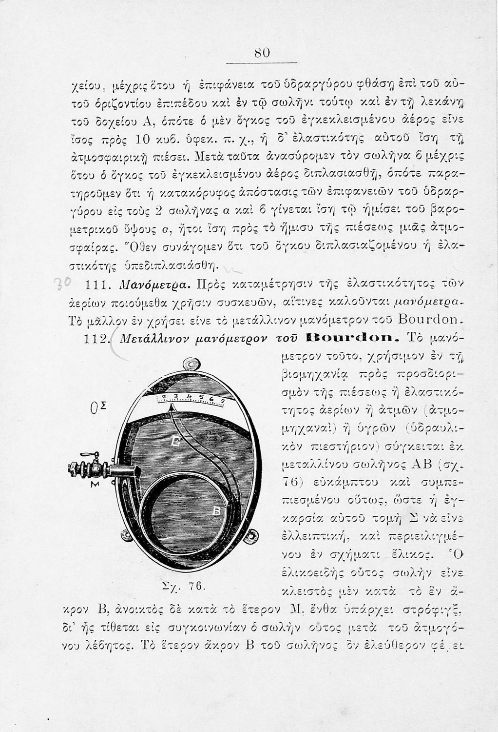 Σχολικό εγχειρίδιο για το μάθημα της Φυσικής. Το εγχειρίδιο περιλαμβάνει εισαγωγικά τις γενικές ιδιότητες των φυσικών σωμάτων και τις στοιχειώδεις γνώσεις της μηχανικής. Ο κύριος κορμός του βιβλίου αποτελείται από τις θεματικές της βαρύτητας, της υδροστατικής αρχής, της ατμοσφαιρικής πίεσης, της θερμότητας, της ακουστικής, της οπτικής, του μαγνητισμού, του ηλεκτρισμού, του στατικού και του δυναμικού ηλεκτρισμού.