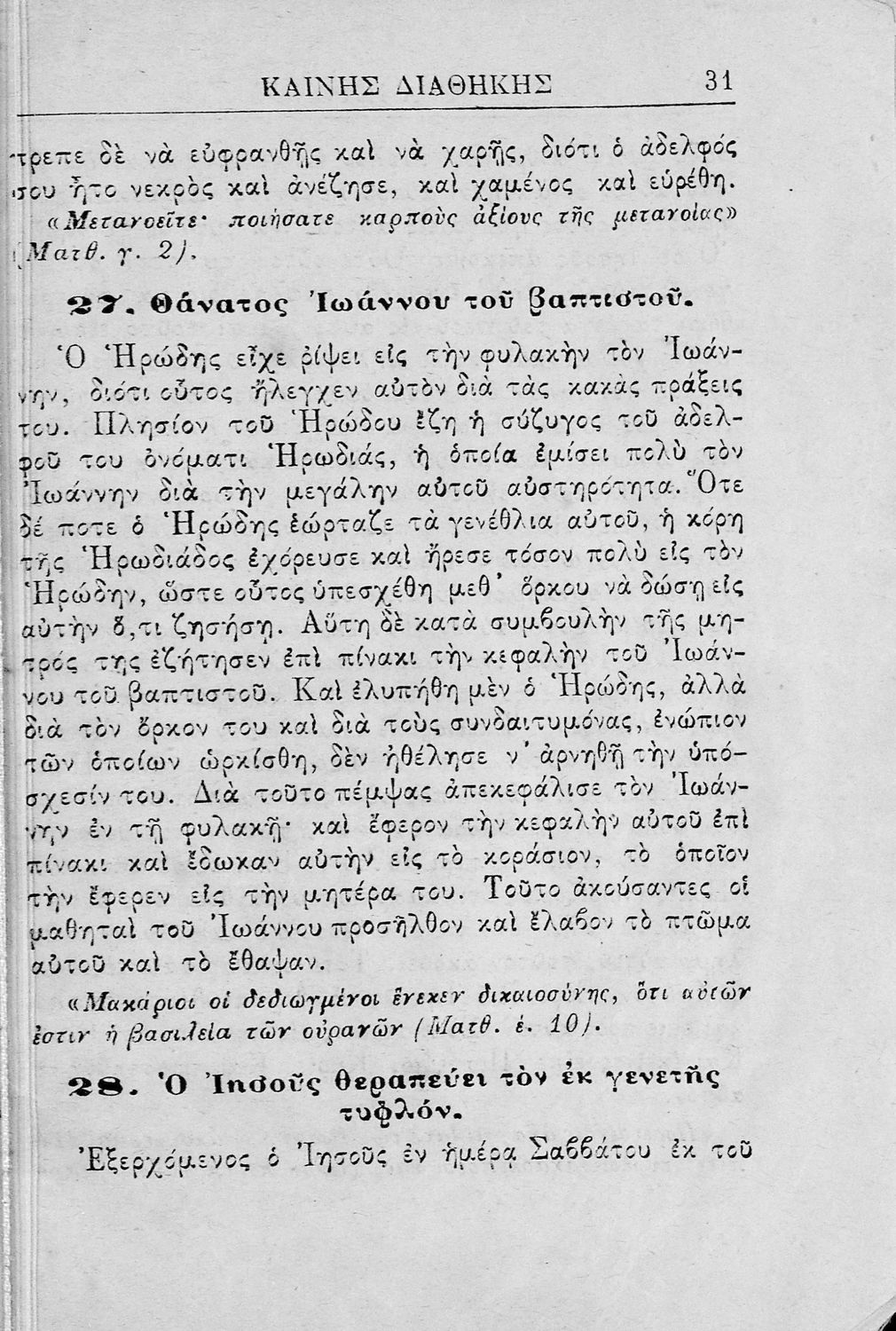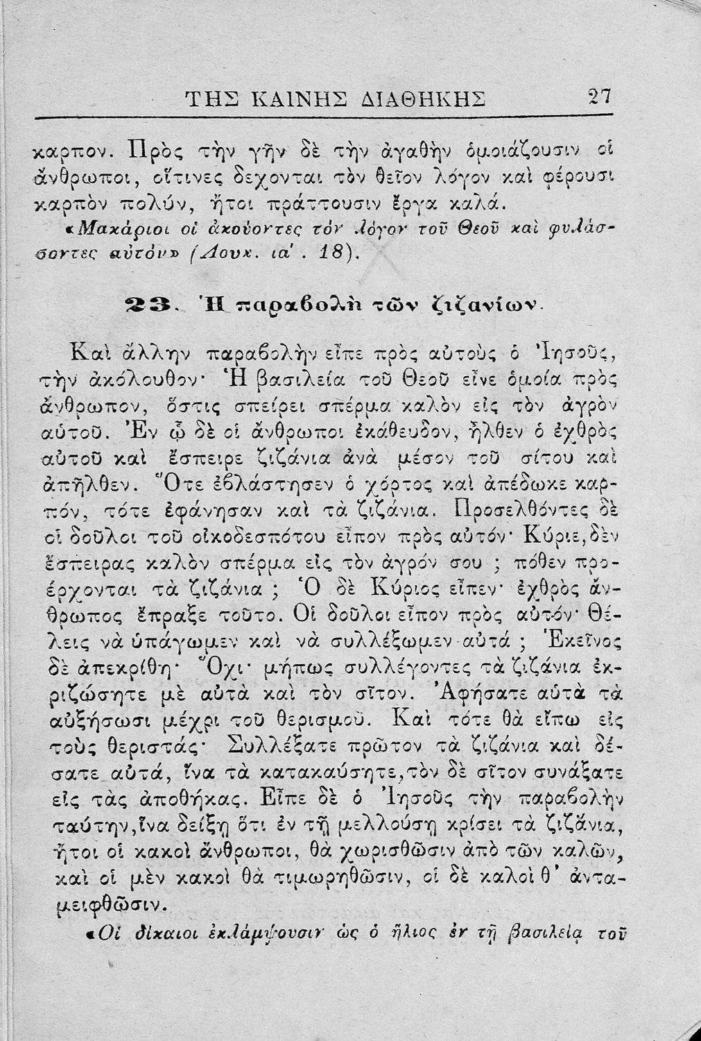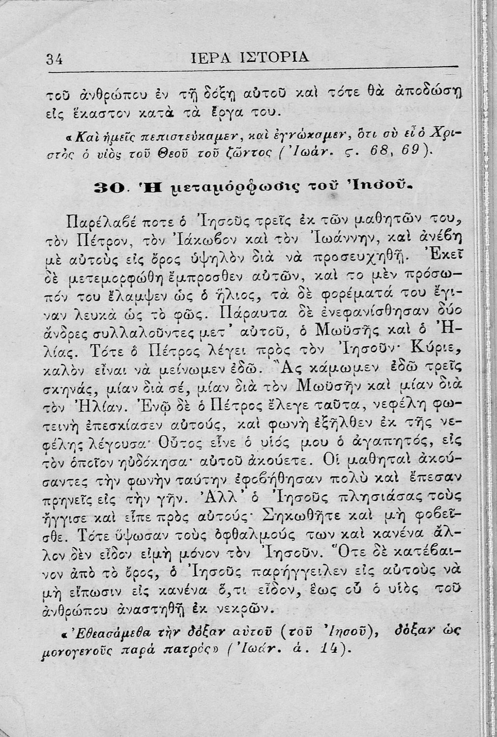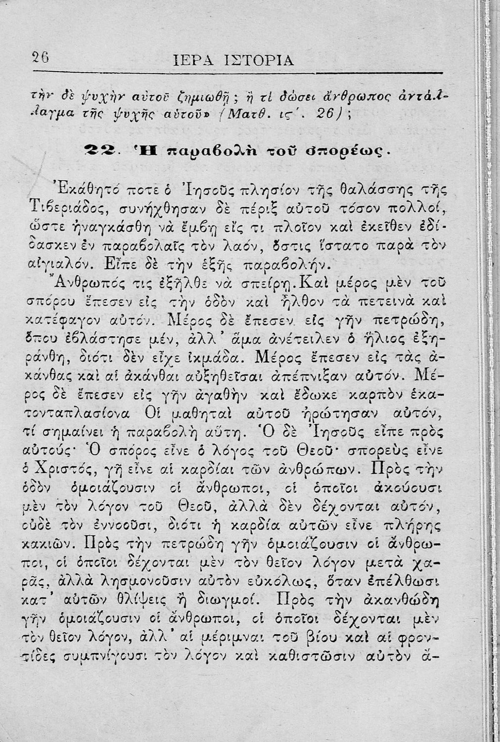 Σχολικό εγχειρίδιο Θρησκευτικών για τα Ελληνικά σχολεία και Παρθεναγωγεία που συνιστά μία εξιστόρηση της Καινής Διαθήκης από τη γέννηση της Θεοτόκου ως την ανάληψη του Χριστού και τη δράση των Αποστόλων.