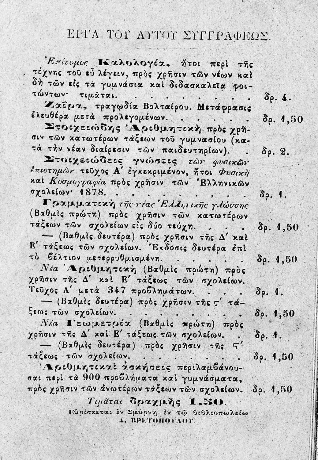 Σχολικό εγχειρίδιο Γεωγραφίας για τα Ελληνικά Σχολεία, τα Γυμνάσια, τα Διδασκαλεία, τα Παρθεναγωγεία και τις Εμπορικές-Στρατιωτικές-Ναυτικές Σχολές που περιέχει εισαγωγή στην κοσμογραφία, τη μαθηματική, ...