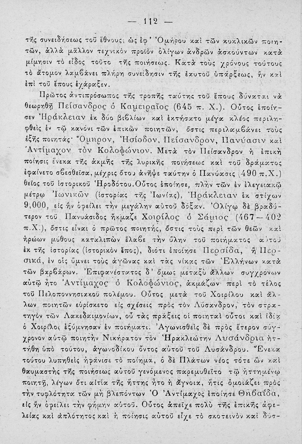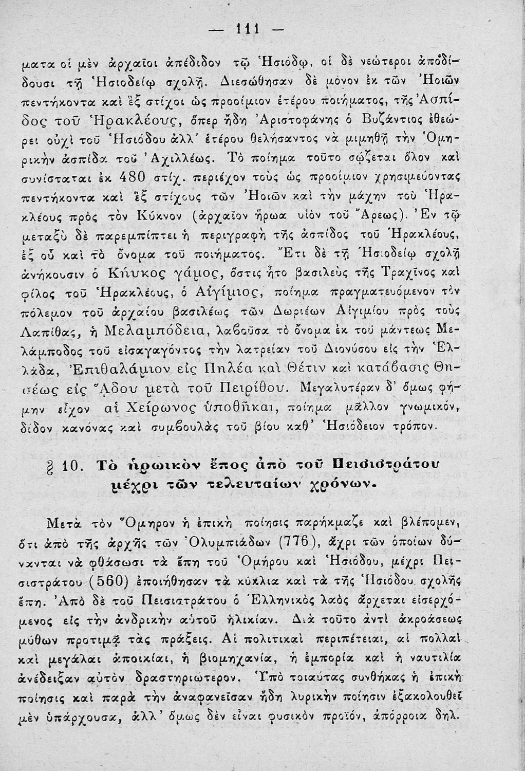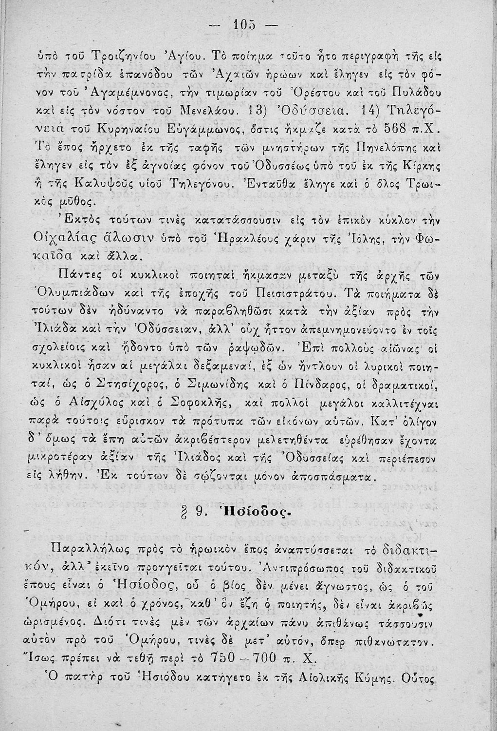 Σχολικό εγχειρίδιο για τις τάξεις του Παρθεναγωγείου και του Γυμνασίου για το μάθημα των Αρχαίων Ελληνικών. Το εγχειρίδιο περιλαμβάνει συνοπτικά την ελληνική γραμματολογία και την εργογραφία του Ηρόδοτου, του Θουκυδίδη, των λογογράφων της Ιωνίας, του Ξενοφώντα, των Αττικών ρητόρων, του Ησίοδου, του Ομήρου, του Σοφοκλή, της Αριστοτελικής, της Ελεατικής φιλοσοφίας κ.α.