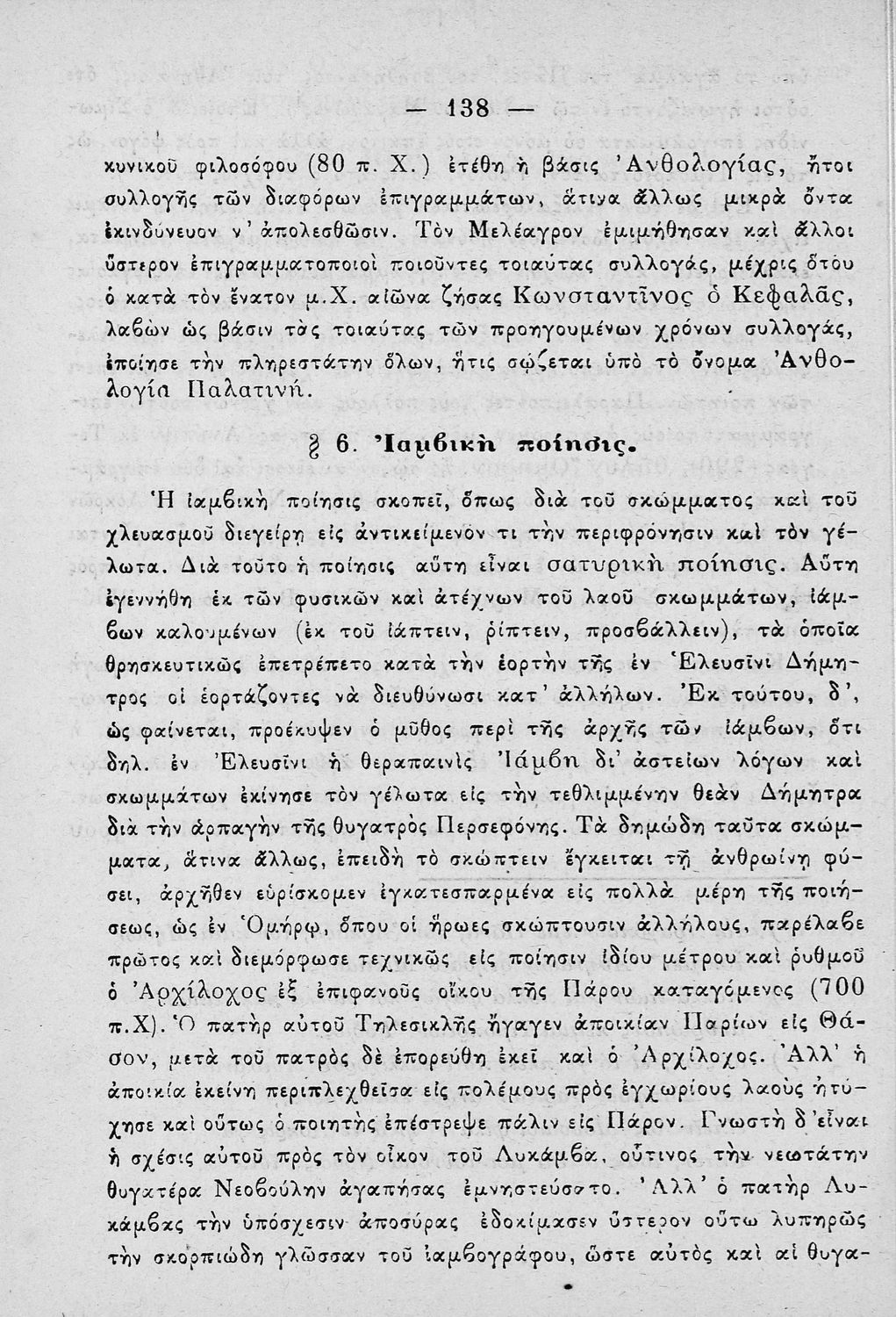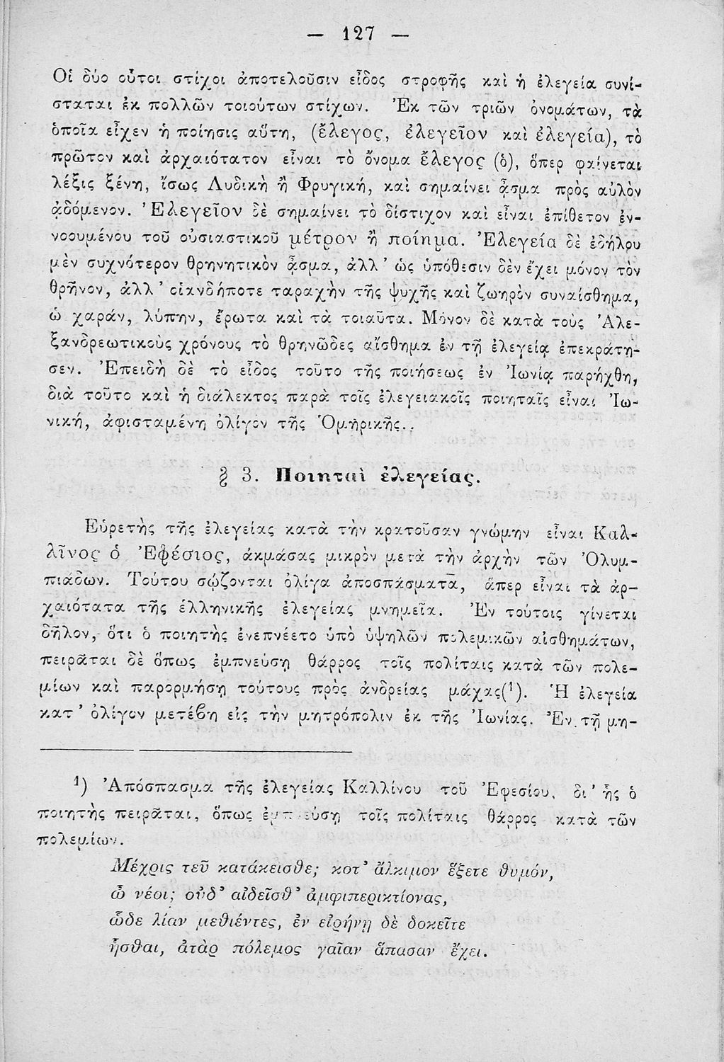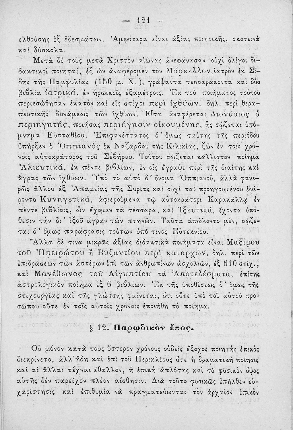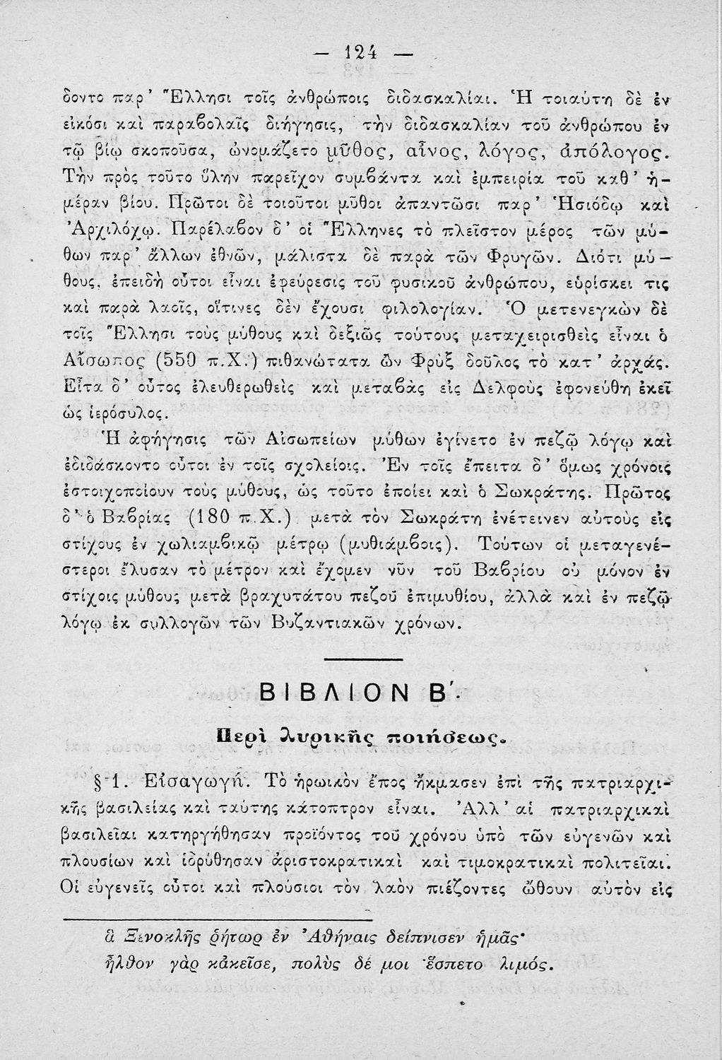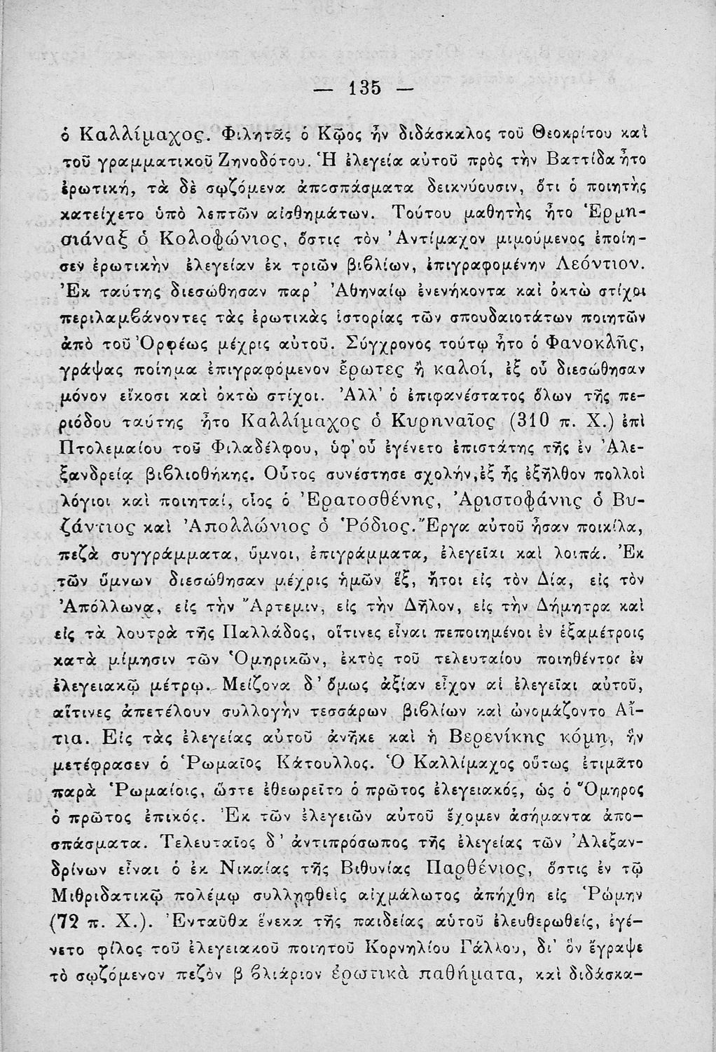 Σχολικό εγχειρίδιο για τις τάξεις του Παρθεναγωγείου και του Γυμνασίου για το μάθημα των Αρχαίων Ελληνικών. Το εγχειρίδιο περιλαμβάνει συνοπτικά την ελληνική γραμματολογία και την εργογραφία του Ηρόδοτου, του Θουκυδίδη, των λογογράφων της Ιωνίας, του Ξενοφώντα, των Αττικών ρητόρων, του Ησίοδου, του Ομήρου, του Σοφοκλή, της Αριστοτελικής, της Ελεατικής φιλοσοφίας κ.α.