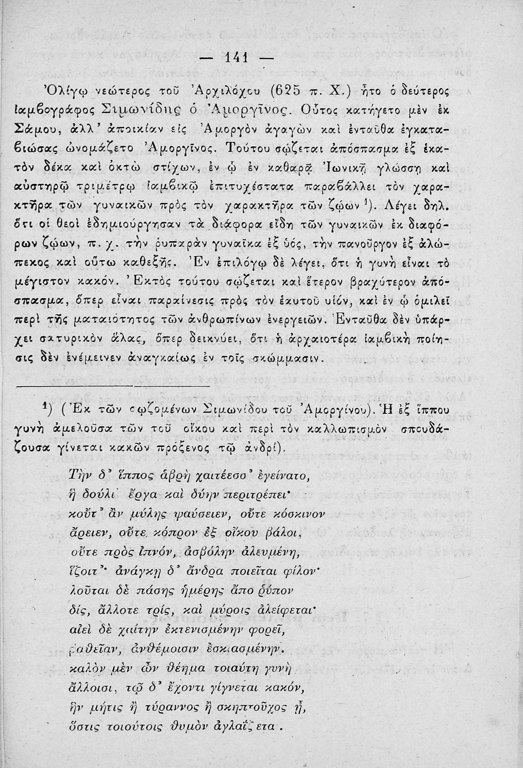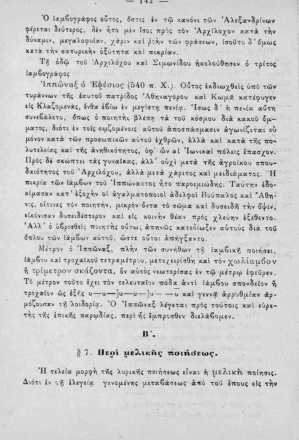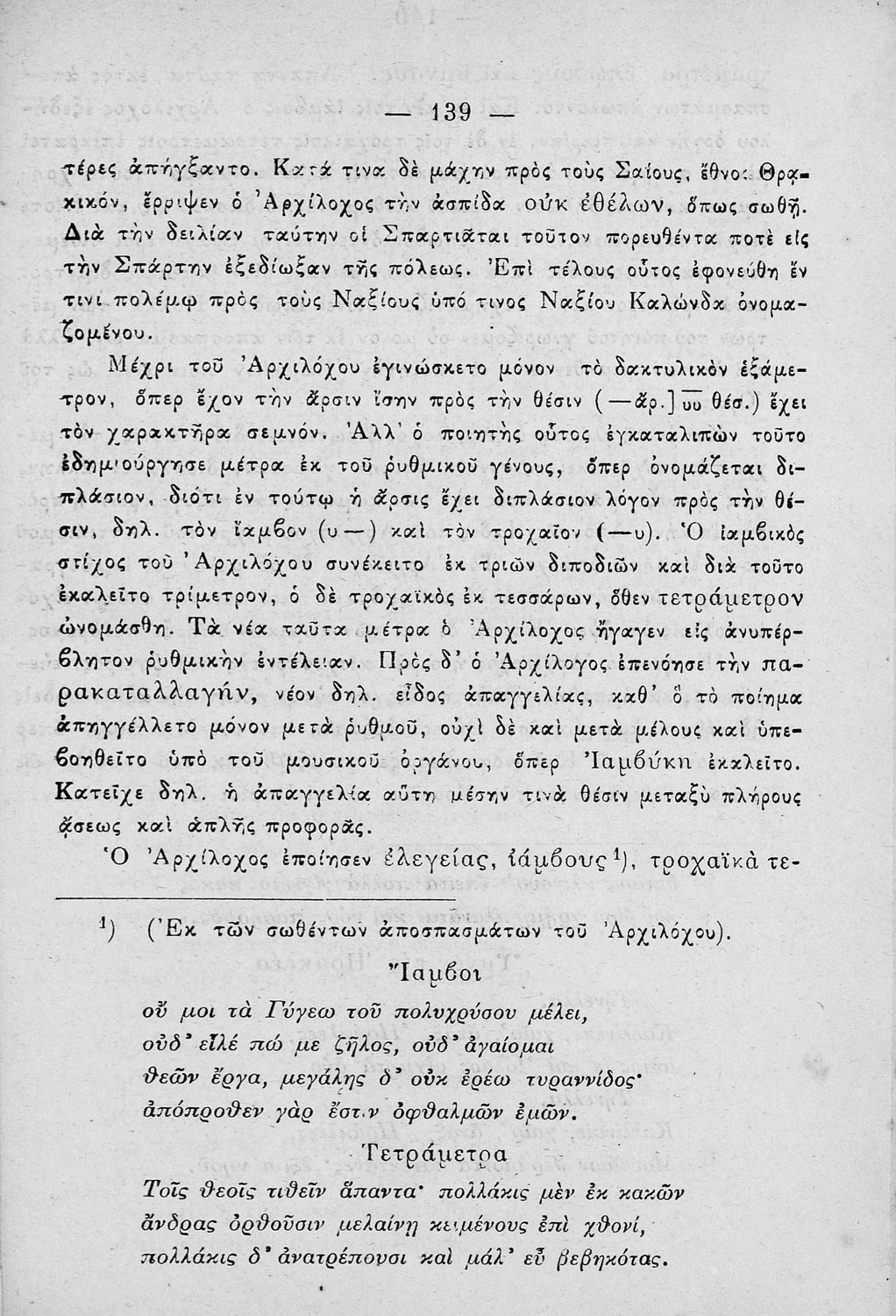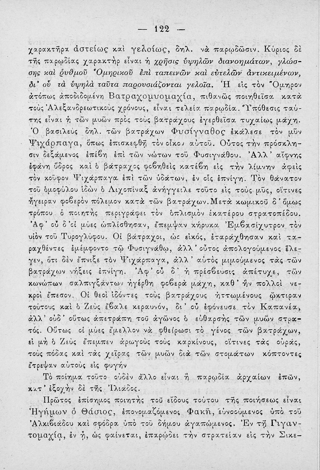Σχολικό εγχειρίδιο για τις τάξεις του Παρθεναγωγείου και του Γυμνασίου για το μάθημα των Αρχαίων Ελληνικών. Το εγχειρίδιο περιλαμβάνει συνοπτικά την ελληνική γραμματολογία και την εργογραφία του Ηρόδοτου, του Θουκυδίδη, των λογογράφων της Ιωνίας, του Ξενοφώντα, των Αττικών ρητόρων, του Ησίοδου, του Ομήρου, του Σοφοκλή, της Αριστοτελικής, της Ελεατικής φιλοσοφίας κ.α.