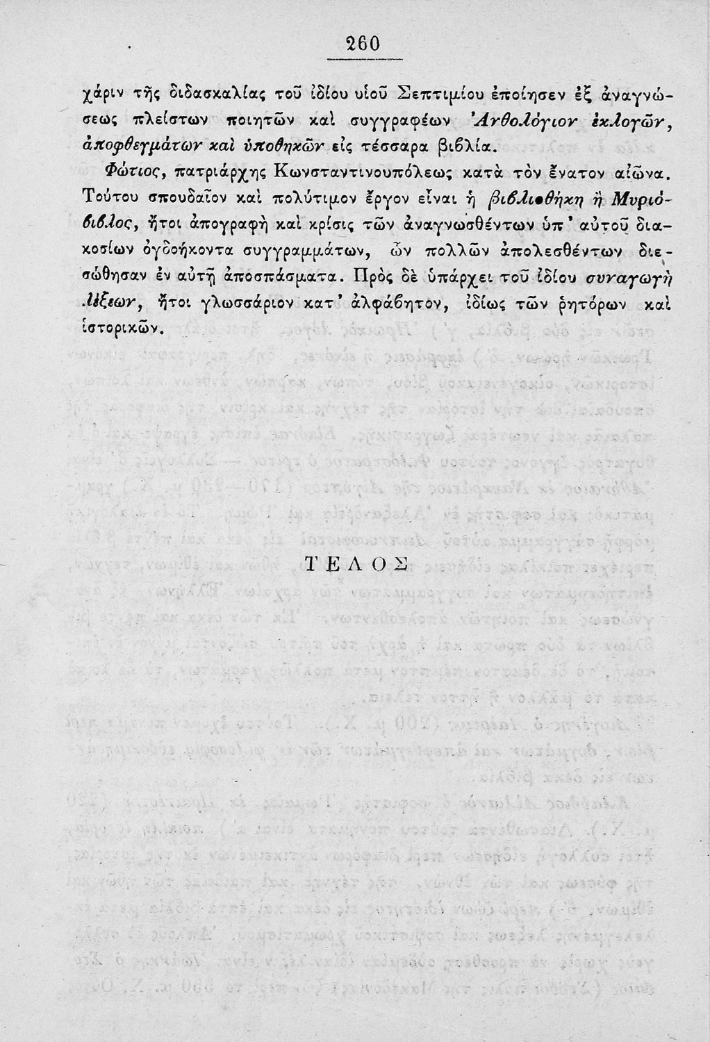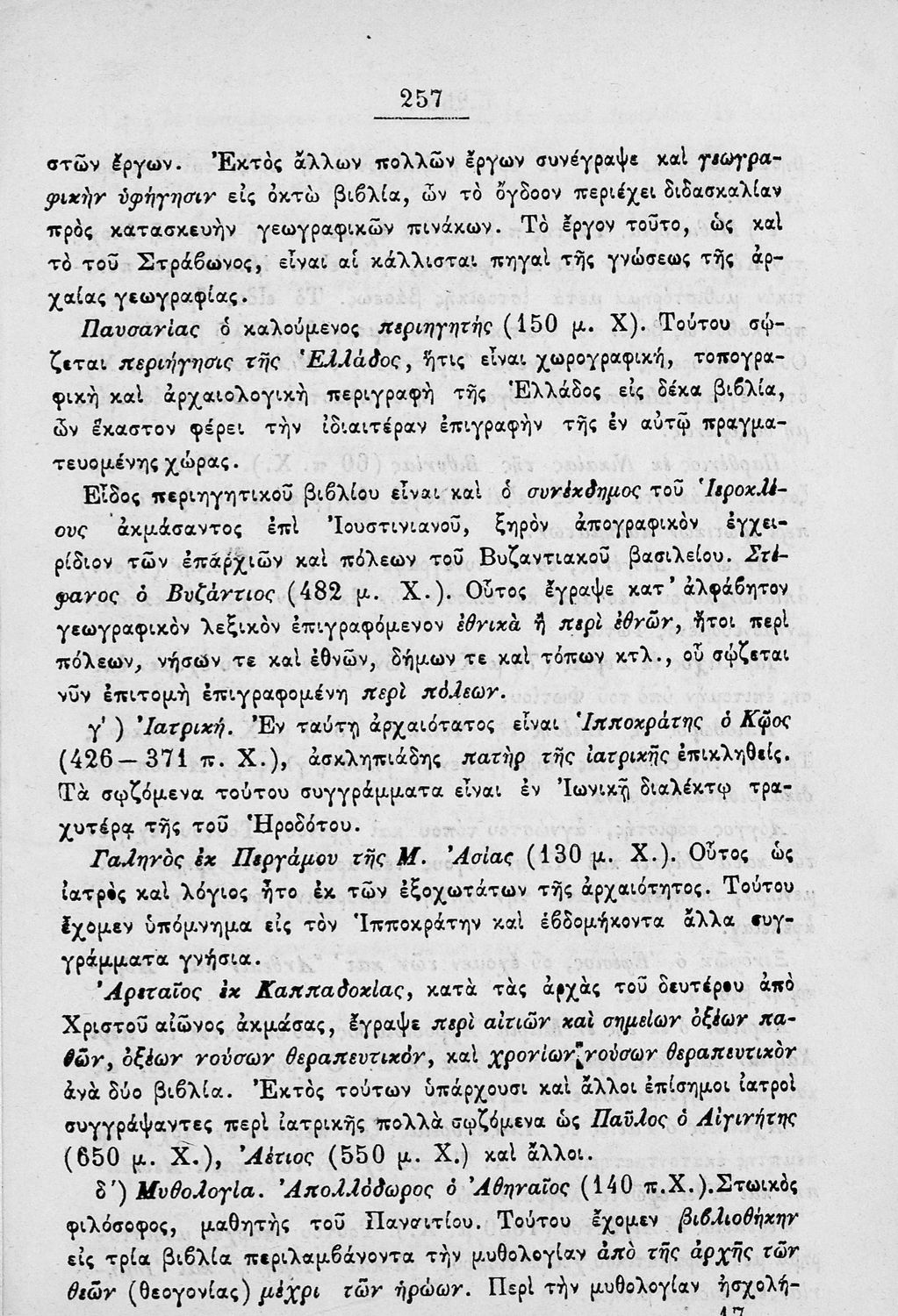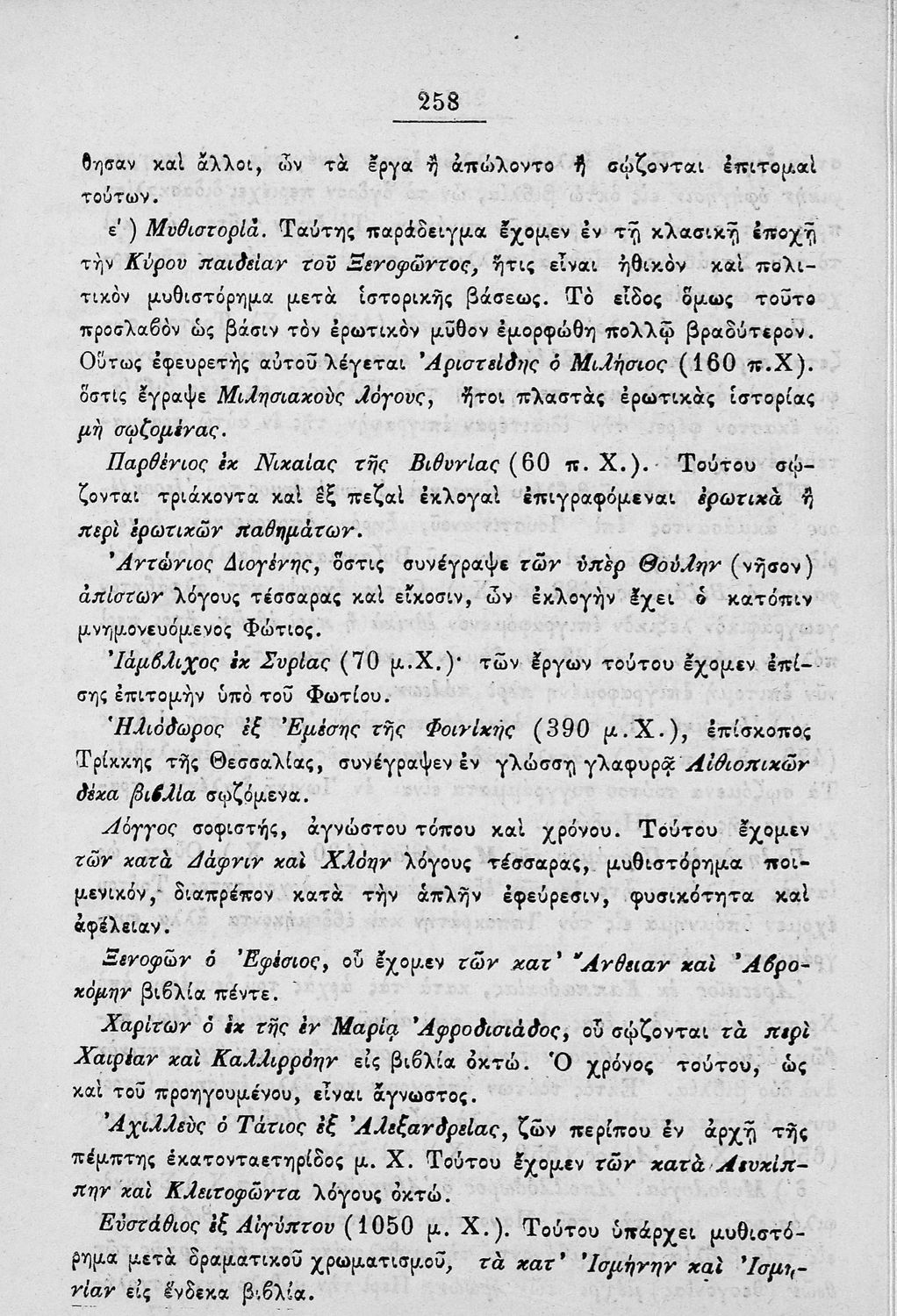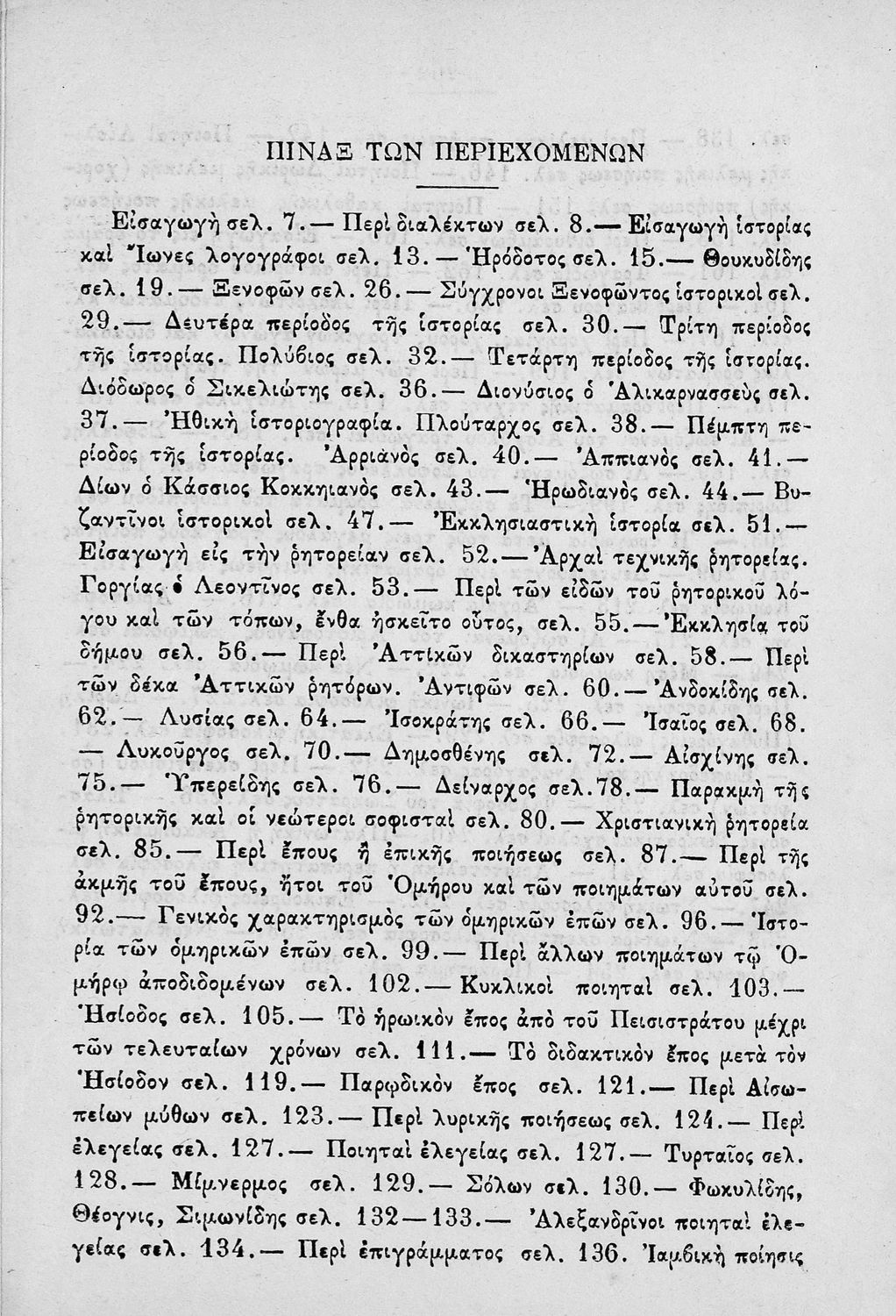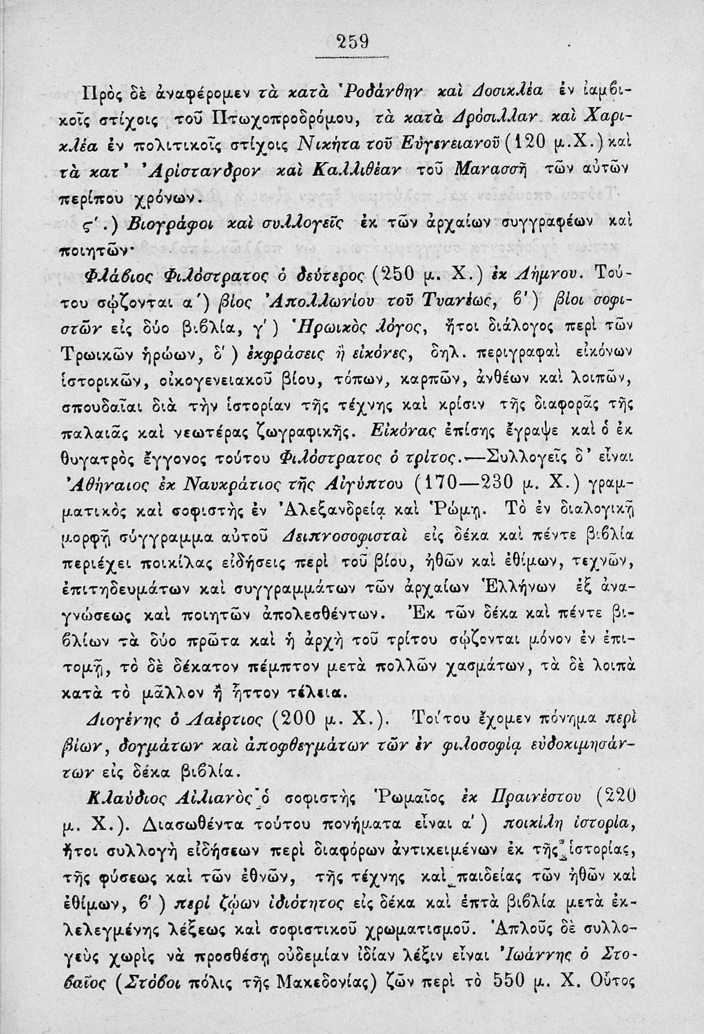 Σχολικό εγχειρίδιο για τις τάξεις του Παρθεναγωγείου και του Γυμνασίου για το μάθημα των Αρχαίων Ελληνικών. Το εγχειρίδιο περιλαμβάνει συνοπτικά την ελληνική γραμματολογία και την εργογραφία του Ηρόδοτου, του Θουκυδίδη, των λογογράφων της Ιωνίας, του Ξενοφώντα, των Αττικών ρητόρων, του Ησίοδου, του Ομήρου, του Σοφοκλή, της Αριστοτελικής, της Ελεατικής φιλοσοφίας κ.α.