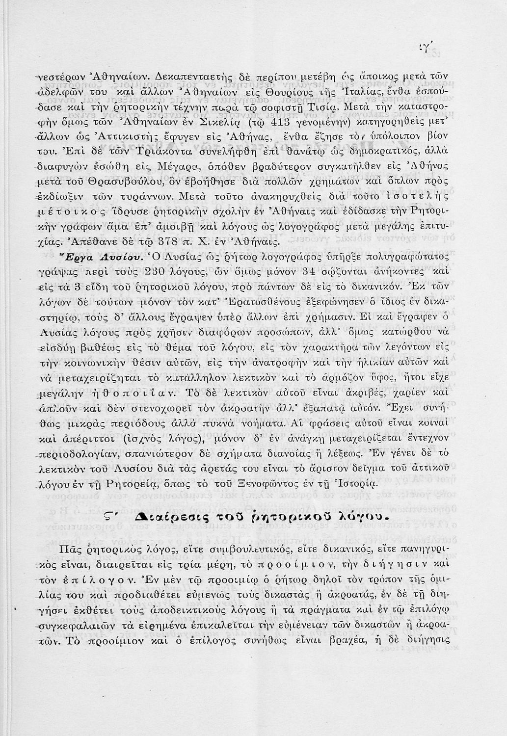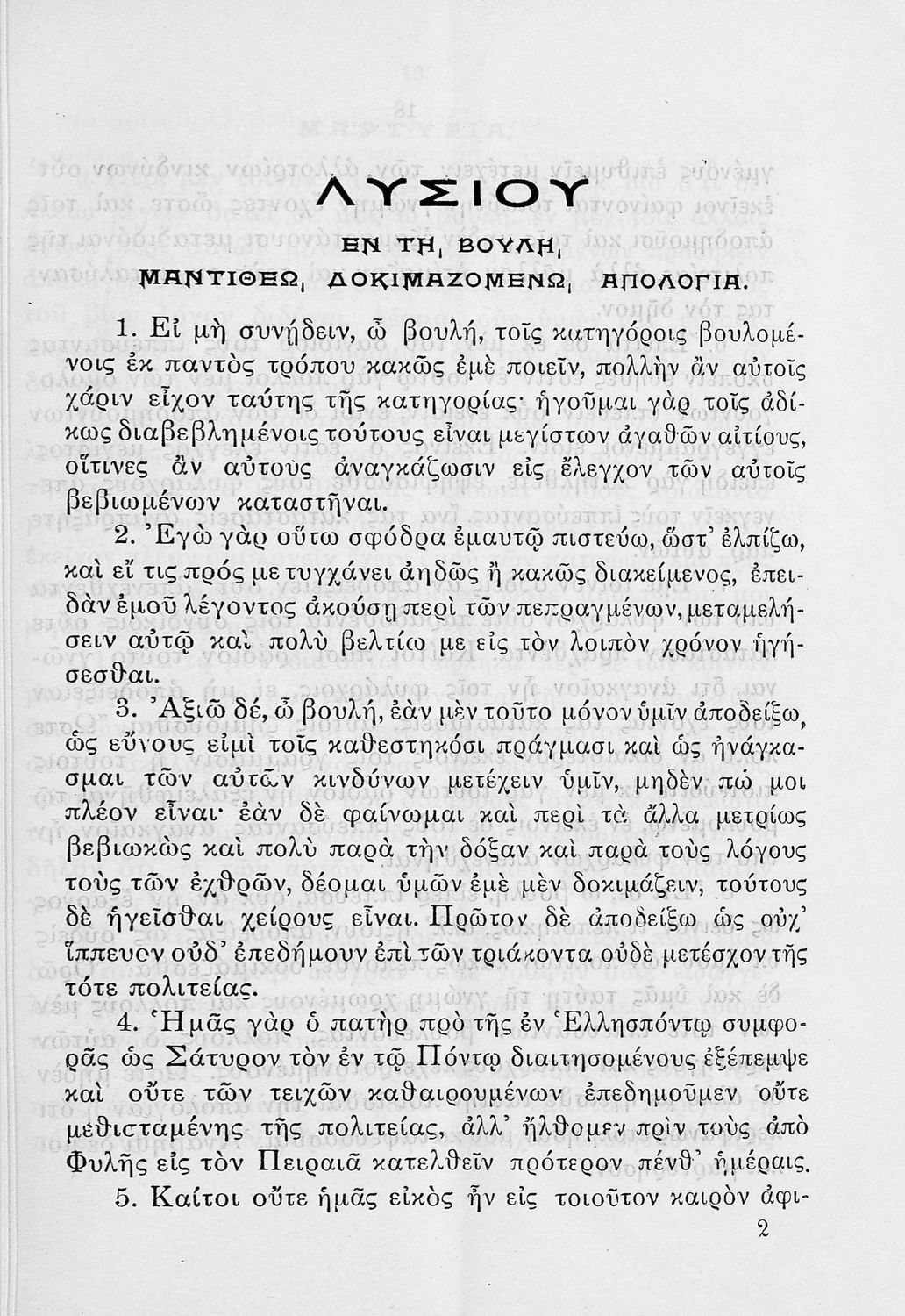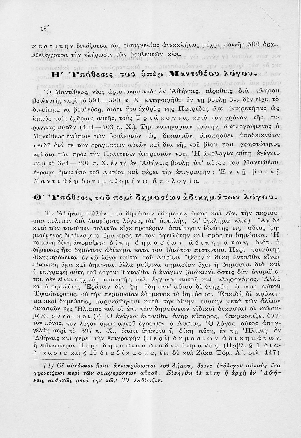 Σχολικό εγχειρίδιο Αρχαίων Ελληνικών Α΄ Γυμνασίου που περιλαμβάνει εισαγωγή στα είδη του ρητορικού λόγου, τους Λόγους του Λυσία Υπέρ Μαντιθέου και Περί δημοσίων αδικημάτων και ερμηνευτικές και πραγματολογικές σημειώσεις.