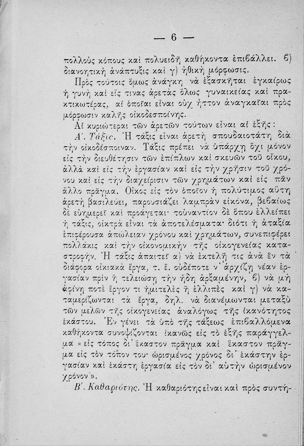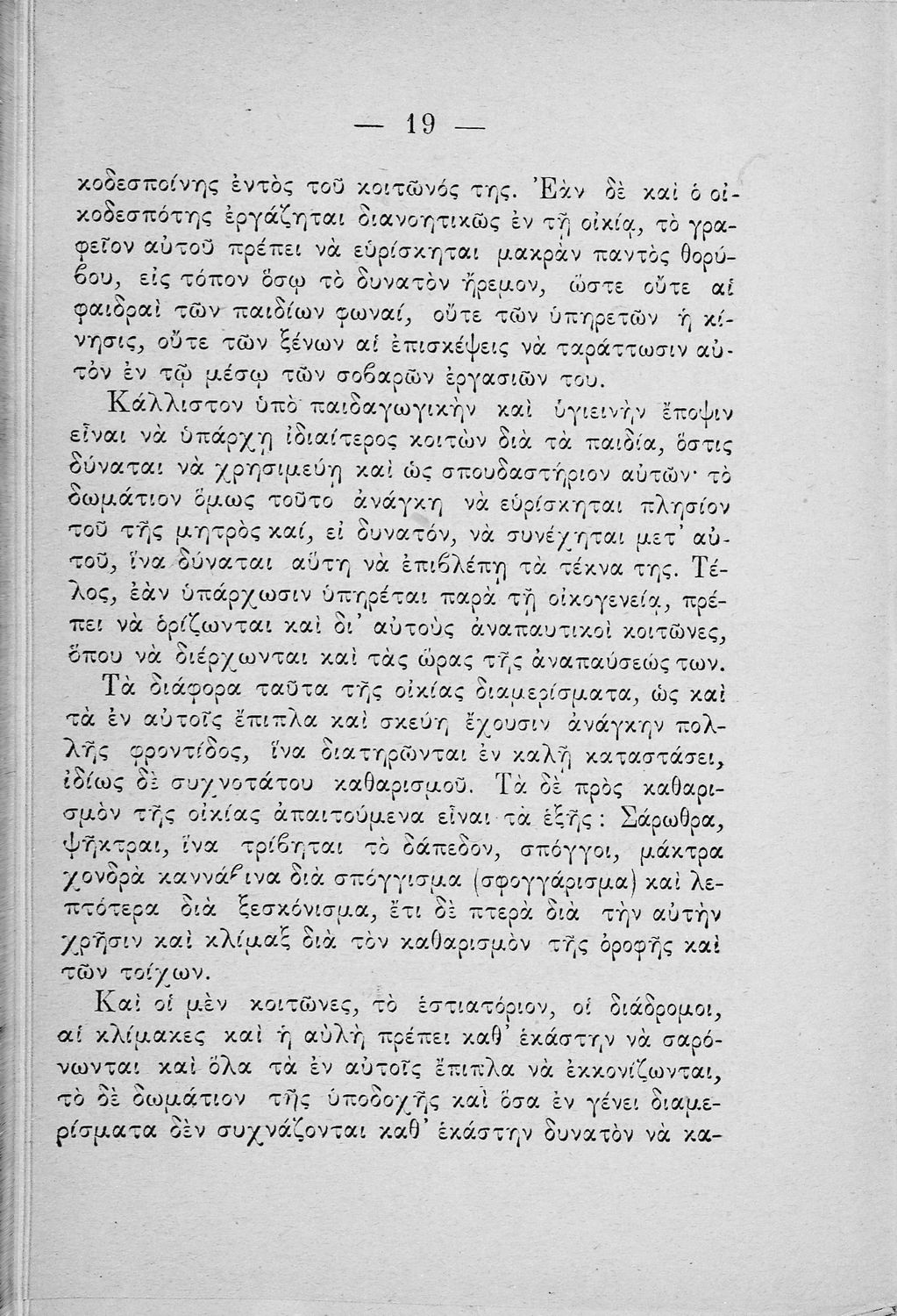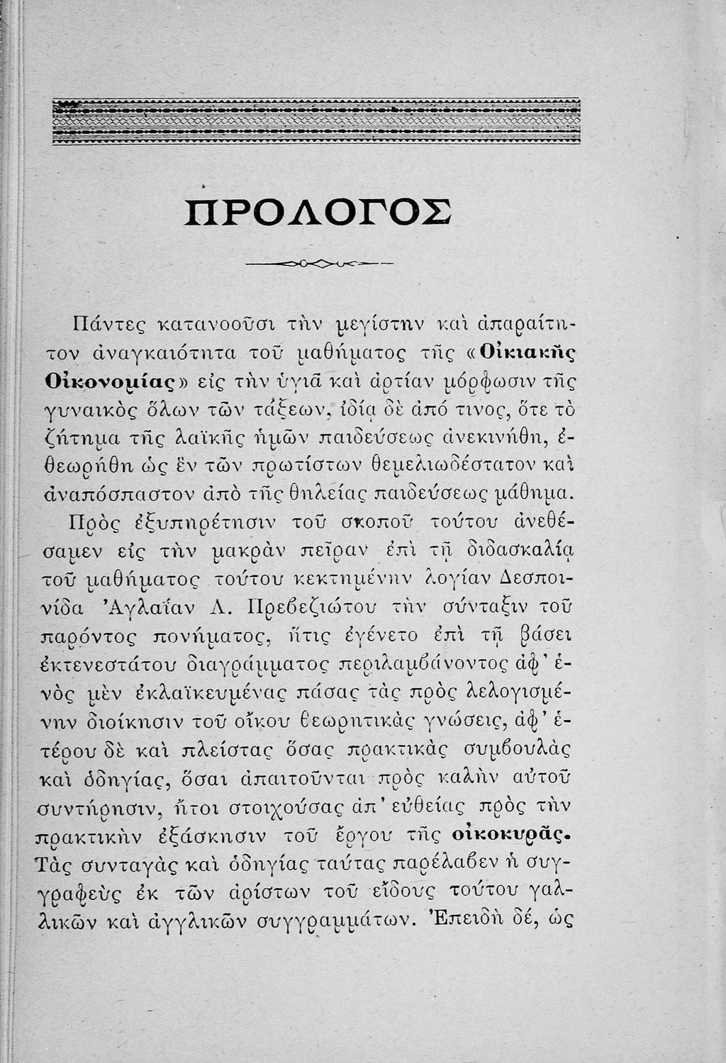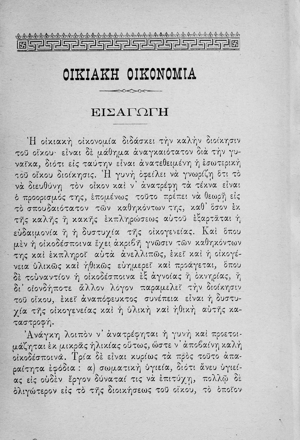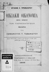 Σχολικό εγχειρίδιο για τις τάξεις του Παρθεναγωγείου για το μάθημα της Οικιακής Οικονομίας. Το εγχειρίδιο περιλαμβάνει τις βασικές γνώσεις οργάνωσης και διοίκησης της κατοικίας, του κανονισμού χρόνου εργασίας των μελών της οικογενείας, της σωστής διατροφής, τους κανόνες καλής συμπεριφοράς και ενδυμασίας, της σωστής υγιεινής, τους καλούς τρόπους συμπεριφοράς της οικοδέσποινας, του προγραμματισμού του σωστού οικογενειακού προϋπολογισμού.