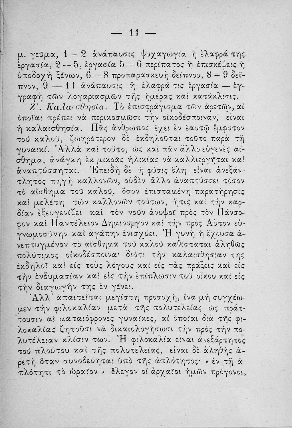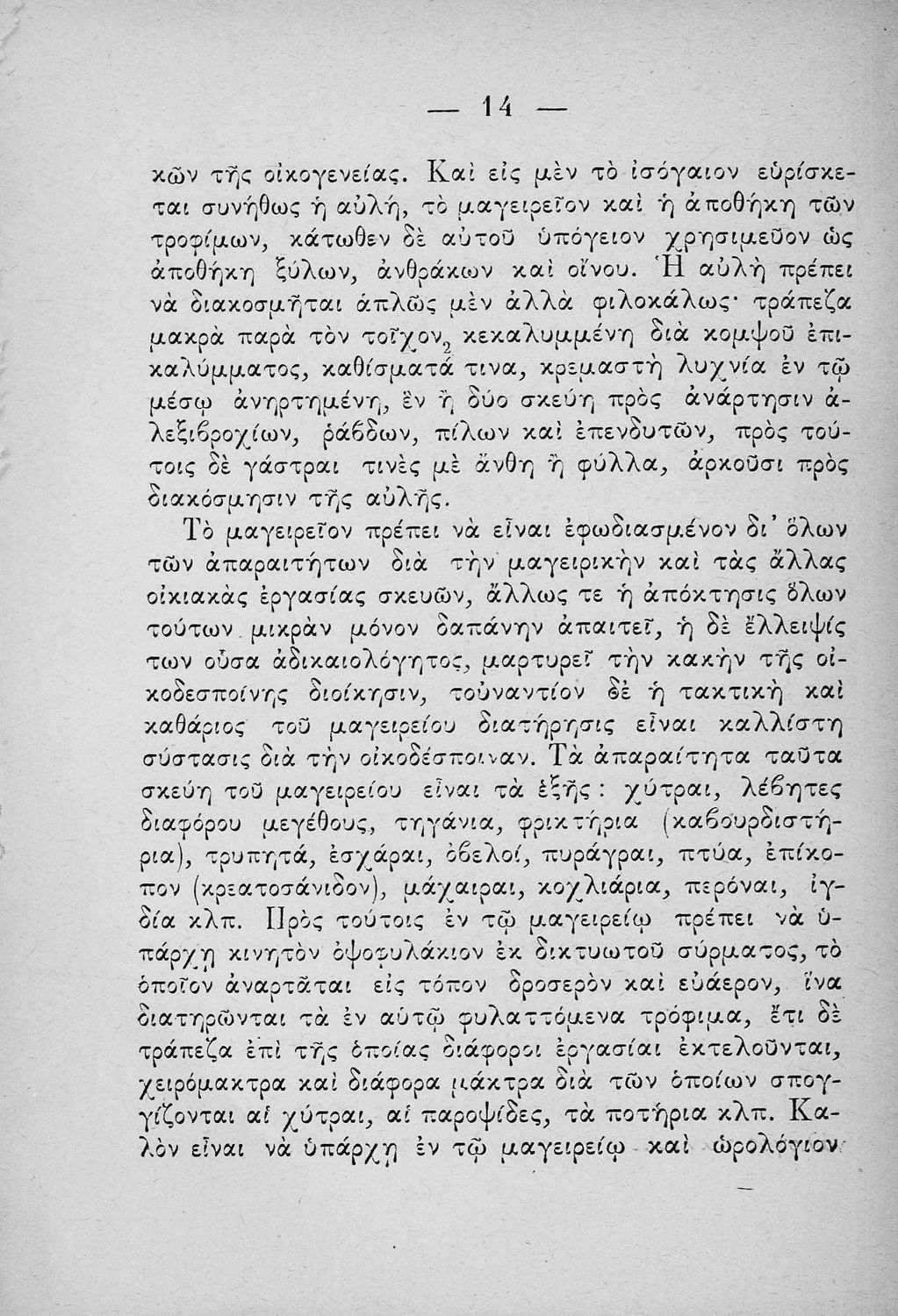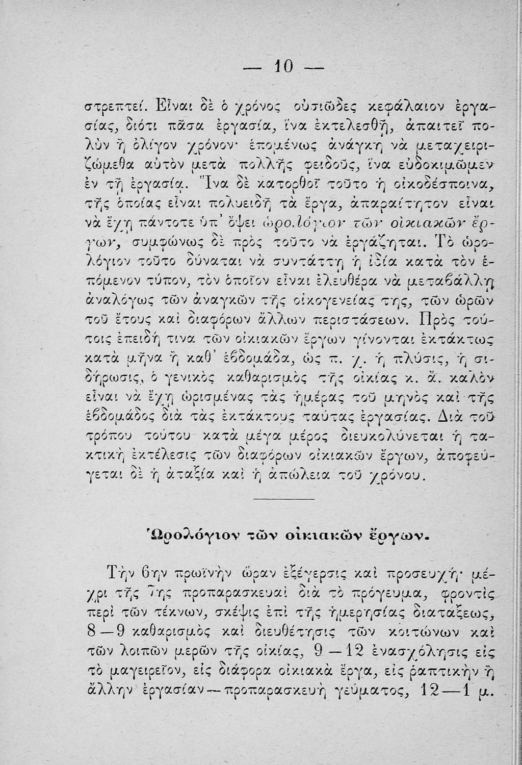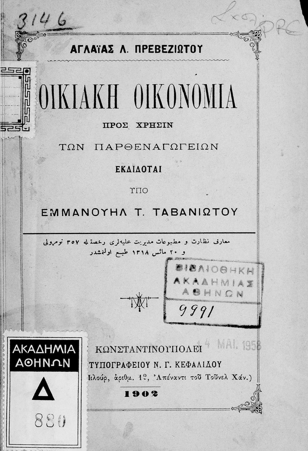 Σχολικό εγχειρίδιο για τις τάξεις του Παρθεναγωγείου για το μάθημα της Οικιακής Οικονομίας. Το εγχειρίδιο περιλαμβάνει τις βασικές γνώσεις οργάνωσης και διοίκησης της κατοικίας, του κανονισμού χρόνου εργασίας των μελών της οικογενείας, της σωστής διατροφής, τους κανόνες καλής συμπεριφοράς και ενδυμασίας, της σωστής υγιεινής, τους καλούς τρόπους συμπεριφοράς της οικοδέσποινας, του προγραμματισμού του σωστού οικογενειακού προϋπολογισμού.