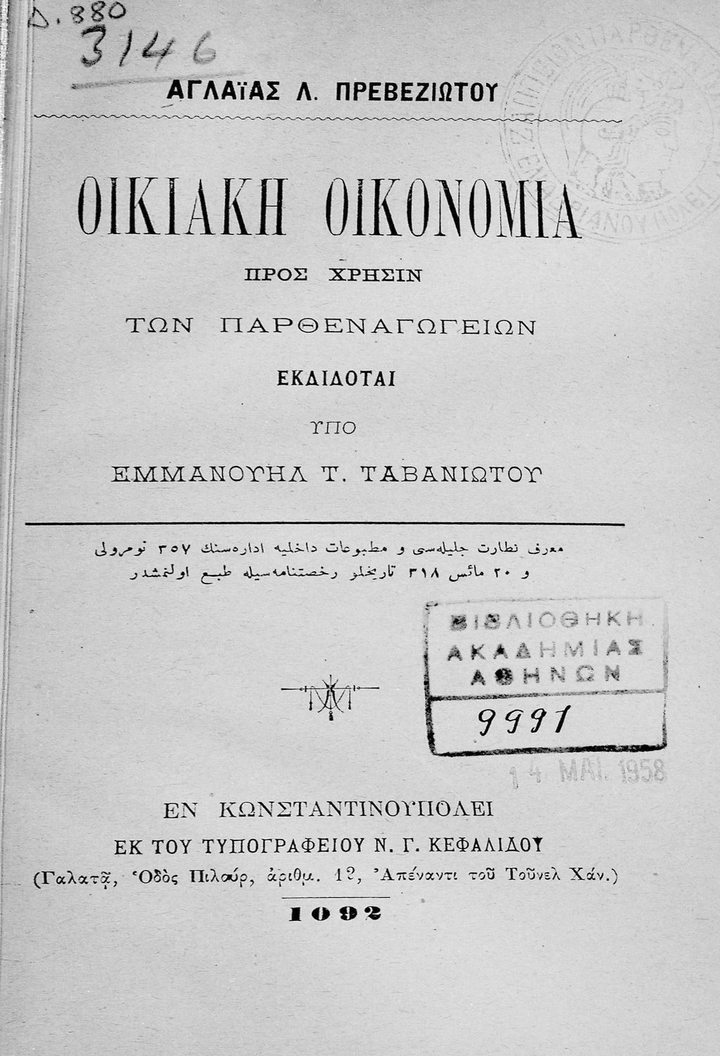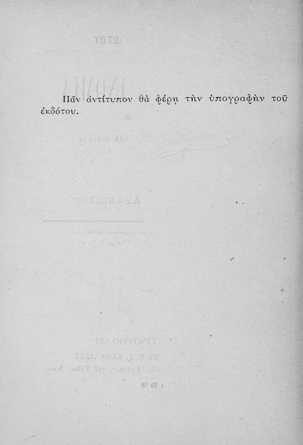 Εκδότης: Εμμανουήλ Τα. Ταβανιώτης Έτος έκδοσης: 1902 Τόπος έκδοσης: Κωνσταντινούπολη |