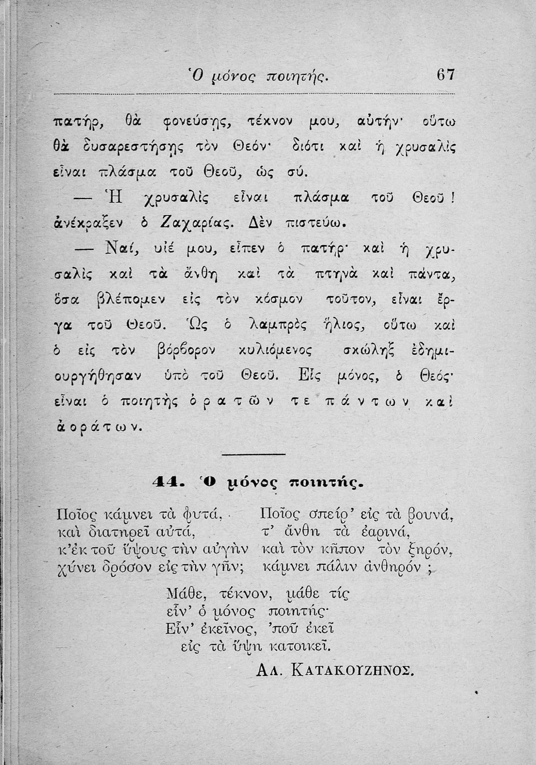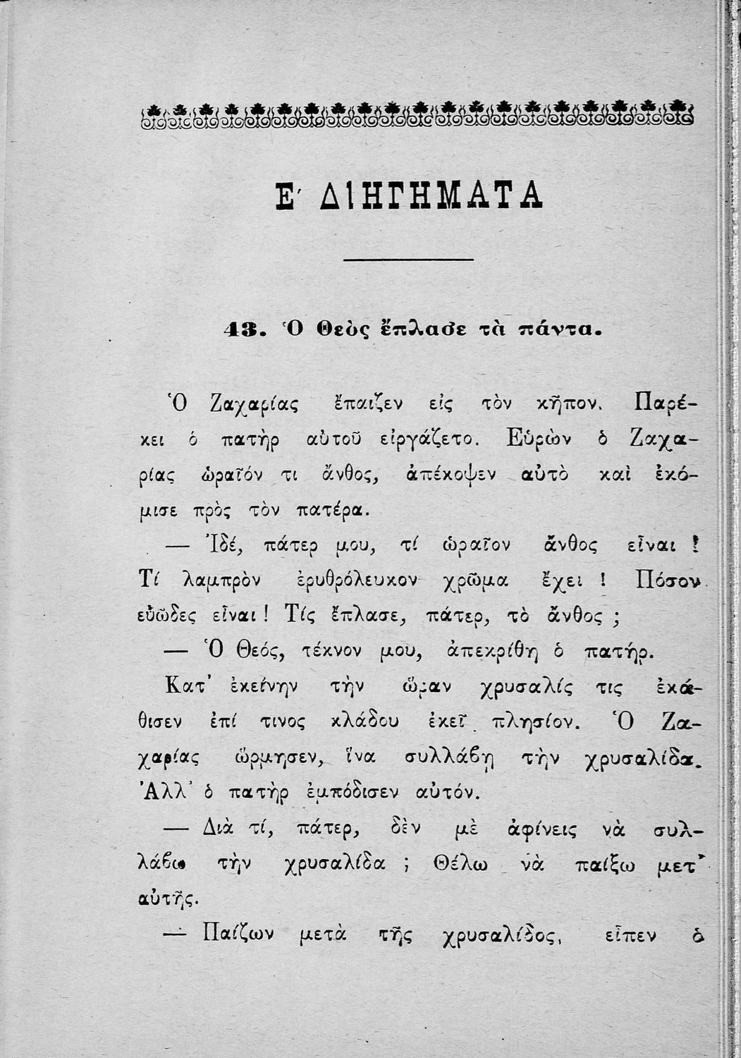 Σχολικό εγχειρίδιο για τις τάξεις του Δημοτικού για το μάθημα της Γλώσσας. Το εγχειρίδιο περιλαμβάνει ιστορίες και κείμενα ποιητικά και πεζού λόγου με θεματικές την σχολική ζωή, την οικογενειακή εστία, τη χριστιανική παράδοση, την αγάπη για τη φύση, τη φυσική ιστορία και γεωγραφία, το ανθρώπινο γένος κ.α.