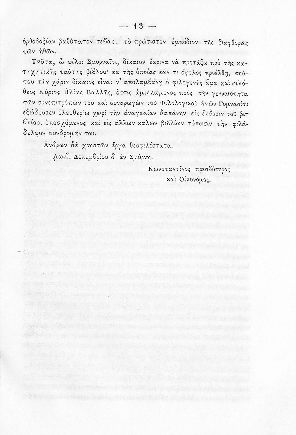 Κωδικός αναγνώρισης: 09-168328 Τίτλος: Κατήχησις η ορθόδοξος εκκλησία της χριστιανικής πίστεως εις χρήσιν του της Σμύρνης φιλολογικού γυμνασίου τω 1813 μετατυπωθείσα δε το δεύτερον εις χρήσιν των απανταχού ορθοδόξων Συγγραφέας: Σοφ. Κ. Οικονόμου Μέγεθος και υπόστρωμα: Σχολικό εγχειρίδιο, μαλακό εξώφυλλο, 144 σελίδες. |