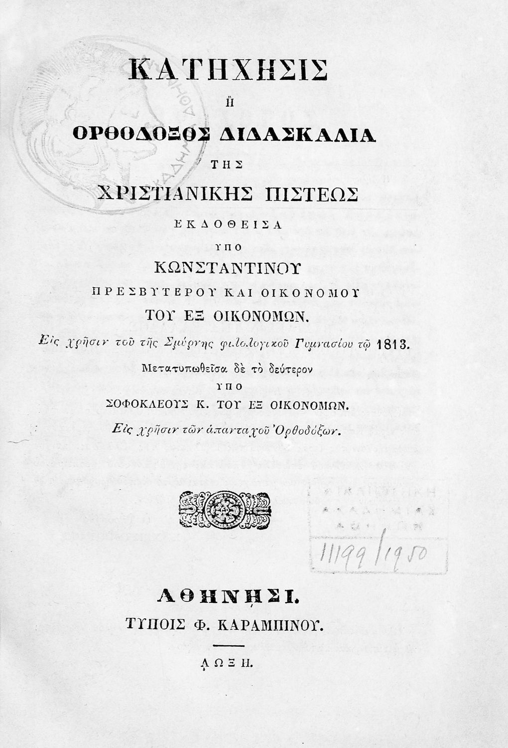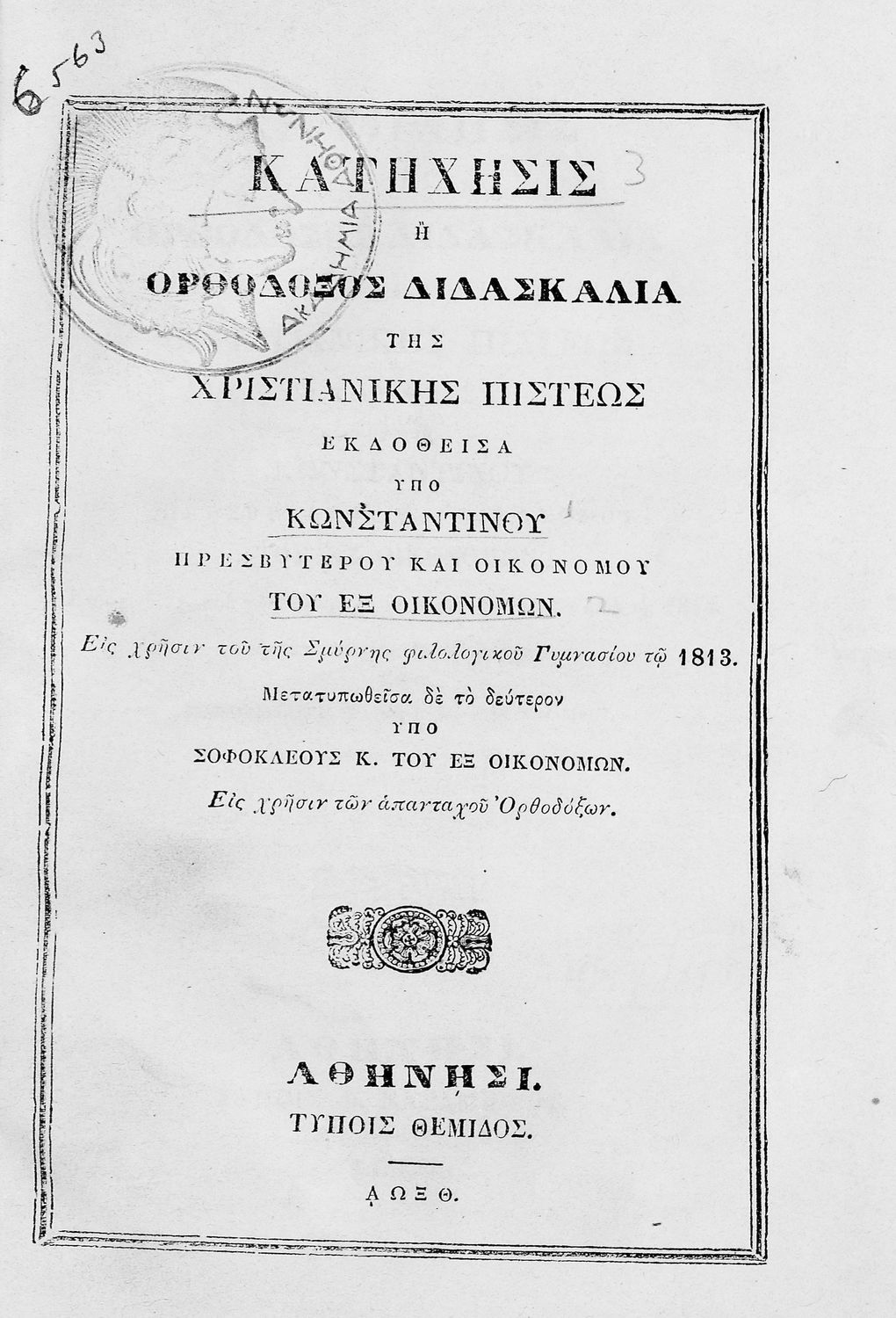 245 0# _aΚατήχησις η ορθόδοξος εκκλησία της χριστιανικής πίστεως εις χρήσιν του της Σμύρνης φιλολογικού γυμνασίου τω 1813 μετατυπωθείσα δε το δεύτερον εις χρήσιν των απανταχού ορθοδόξων