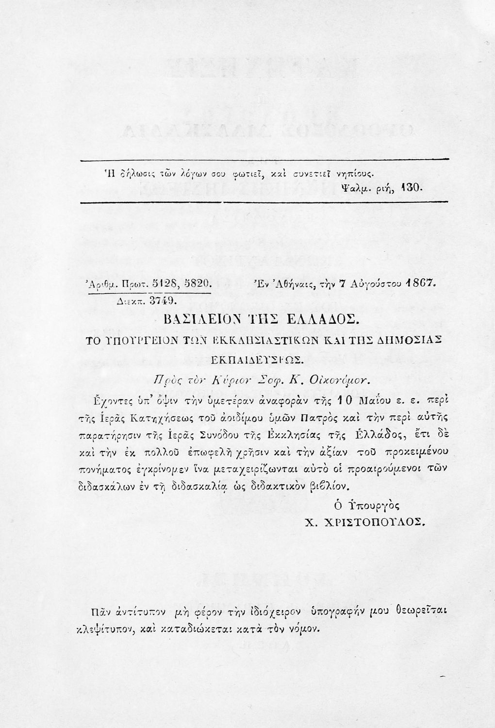 Εκδότης: Θέμιδα Τόπος έκδοσης: Αθήνα Υπουργική απόφαση / Σύμβαση: 5128, 5820/ 7-8-1867 Έτος έγκρισης: 1867 |