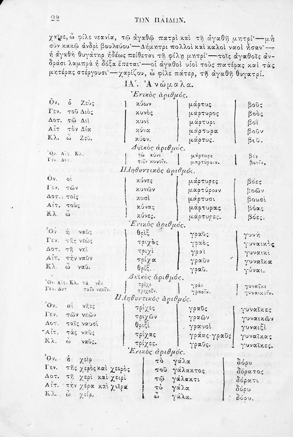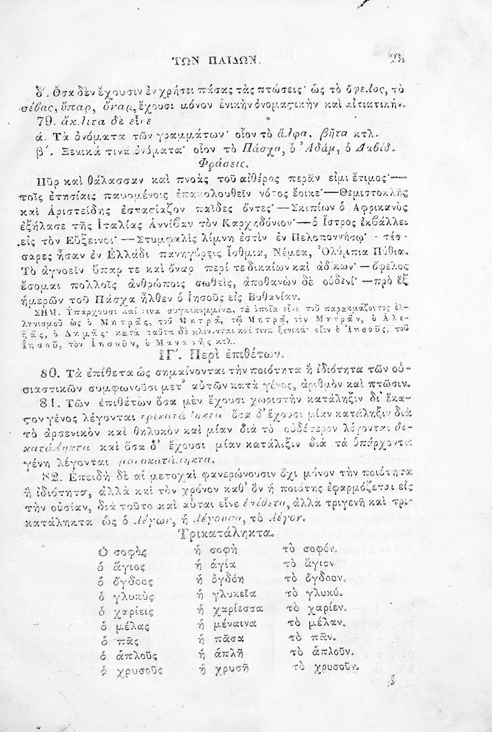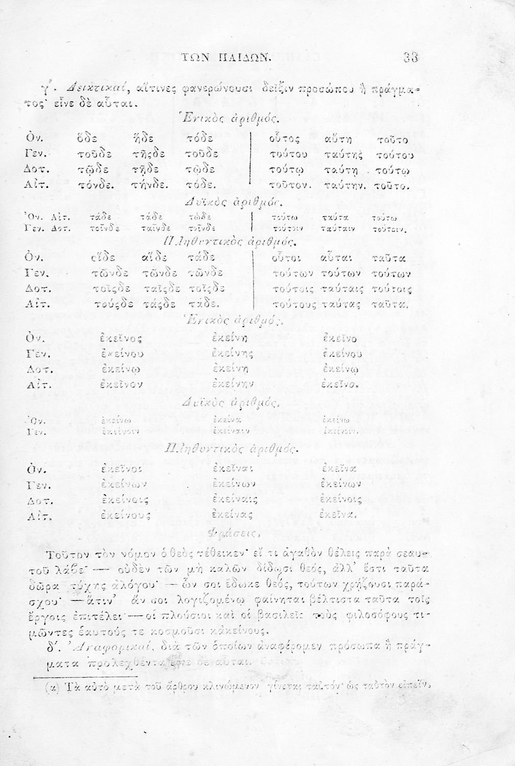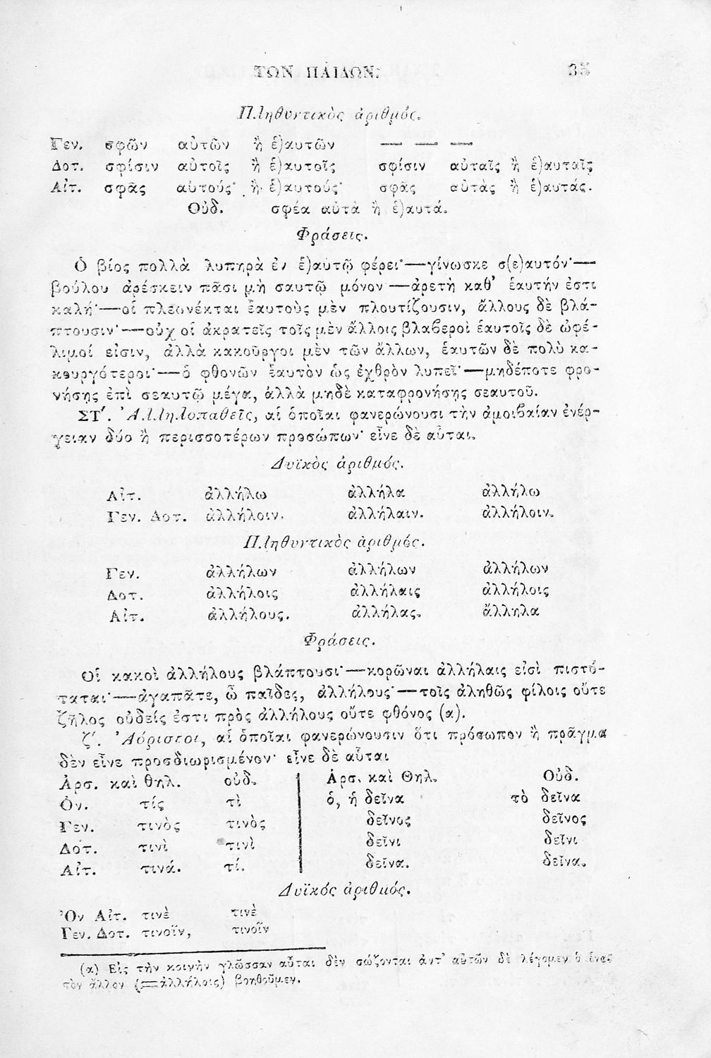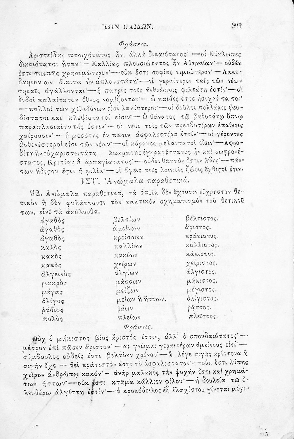 520 ## _aΣχολικό εγχειρίδιο για τις τάξεις του Δημοτικού και συγκεκριμένα της γραμματικής των Αρχαίων Ελληνικών. Το εγχειρίδιο χωρίζεται σε 2 μέρη. Το πρώτο μέρος περιλαμβάνει το τεχνολογικό μέρος της γραμματικής, όπου εκεί αναπτύσσονται τα γράμματα, οι φθόγγοι, η κλίση των ονομάτων, των ρημάτων κ.α. Το δεύτερο μέρος περιλαμβάνει το ετυμολογικό μέρος της γραμματικής της ελληνικής γλώσσας, όπου παρουσιάζονται η παραγωγή των λέξεων, το συντακτικό της ελληνικής γλώσσας και οι κανόνες του.