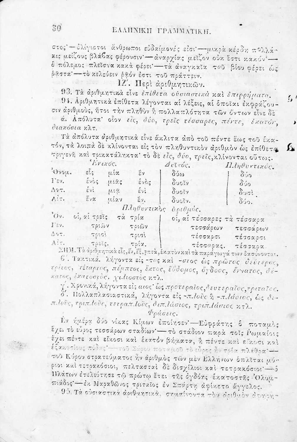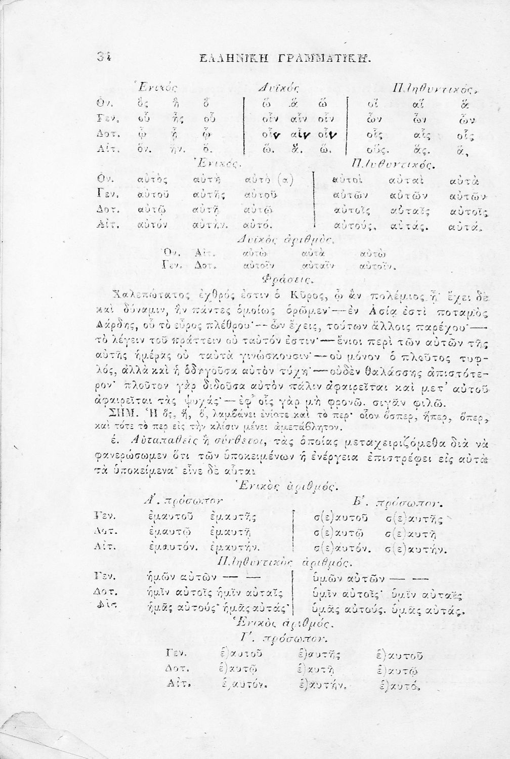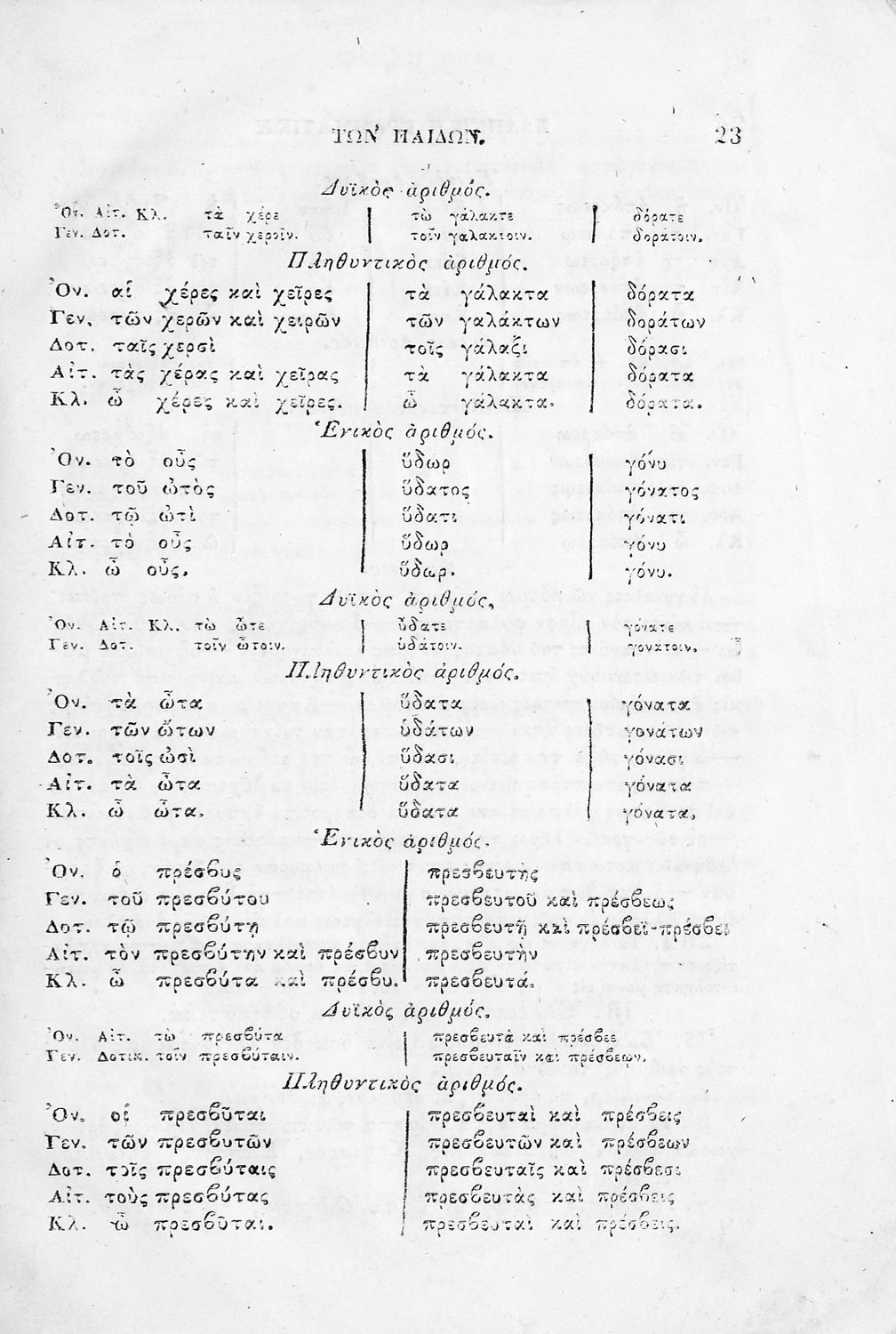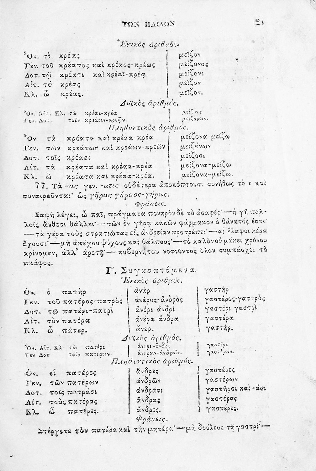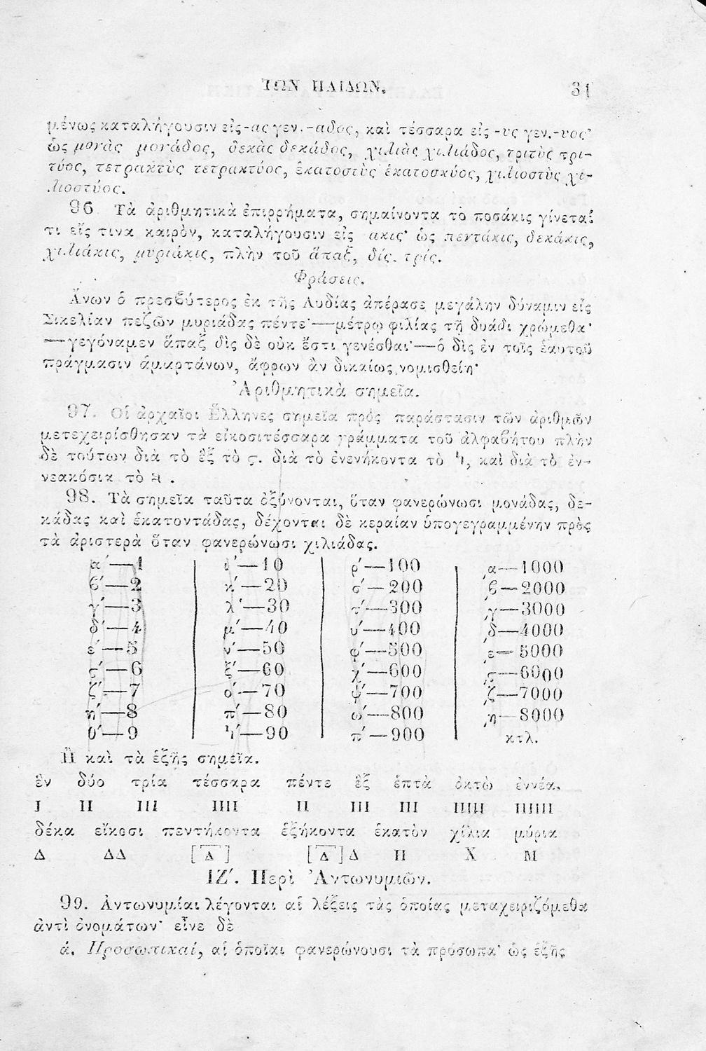 520 ## _aΣχολικό εγχειρίδιο για τις τάξεις του Δημοτικού και συγκεκριμένα της γραμματικής των Αρχαίων Ελληνικών. Το εγχειρίδιο χωρίζεται σε 2 μέρη. Το πρώτο μέρος περιλαμβάνει το τεχνολογικό μέρος της γραμματικής, όπου εκεί αναπτύσσονται τα γράμματα, οι φθόγγοι, η κλίση των ονομάτων, των ρημάτων κ.α. Το δεύτερο μέρος περιλαμβάνει το ετυμολογικό μέρος της γραμματικής της ελληνικής γλώσσας, όπου παρουσιάζονται η παραγωγή των λέξεων, το συντακτικό της ελληνικής γλώσσας και οι κανόνες του.