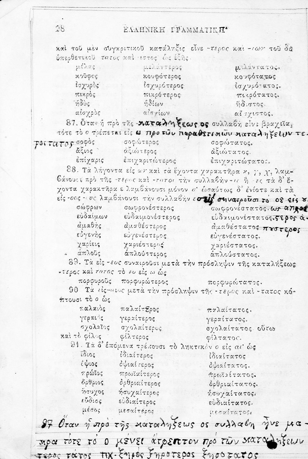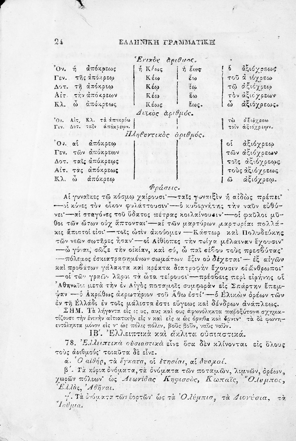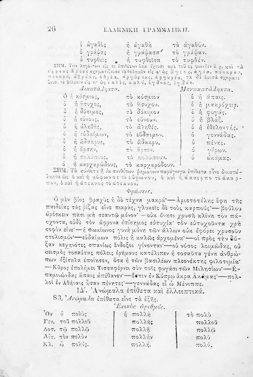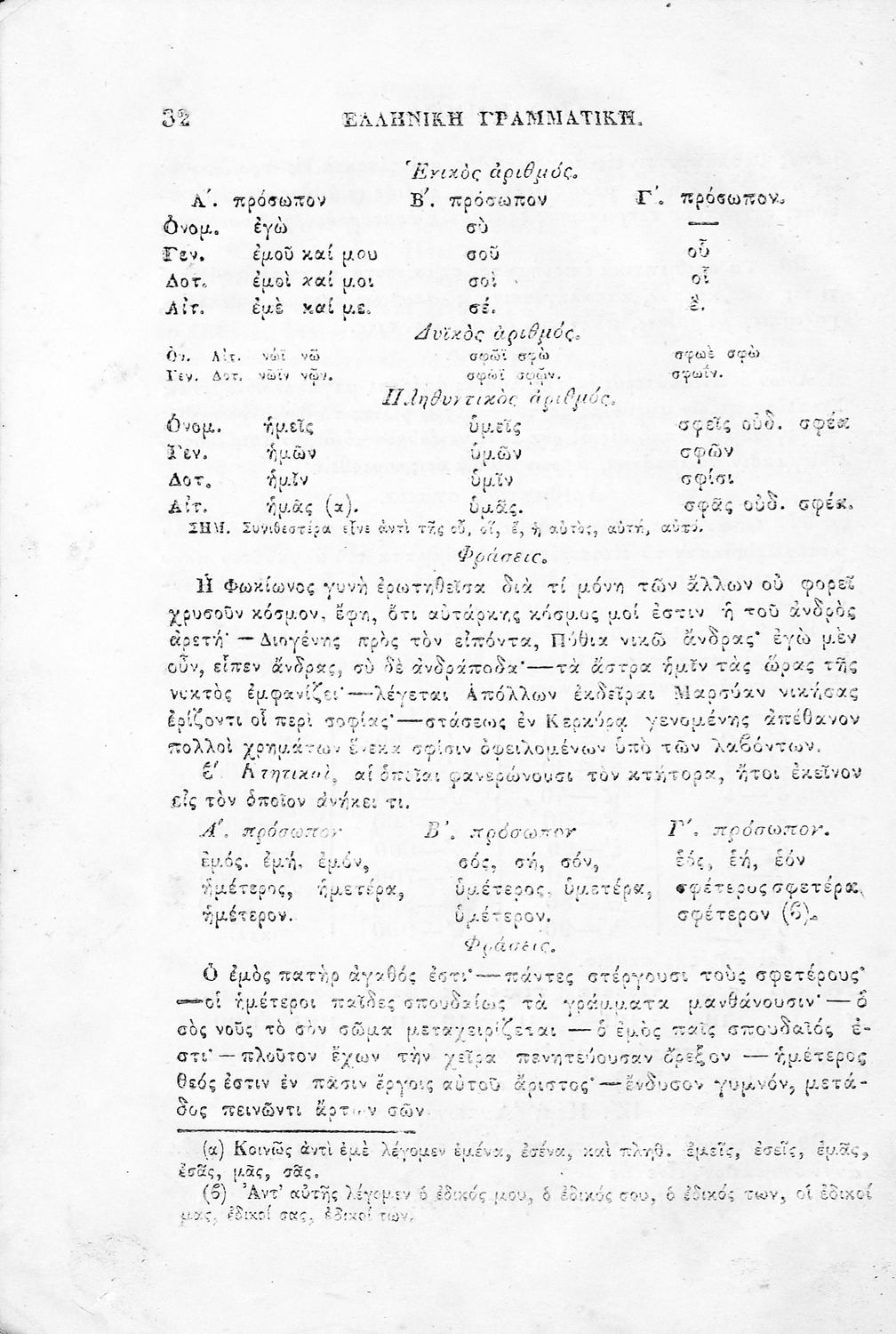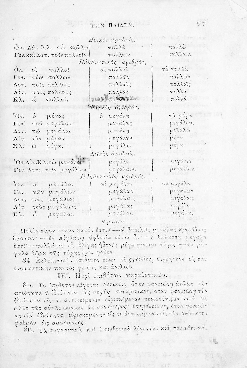 520 ## _aΣχολικό εγχειρίδιο για τις τάξεις του Δημοτικού και συγκεκριμένα της γραμματικής των Αρχαίων Ελληνικών. Το εγχειρίδιο χωρίζεται σε 2 μέρη. Το πρώτο μέρος περιλαμβάνει το τεχνολογικό μέρος της γραμματικής, όπου εκεί αναπτύσσονται τα γράμματα, οι φθόγγοι, η κλίση των ονομάτων, των ρημάτων κ.α. Το δεύτερο μέρος περιλαμβάνει το ετυμολογικό μέρος της γραμματικής της ελληνικής γλώσσας, όπου παρουσιάζονται η παραγωγή των λέξεων, το συντακτικό της ελληνικής γλώσσας και οι κανόνες του.