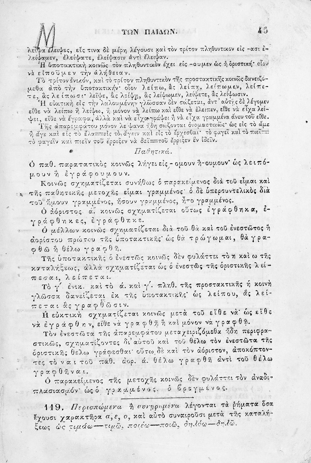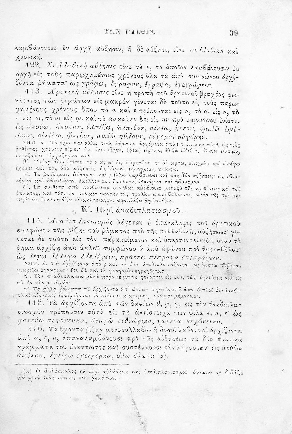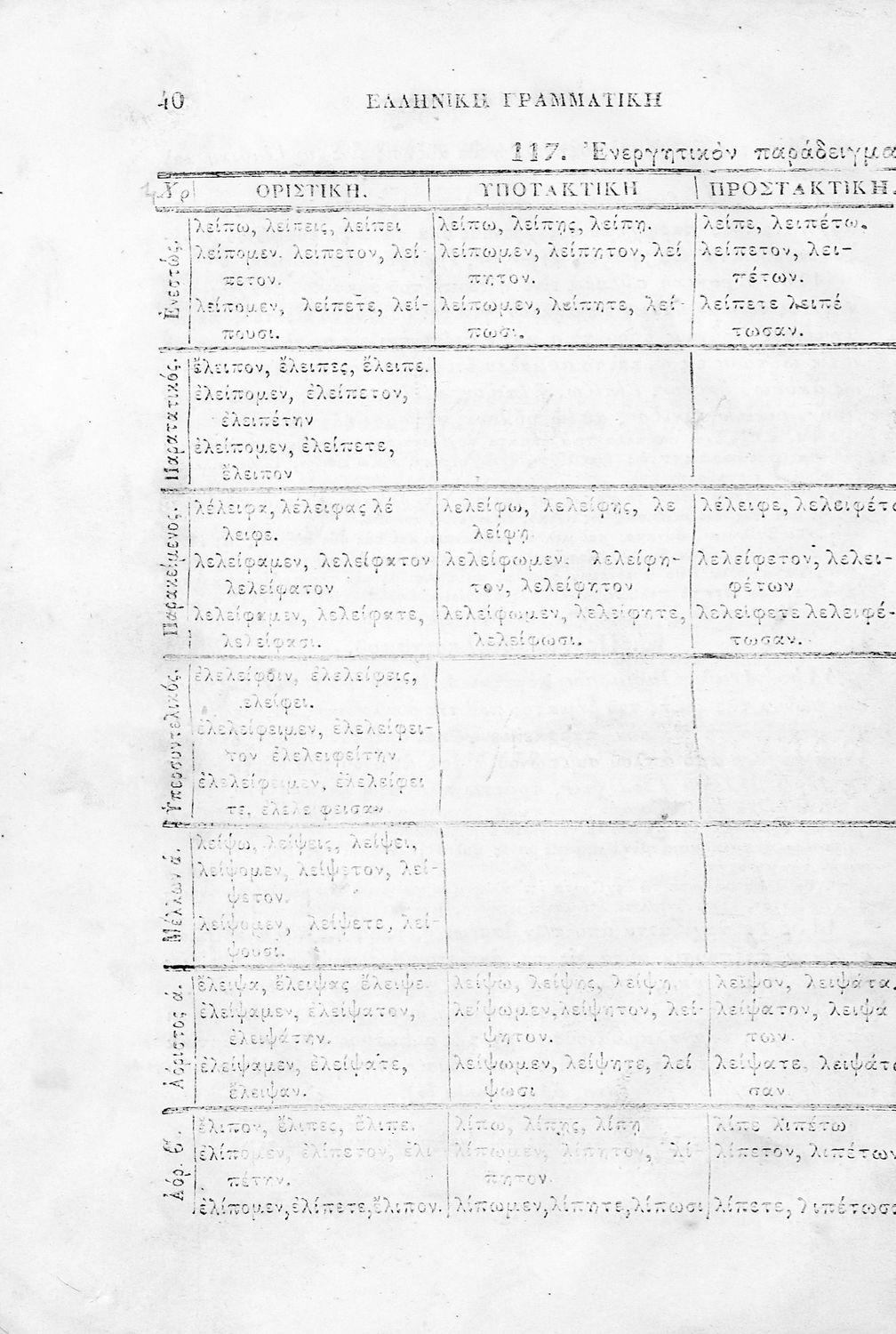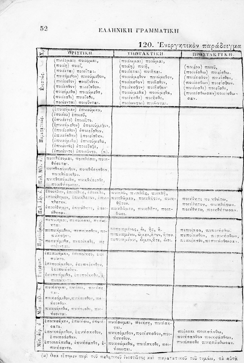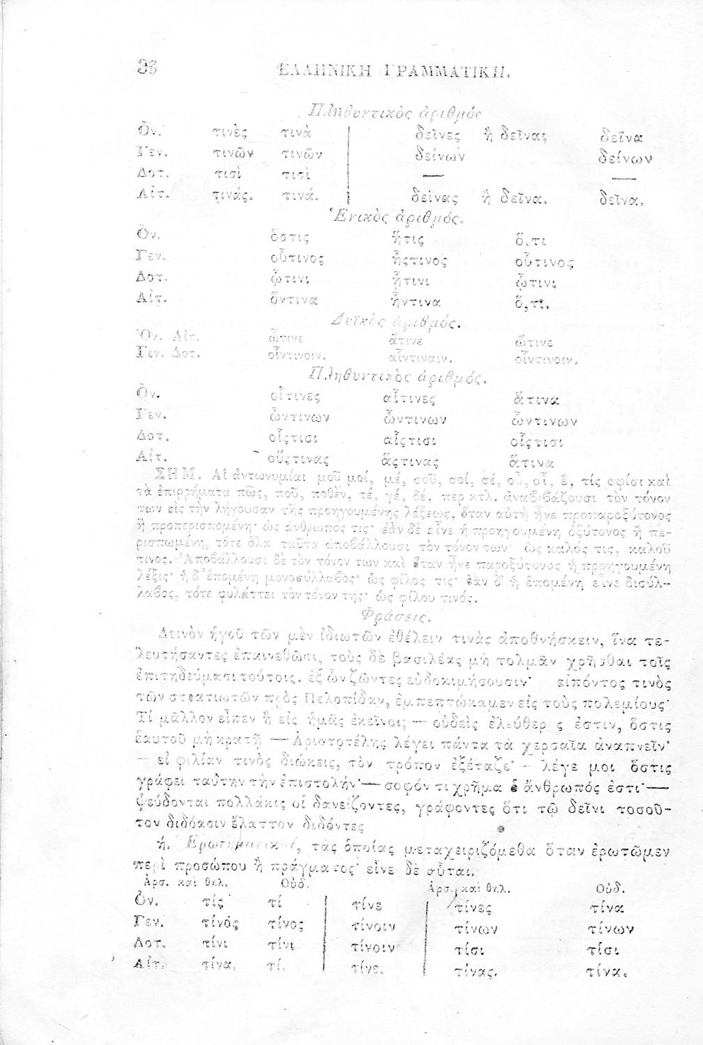 520 ## _aΣχολικό εγχειρίδιο για τις τάξεις του Δημοτικού και συγκεκριμένα της γραμματικής των Αρχαίων Ελληνικών. Το εγχειρίδιο χωρίζεται σε 2 μέρη. Το πρώτο μέρος περιλαμβάνει το τεχνολογικό μέρος της γραμματικής, όπου εκεί αναπτύσσονται τα γράμματα, οι φθόγγοι, η κλίση των ονομάτων, των ρημάτων κ.α. Το δεύτερο μέρος περιλαμβάνει το ετυμολογικό μέρος της γραμματικής της ελληνικής γλώσσας, όπου παρουσιάζονται η παραγωγή των λέξεων, το συντακτικό της ελληνικής γλώσσας και οι κανόνες του.
