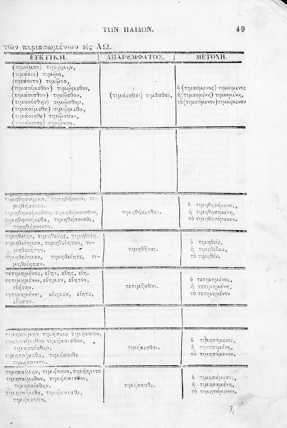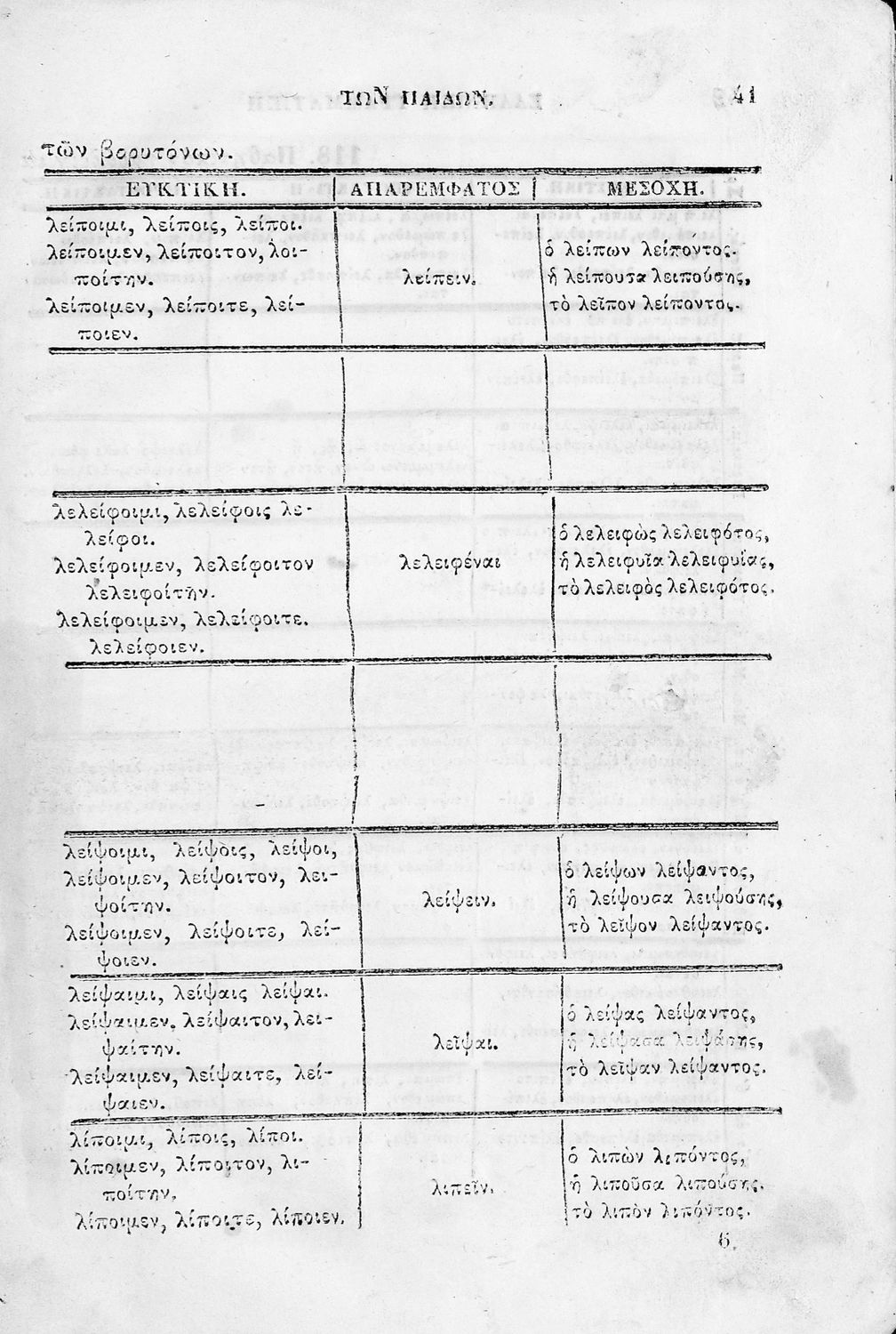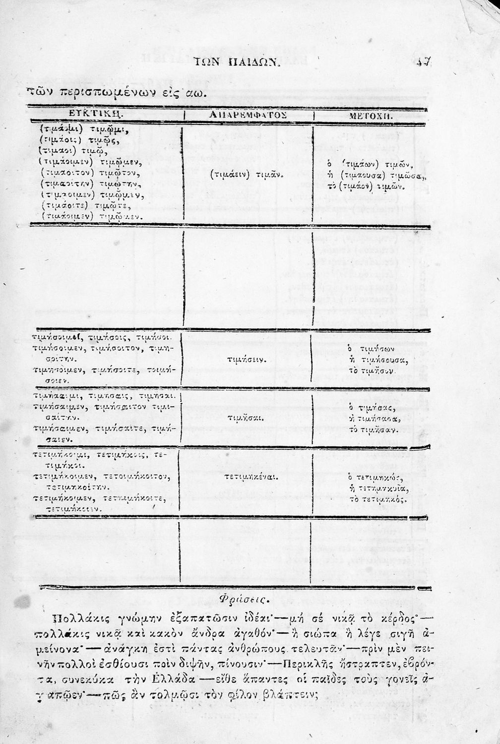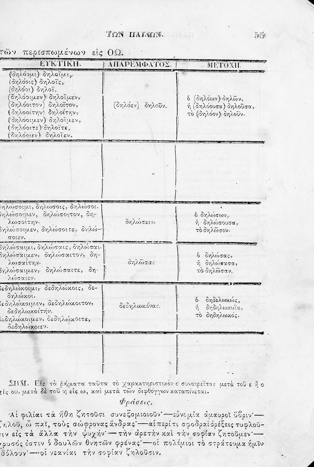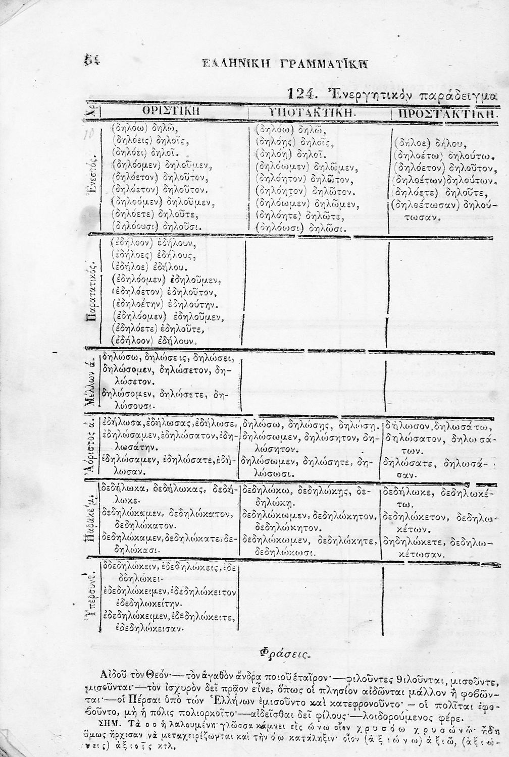 520 ## _aΣχολικό εγχειρίδιο για τις τάξεις του Δημοτικού και συγκεκριμένα της γραμματικής των Αρχαίων Ελληνικών. Το εγχειρίδιο χωρίζεται σε 2 μέρη. Το πρώτο μέρος περιλαμβάνει το τεχνολογικό μέρος της γραμματικής, όπου εκεί αναπτύσσονται τα γράμματα, οι φθόγγοι, η κλίση των ονομάτων, των ρημάτων κ.α. Το δεύτερο μέρος περιλαμβάνει το ετυμολογικό μέρος της γραμματικής της ελληνικής γλώσσας, όπου παρουσιάζονται η παραγωγή των λέξεων, το συντακτικό της ελληνικής γλώσσας και οι κανόνες του.