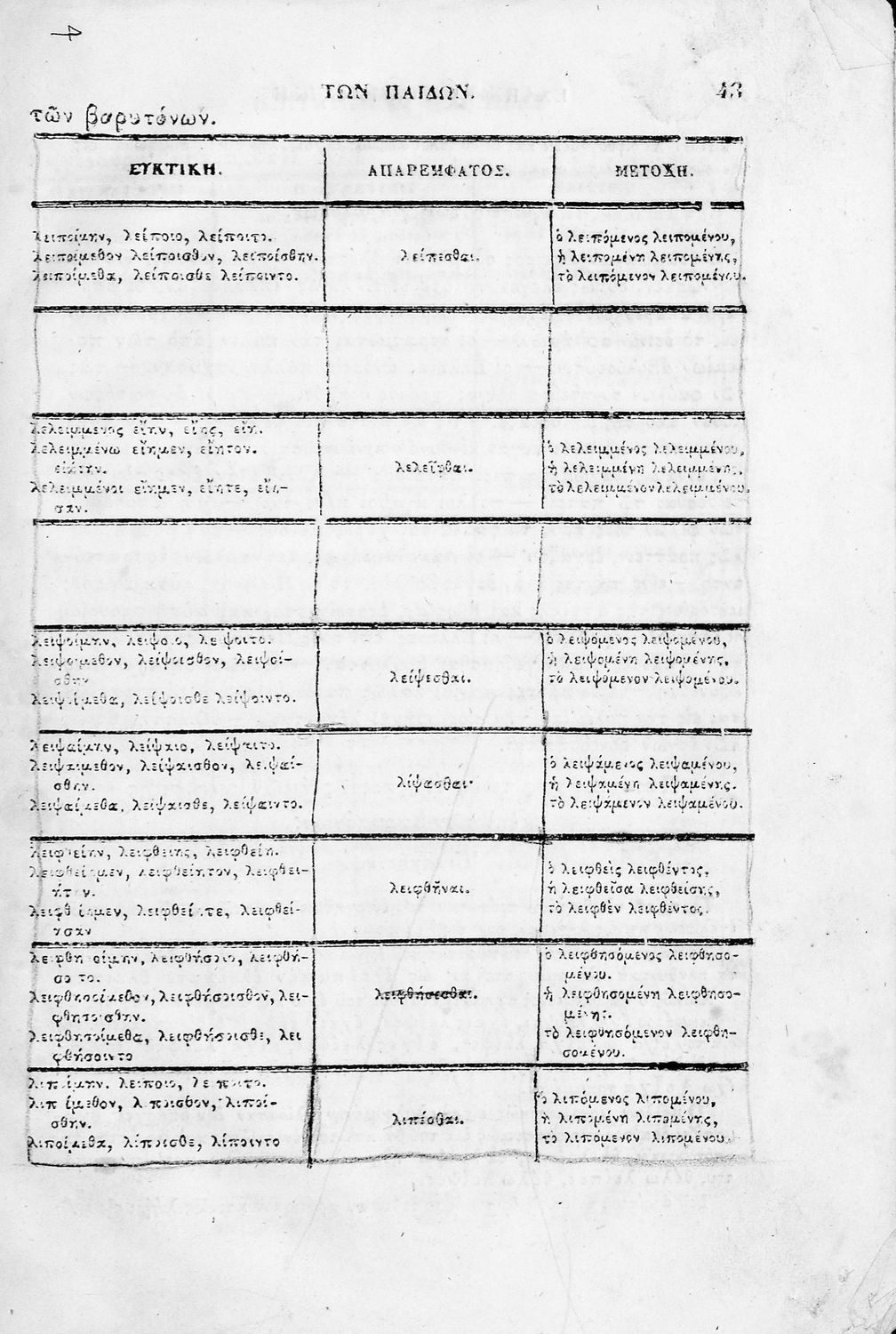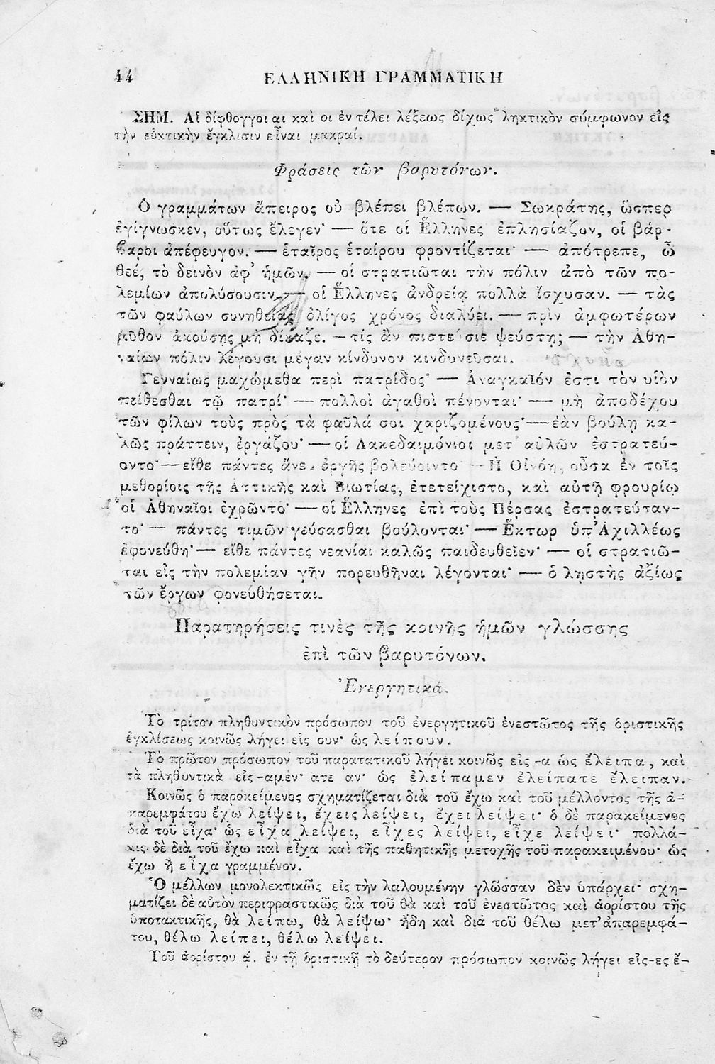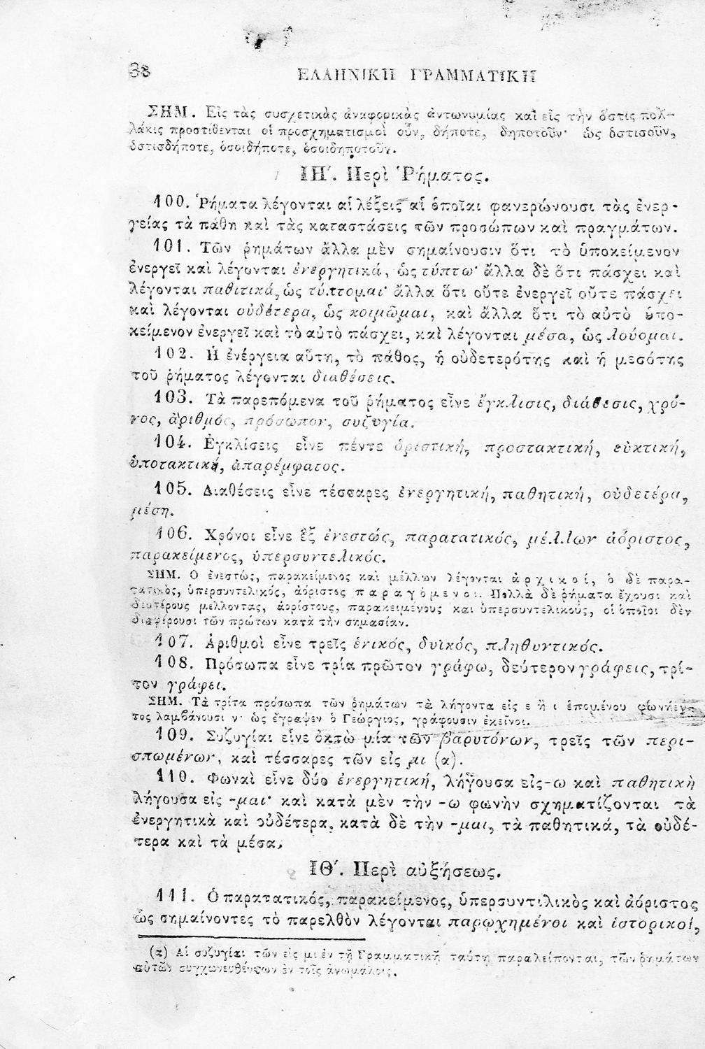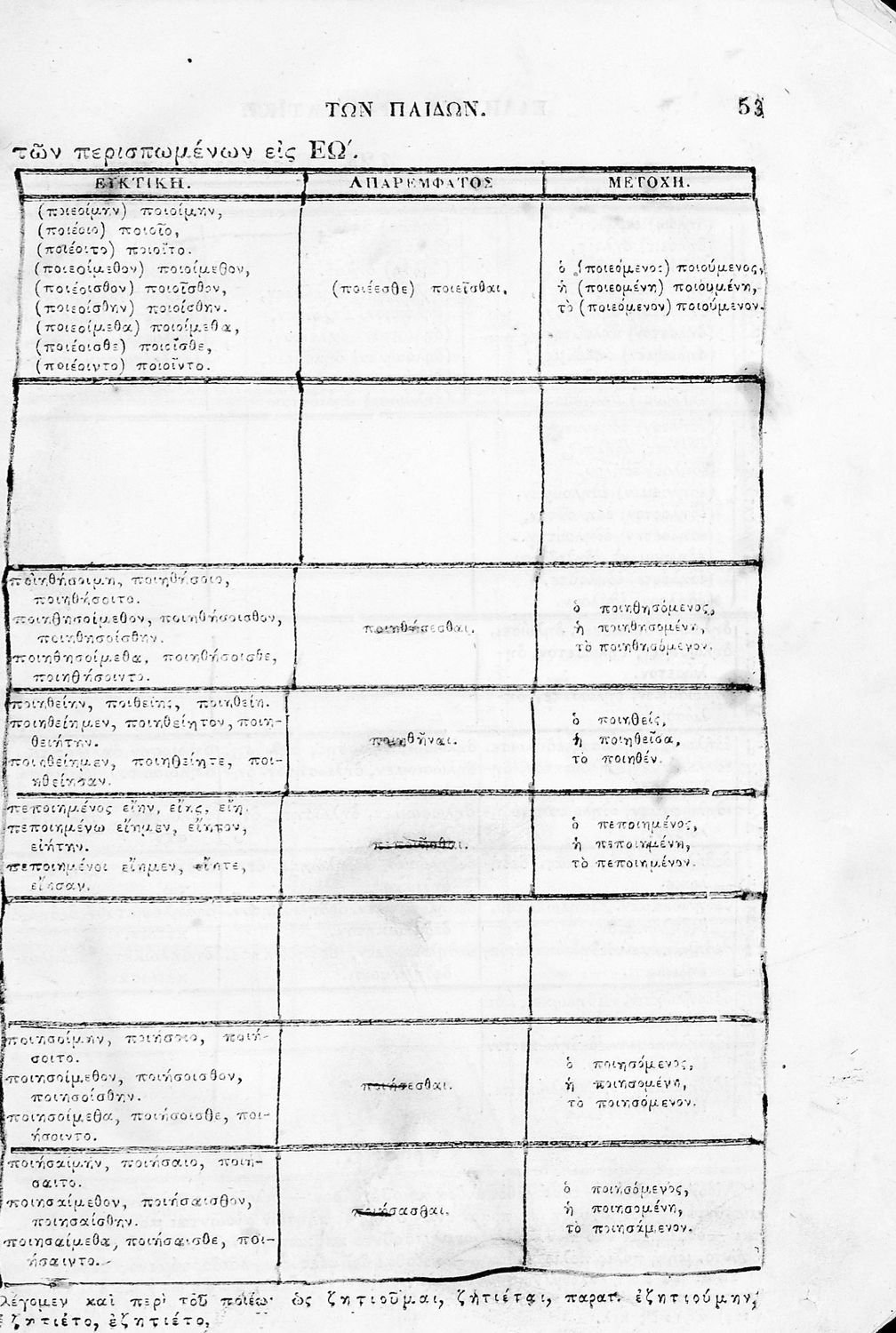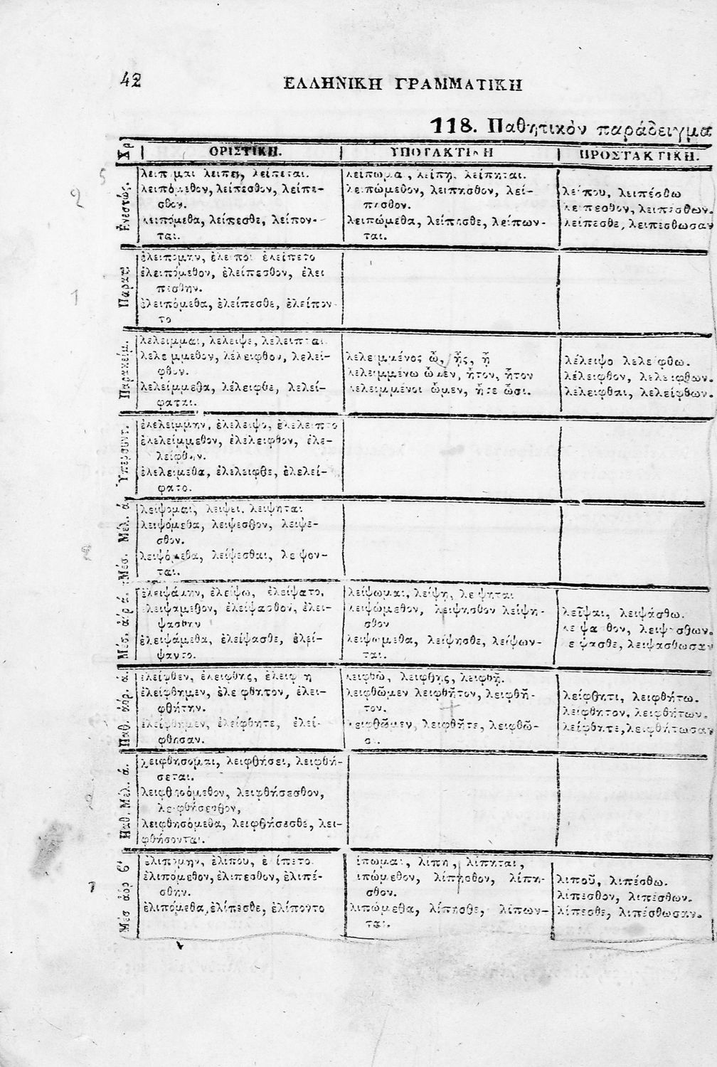 520 ## _aΣχολικό εγχειρίδιο για τις τάξεις του Δημοτικού και συγκεκριμένα της γραμματικής των Αρχαίων Ελληνικών. Το εγχειρίδιο χωρίζεται σε 2 μέρη. Το πρώτο μέρος περιλαμβάνει το τεχνολογικό μέρος της γραμματικής, όπου εκεί αναπτύσσονται τα γράμματα, οι φθόγγοι, η κλίση των ονομάτων, των ρημάτων κ.α. Το δεύτερο μέρος περιλαμβάνει το ετυμολογικό μέρος της γραμματικής της ελληνικής γλώσσας, όπου παρουσιάζονται η παραγωγή των λέξεων, το συντακτικό της ελληνικής γλώσσας και οι κανόνες του.
