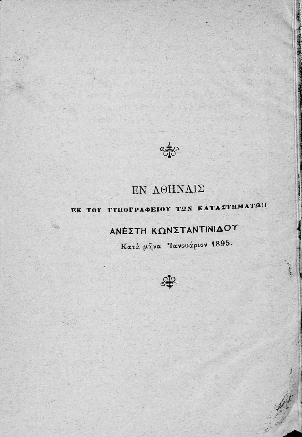 Εκδότης: Ανέστης Κωνσταντινίδης Έτος έκδοσης: 1894 Τόπος έκδοσης: Αθήνα |