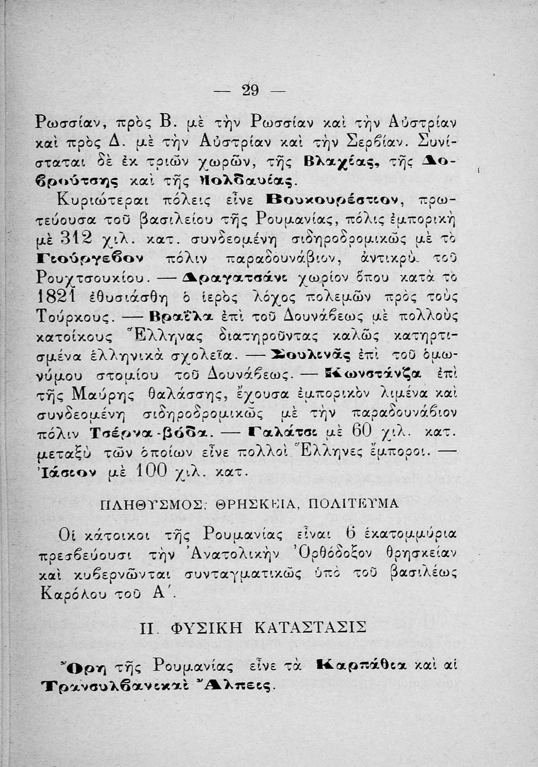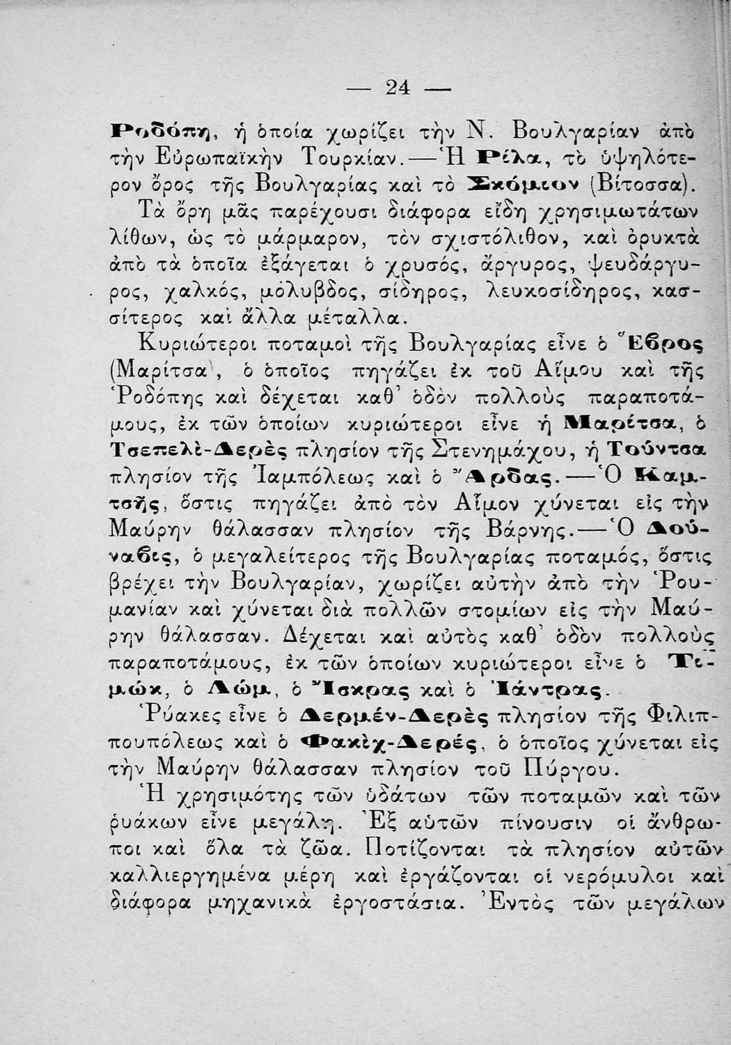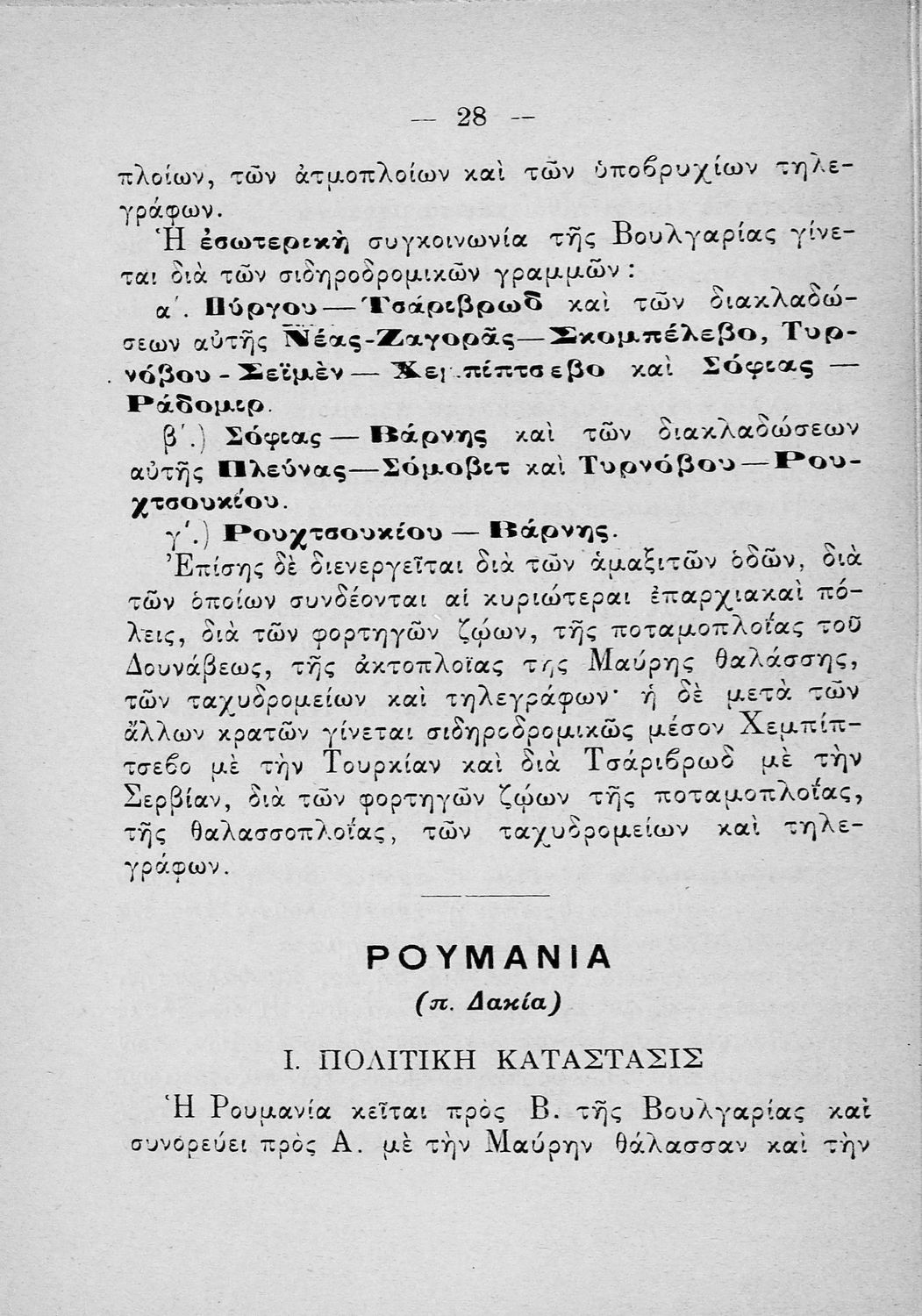 Σχολικό εγχειρίδιο Γεωγραφίας για τα ελληνικά εκπαιδευτήρια στην Βουλγαρία που περιλαμβάνει εισαγωγή στη φυσική και πολιτική γεωγραφία και εξετάζει την Ανατολική Ρωμυλία, τη Βόρεια Βουλγαρία, τη Ρουμανία, τη Σερβία, το Μαυροβούνιο, τη Ευρωπαϊκή και Ασιατική Τουρκία και την Ελλάδα από γεωφυσική, πολιτική και οικονομική άποψη.