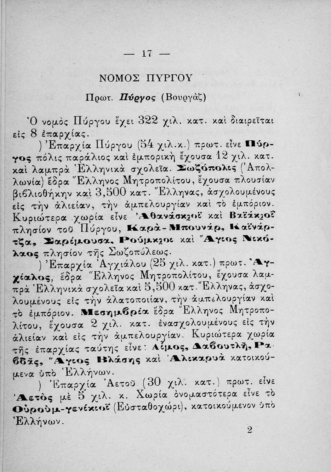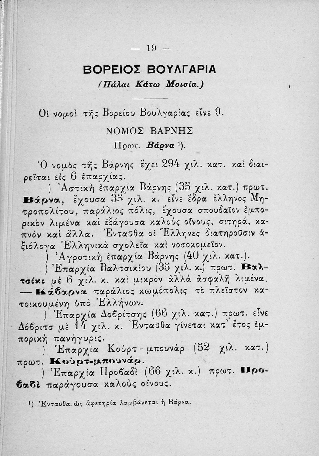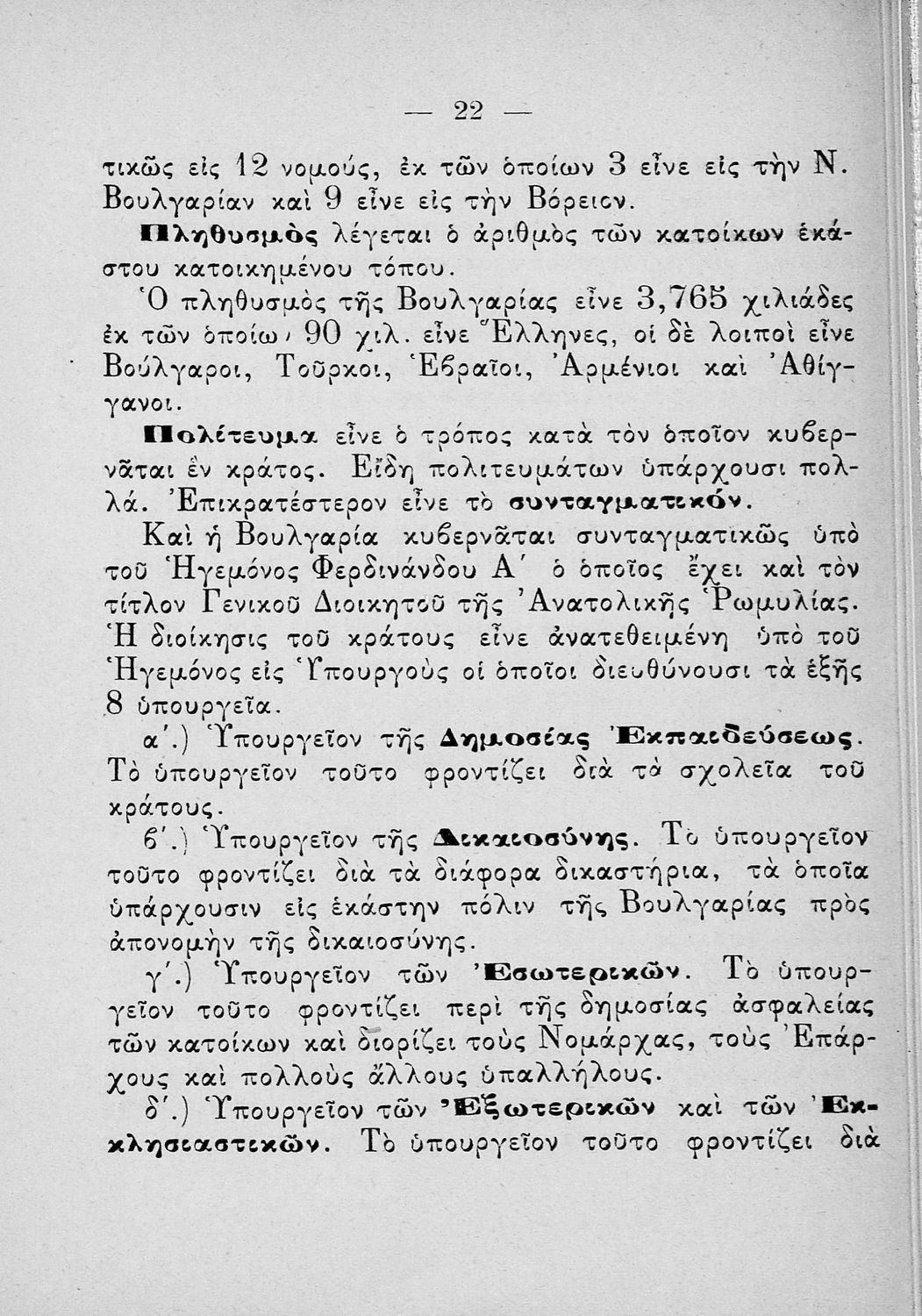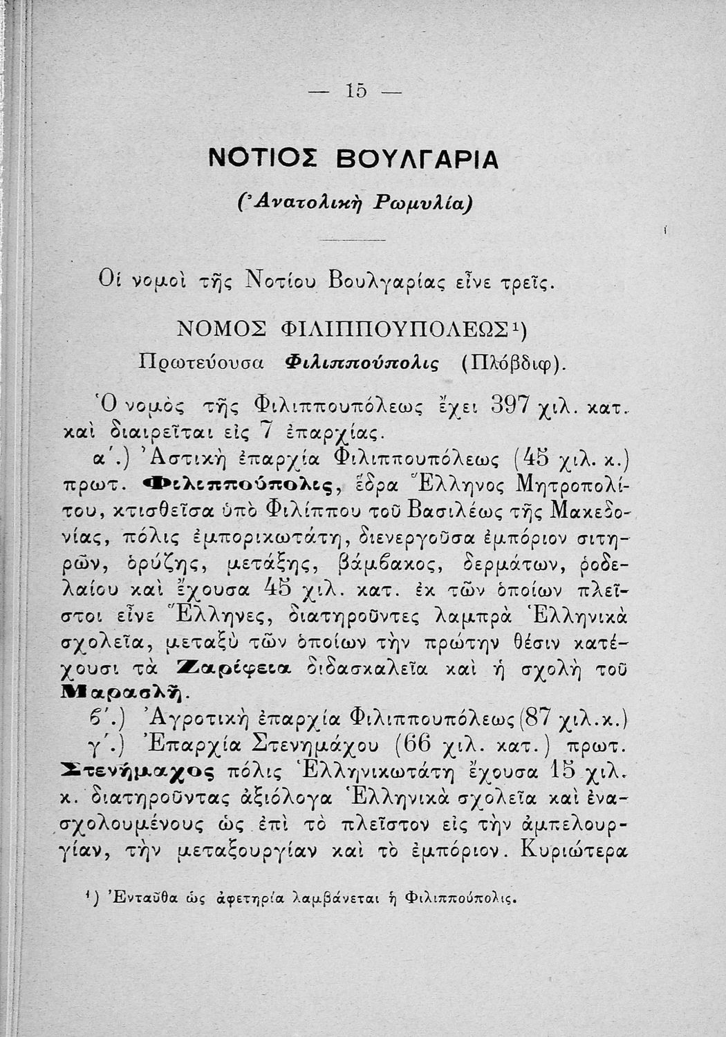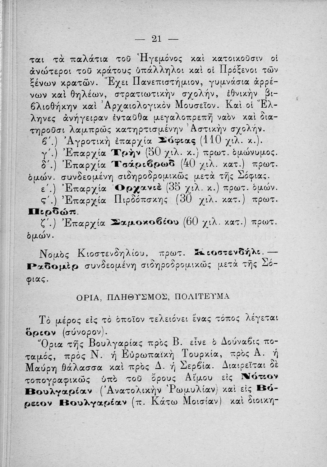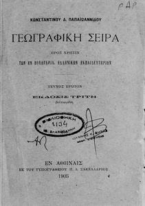 Σχολικό εγχειρίδιο Γεωγραφίας για τα ελληνικά εκπαιδευτήρια στην Βουλγαρία που περιλαμβάνει εισαγωγή στη φυσική και πολιτική γεωγραφία και εξετάζει την Ανατολική Ρωμυλία, τη Βόρεια Βουλγαρία, τη Ρουμανία, τη Σερβία, το Μαυροβούνιο, τη Ευρωπαϊκή και Ασιατική Τουρκία και την Ελλάδα από γεωφυσική, πολιτική και οικονομική άποψη.