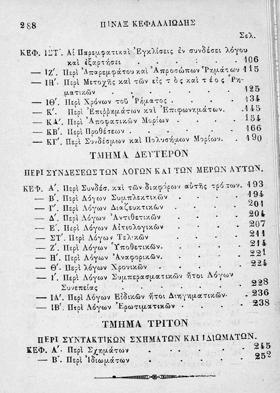 Σχολικό εγχειρίδιο για τις τάξεις του Ελληνικού και του Γυμνασίου για το μάθημα των Αρχαίων Ελληνικών και συγκεκριμένα του συντακτικού της ελληνικής γλώσσας. Το εγχειρίδιο περιλαμβάνει τους βασικούς κανόνες συντακτικού και διακρίνονται η κύρια και η υποτακτική σύνταξη, τα μέρη του λόγου και οι σύνδεσμοι, τα συντακτικά σχήματα και ιδιώματα.