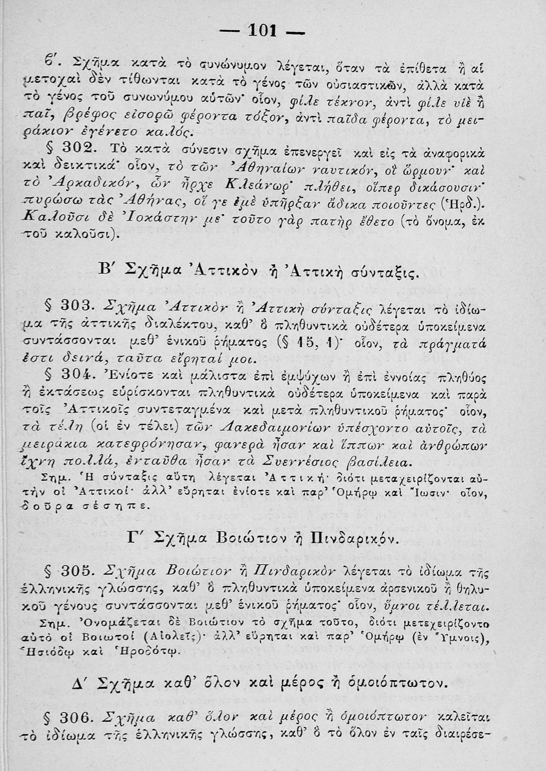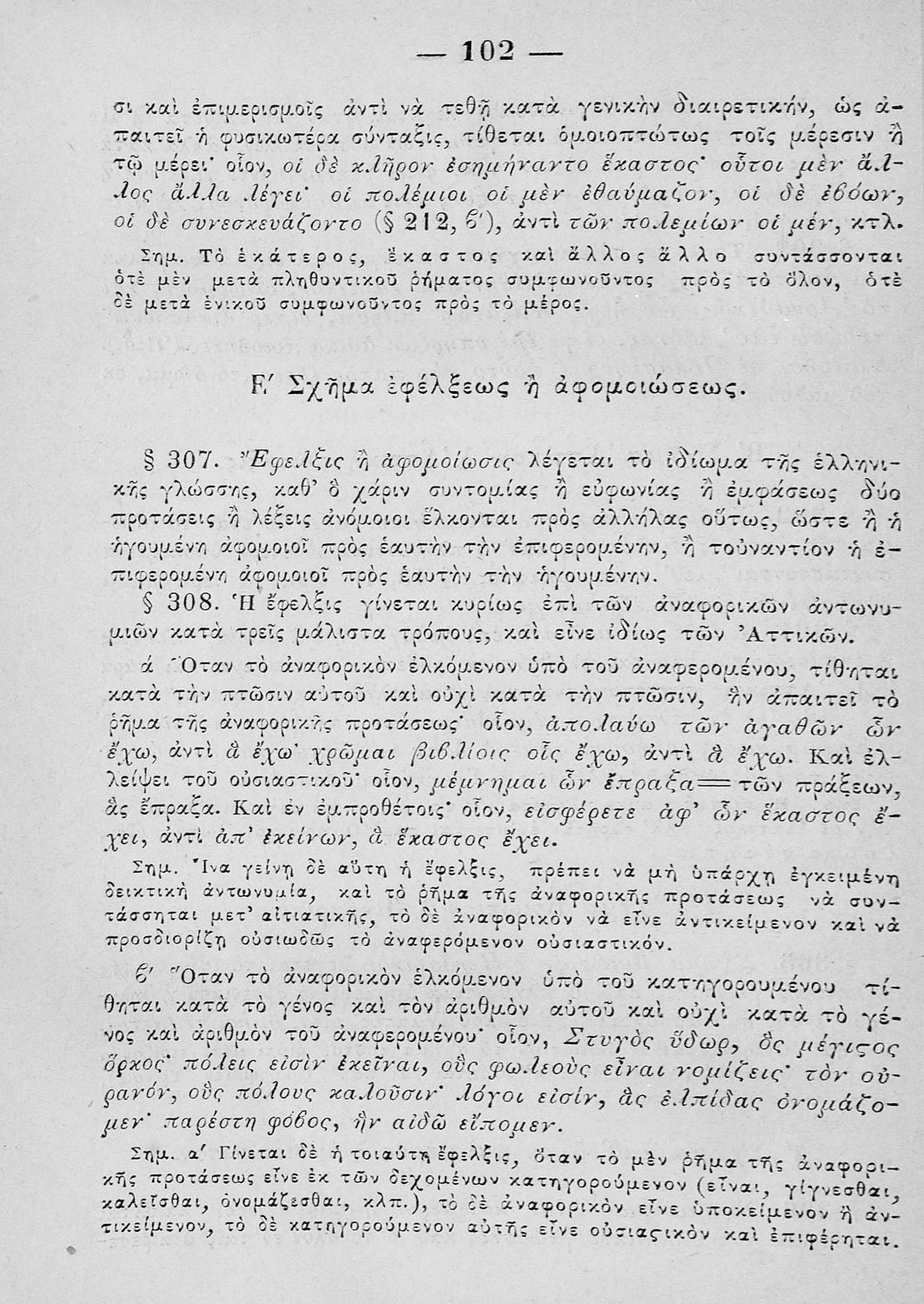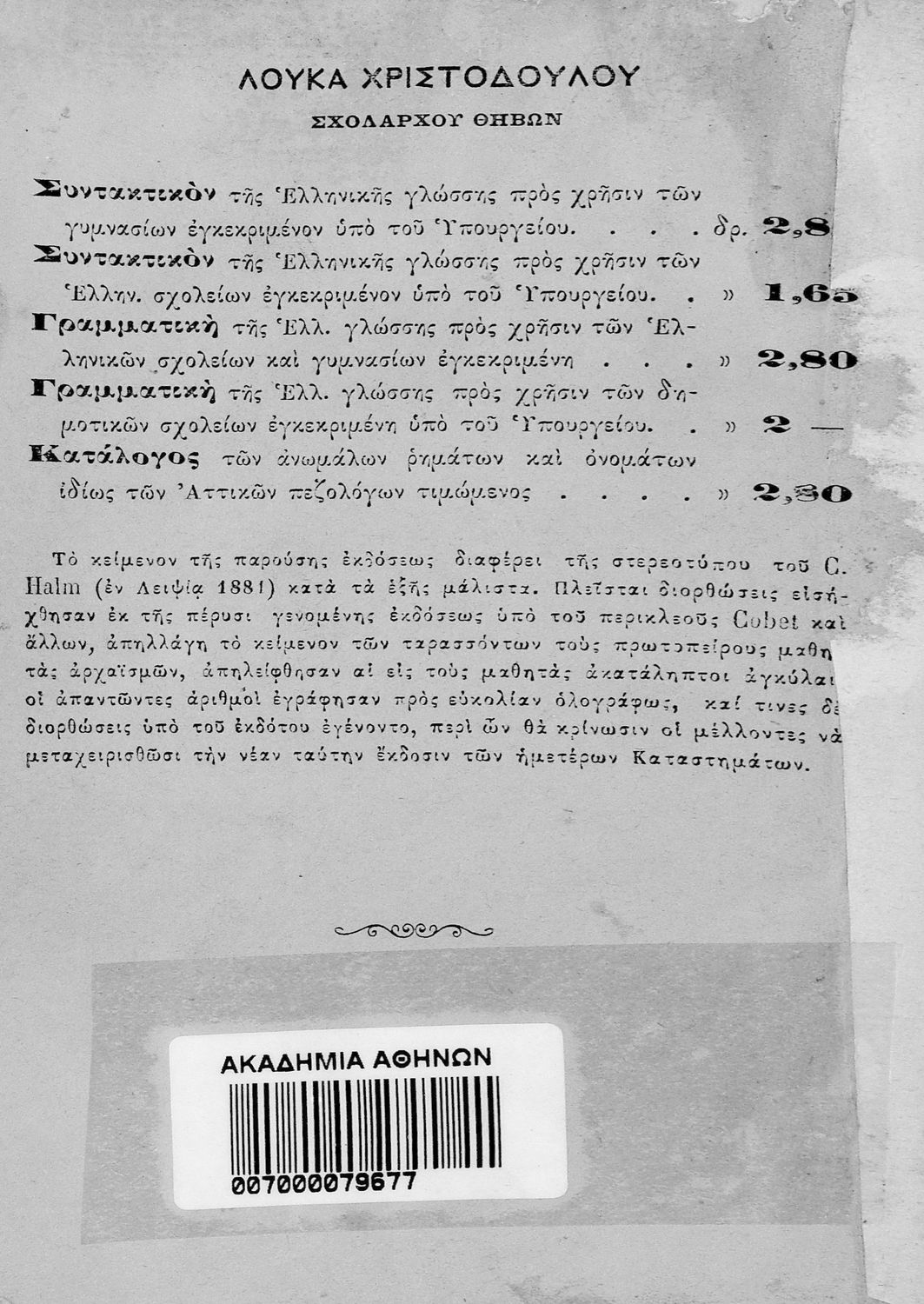 Σχολικό εγχειρίδιο Αρχαίων Ελληνικών για τα Ελληνικά Σχολεία, τα Παρθεναγωγεία και τα Γυμνάσια που περιλαμβάνει τους κανόνες γραμματικής.