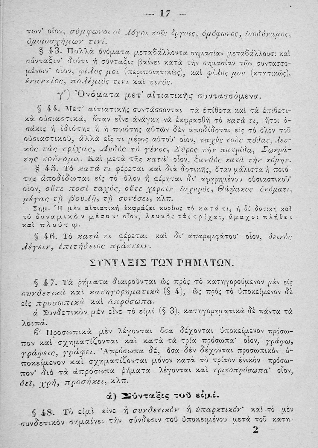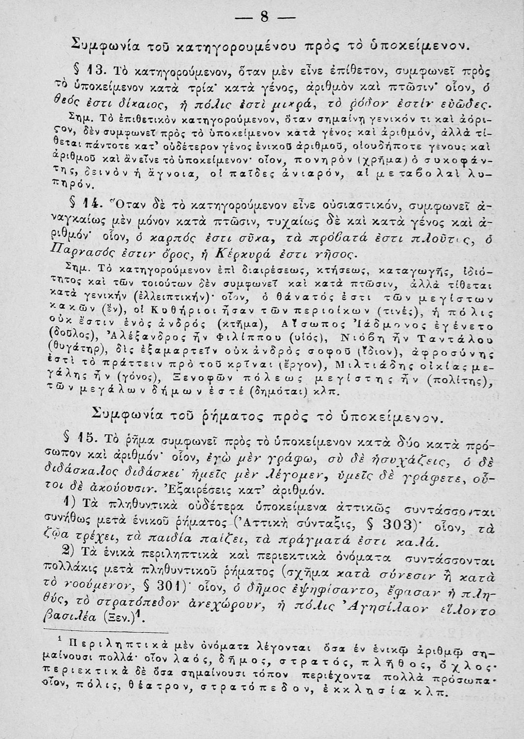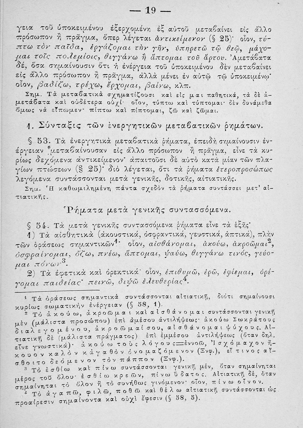 Βαθμίδα εκπαίδευσης: Δευτεροβάθμια Τάξη: Ελληνικό Σχολείο Μάθημα: Αρχαία Ελληνικά Γλώσσα: Καθαρεύουσα Παρουσίαση περιεχομένου: Σχολικό εγχειρίδιο Αρχαίων Ελληνικών για τα Ελληνικά Σχολεία που εστιάζει στα μέρη του λόγου και στην σύνταξή τους. |