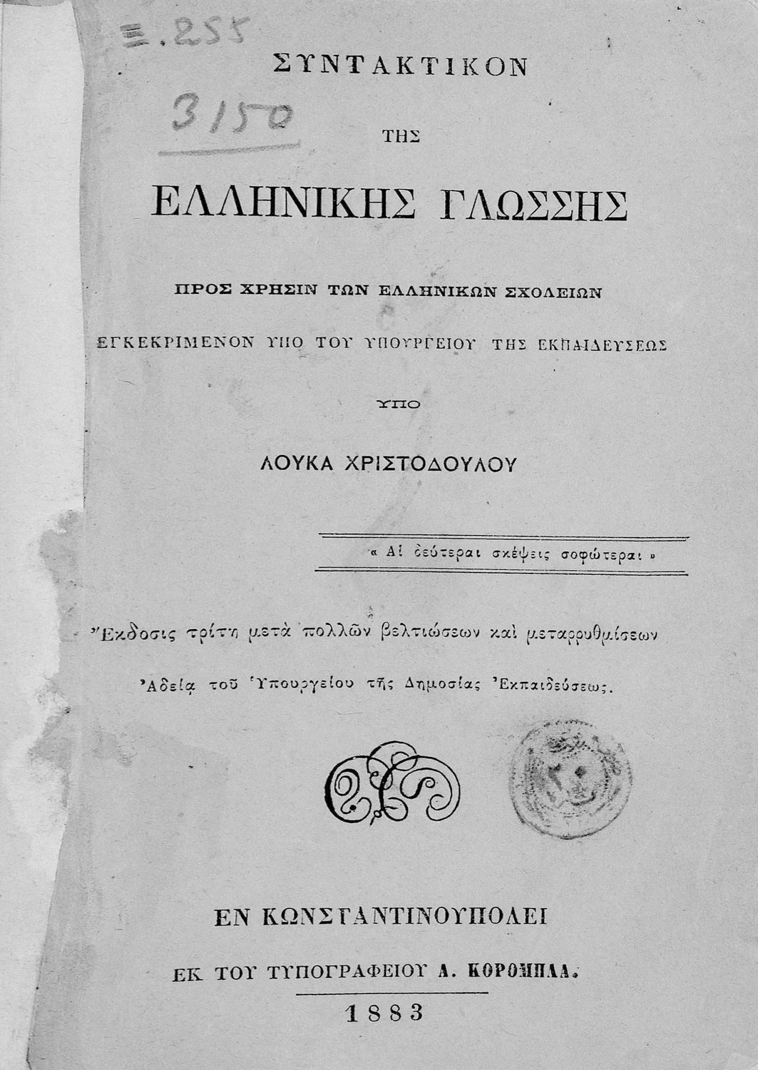 LDR 01132 2200205 4500 035 ## _a09-79677 040 ## _aΑκαδημία Αθηνών 041 ## _ael 100 ## _aΛουκάς Χριστοδούλου 110 ## _a79677 245 0# _aΣυντακτικόν της ελληνικής γλώσσης προς χρήσιν των Ελληνικών Σχολείων εγκεκριμένον υπό του υπουργείου της εκπαιδεύσεως 250 ## _a3η Έκδοση 260 ## _aΚωνσταντινούπολη _bΑ. Κορομηλάς _c1883 300 ## _a120 _bΕξώφυλλο (έγχρωμο) 520 ## _aΣχολικό εγχειρίδιο Αρχαίων Ελληνικών για τα Ελληνικά Σχολεία που εστιάζει στα μέρη του λόγου και στην σύνταξή τους. 521 ## _aΕλληνικό Σχολείο 522 ## _aΈξω ελληνισμός 546 ## _aΚαθαρεύουσα 563 ## _aΣκληρό Εξώφυλλο 650 #4 _aΑντικείμενο _aΠροθέσεις _aΠροσδιορισμοί _aΡήματα _aΥποκείμενο