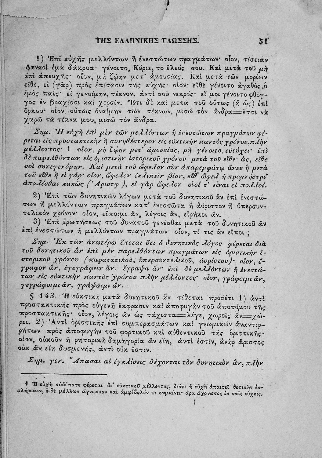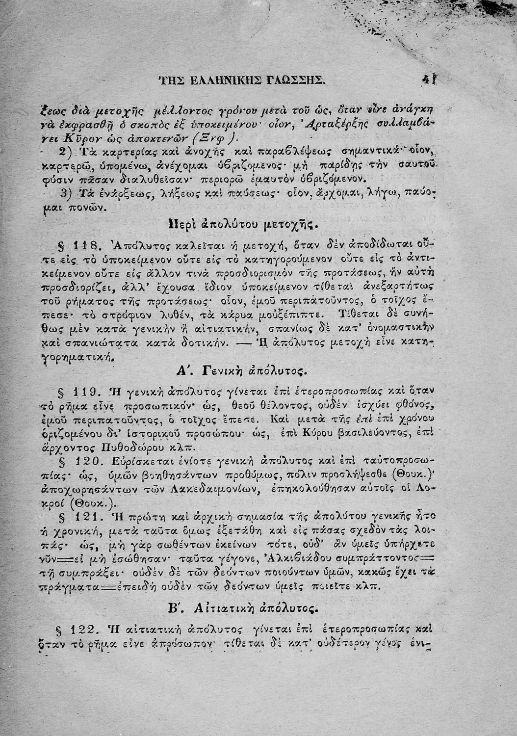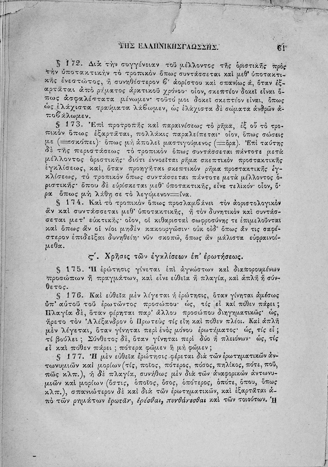 Σχολικό εγχειρίδιο Αρχαίων Ελληνικών για τα Ελληνικά Σχολεία, τα Παρθεναγωγεία και τα Γυμνάσια που περιλαμβάνει τους κανόνες γραμματικής.