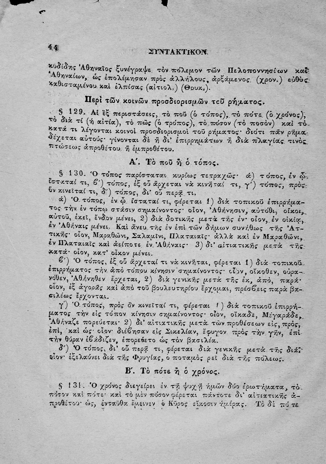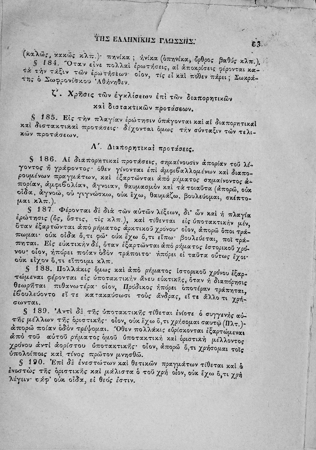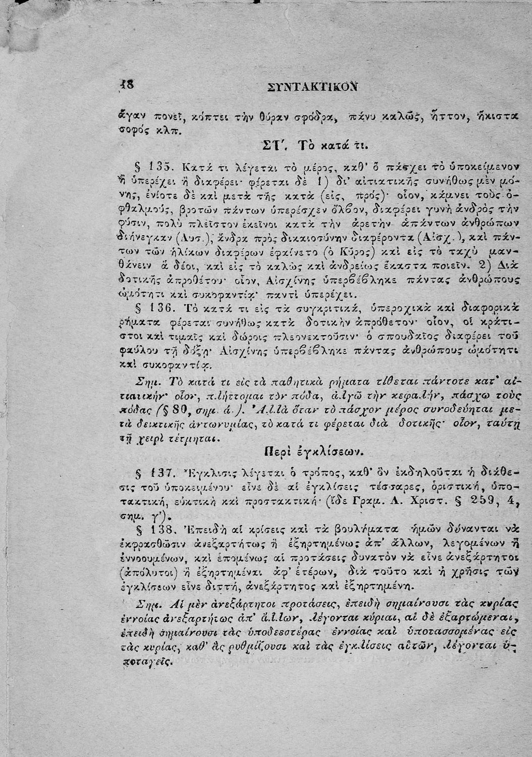 Σχολικό εγχειρίδιο Αρχαίων Ελληνικών για τα Ελληνικά Σχολεία και τα Ανώτερα Παρθεναγωγεία που εξετάζει τα μέρη του λόγου και την σύνταξή τους.