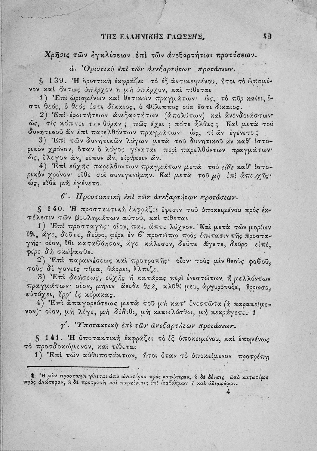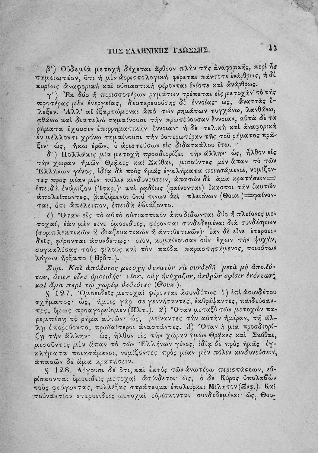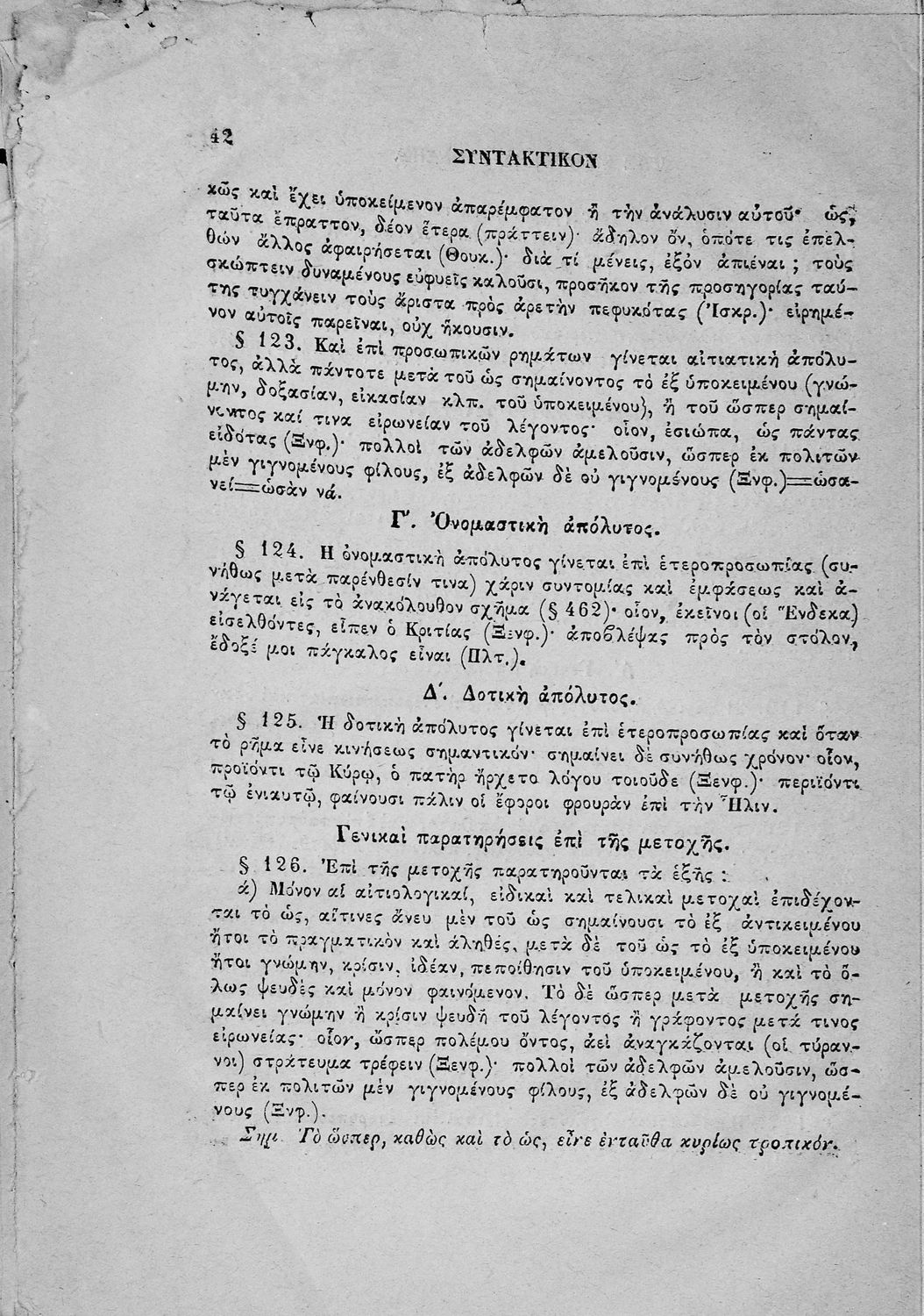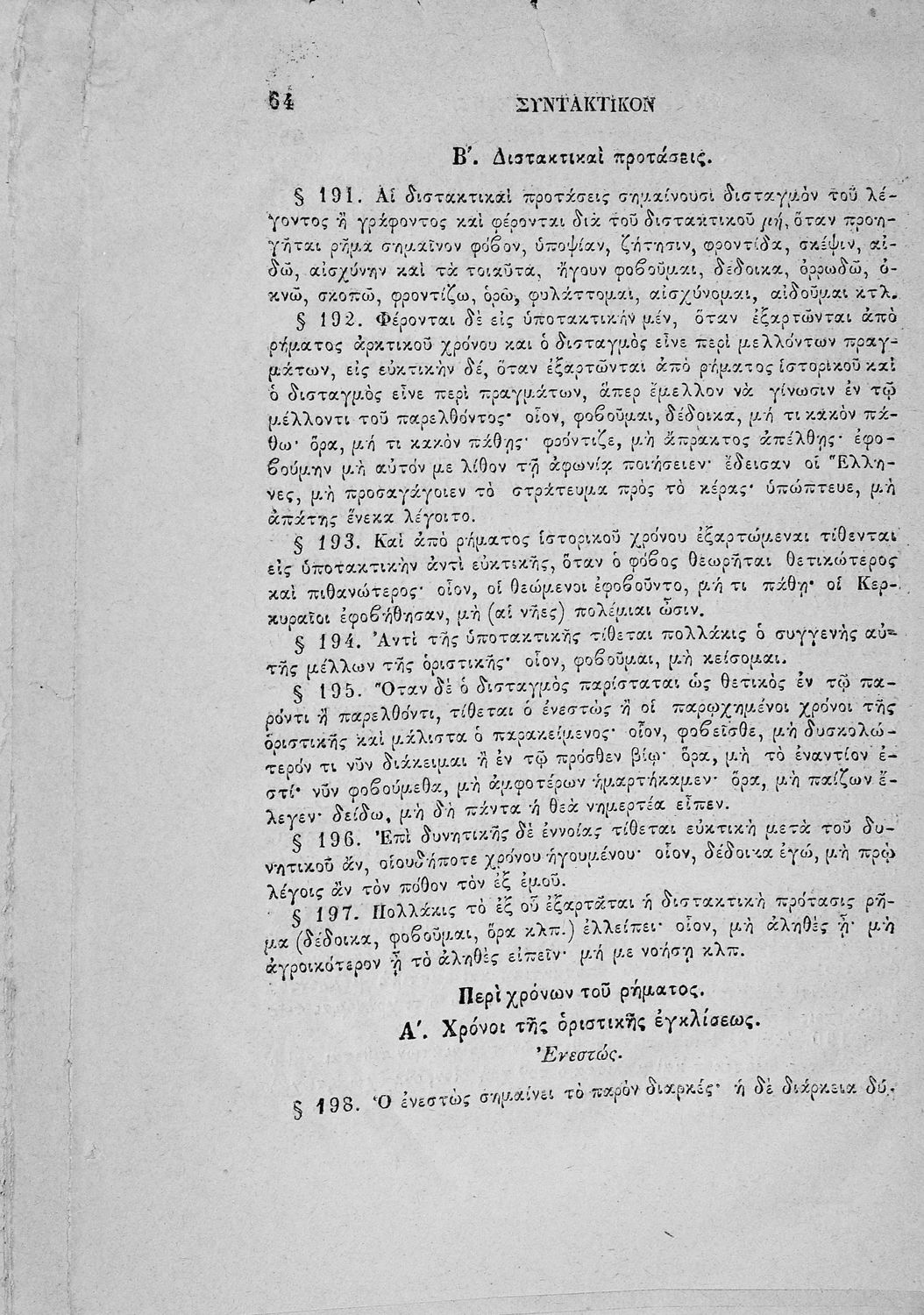Σχολικό εγχειρίδιο Αρχαίων Ελληνικών για τα Ελληνικά Σχολεία και τα Ανώτερα Παρθεναγωγεία που εξετάζει τα μέρη του λόγου και την σύνταξή τους.