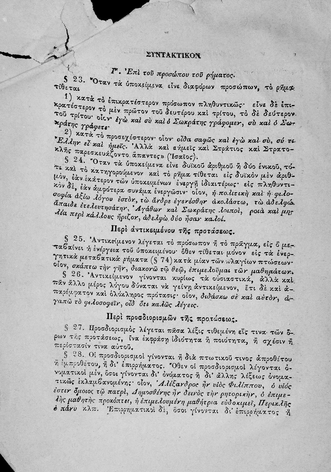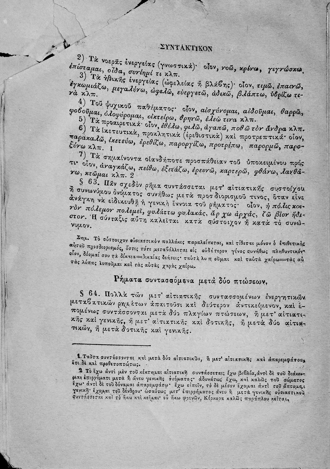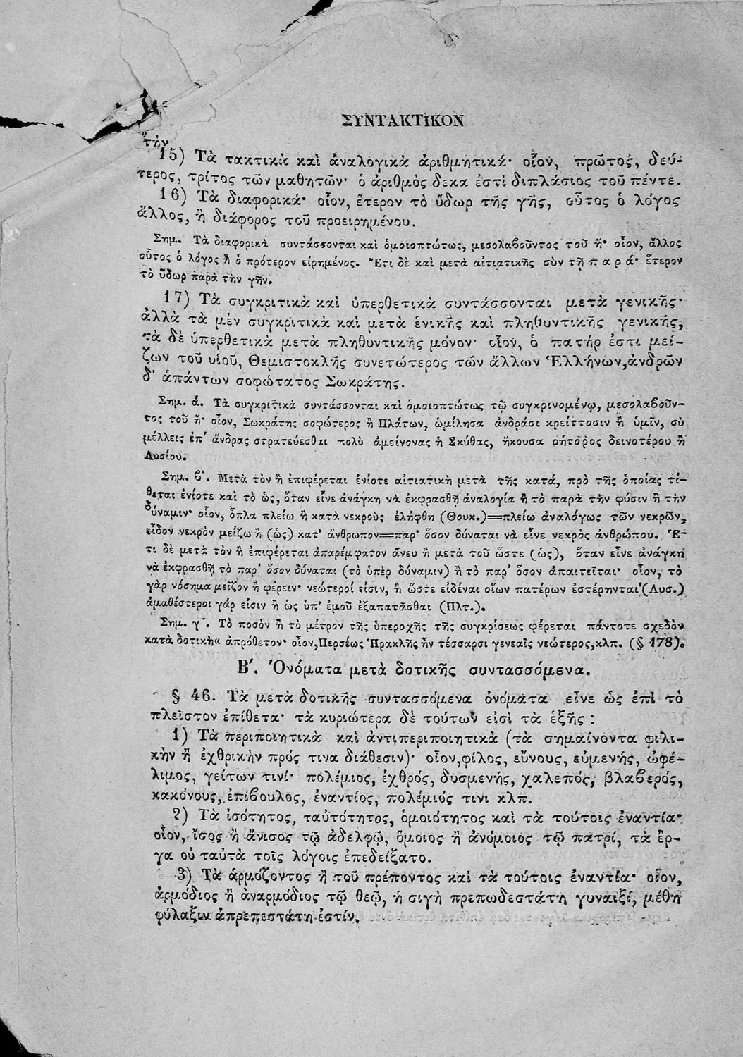 Σχολικό εγχειρίδιο Αρχαίων Ελληνικών για τα Ελληνικά Σχολεία και τα Ανώτερα Παρθεναγωγεία που εξετάζει τα μέρη του λόγου και την σύνταξή τους.