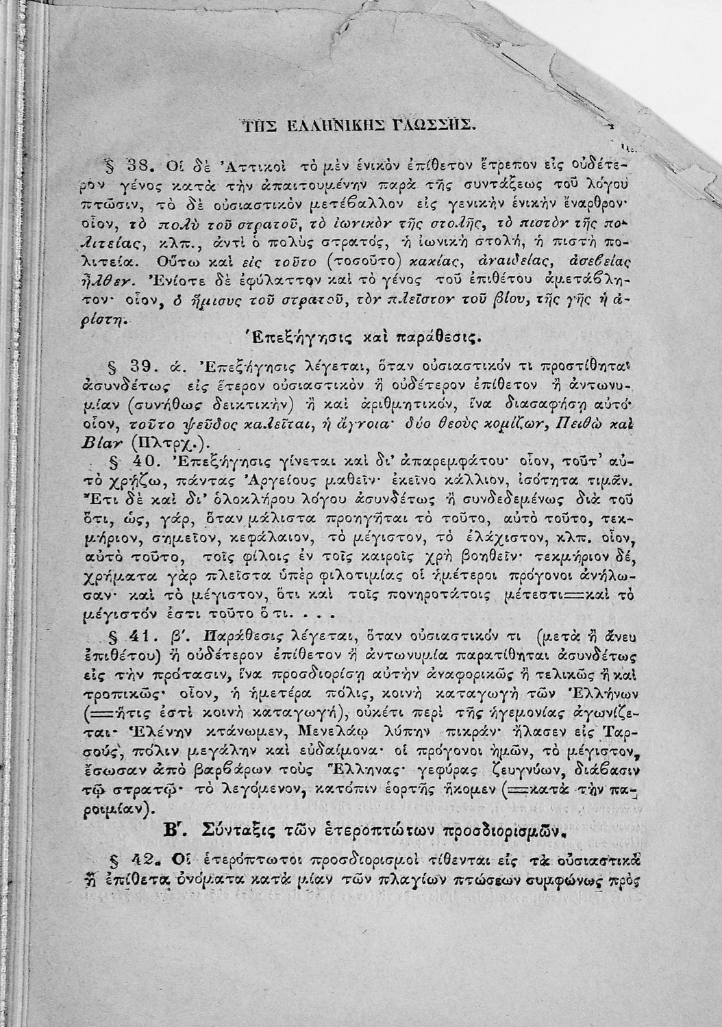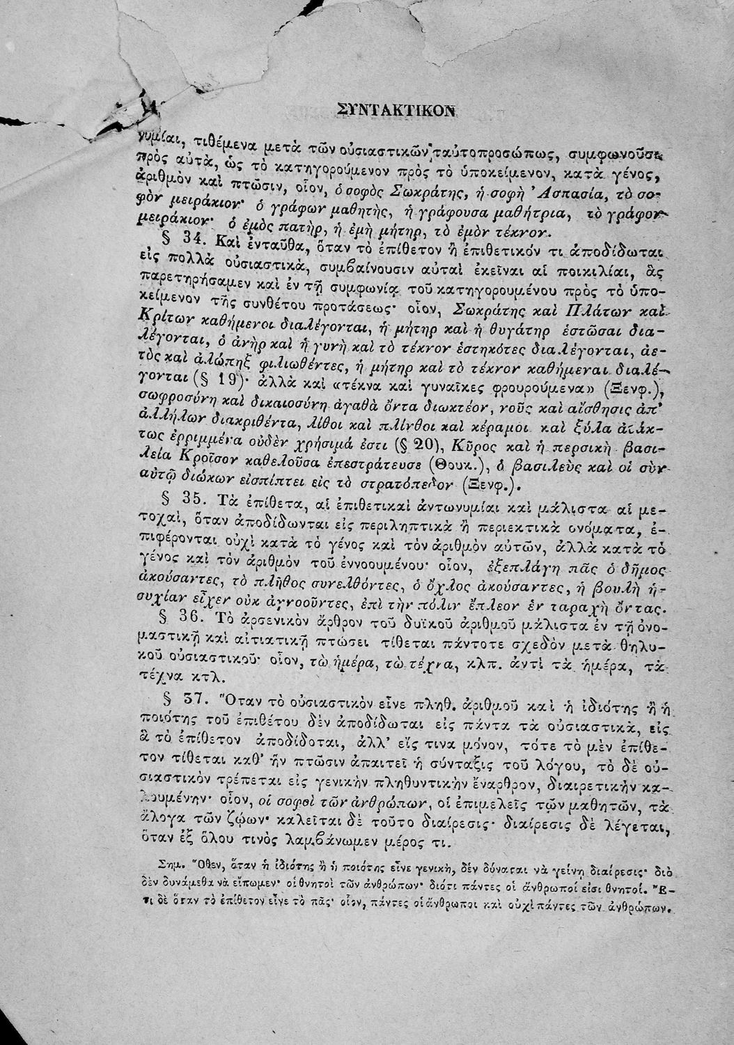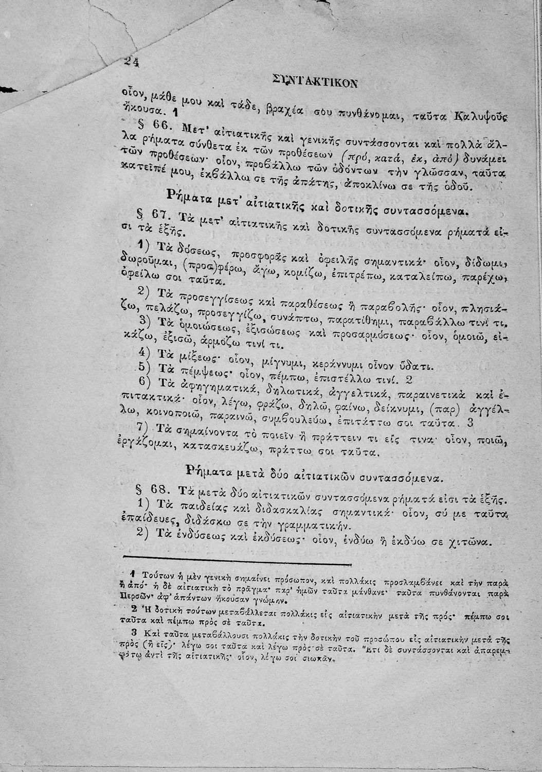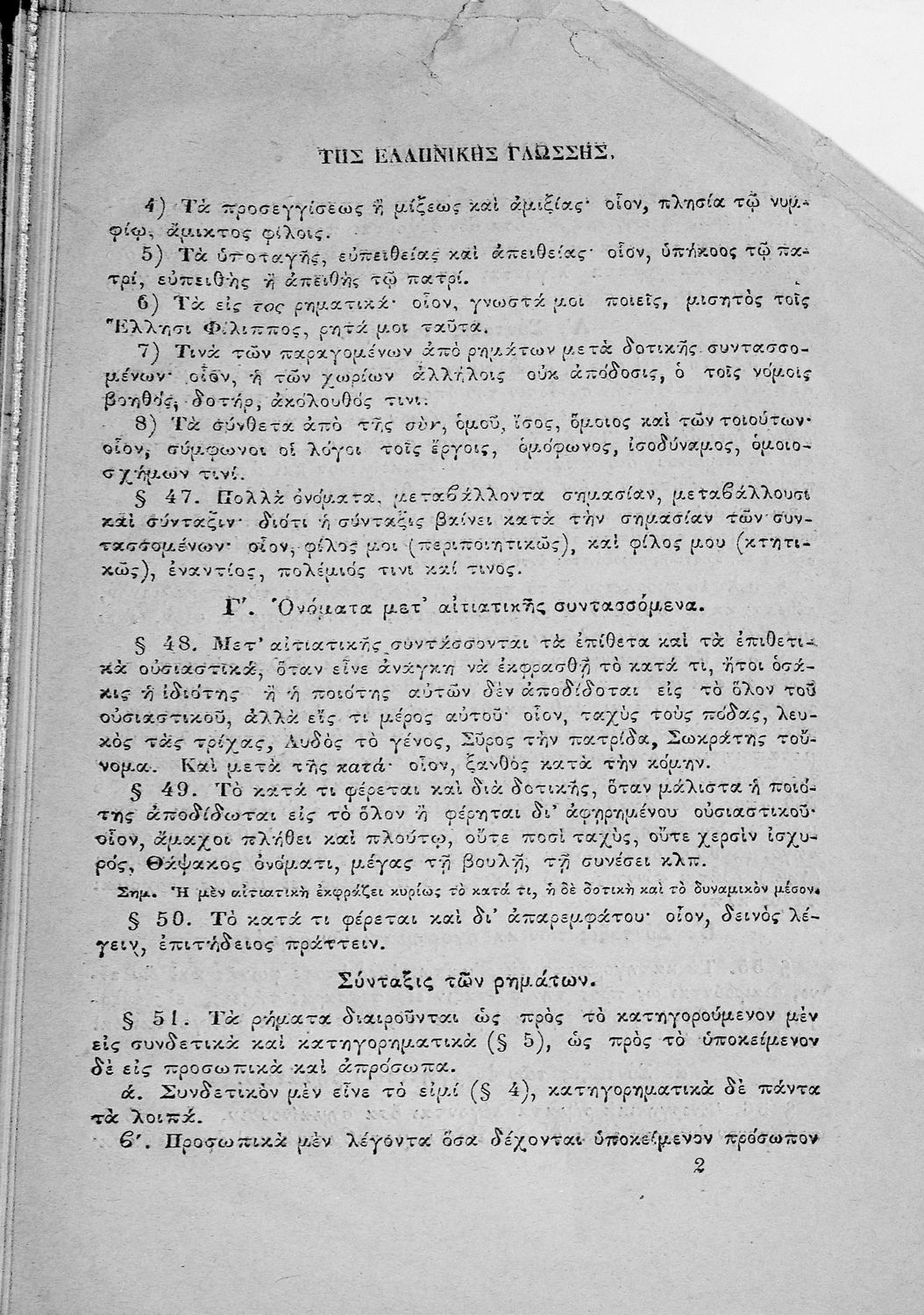 Σχολικό εγχειρίδιο Αρχαίων Ελληνικών για τους μαθητές των Ελληνικών Σχολείων και Παρθεναγωγείων που εξετάζει τα μέρη του λόγου και την σύνταξή τους.