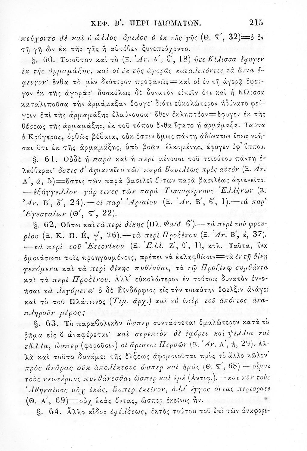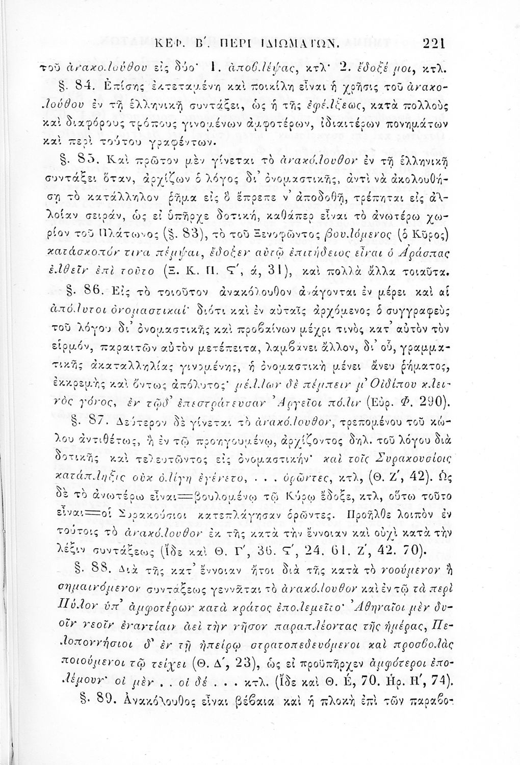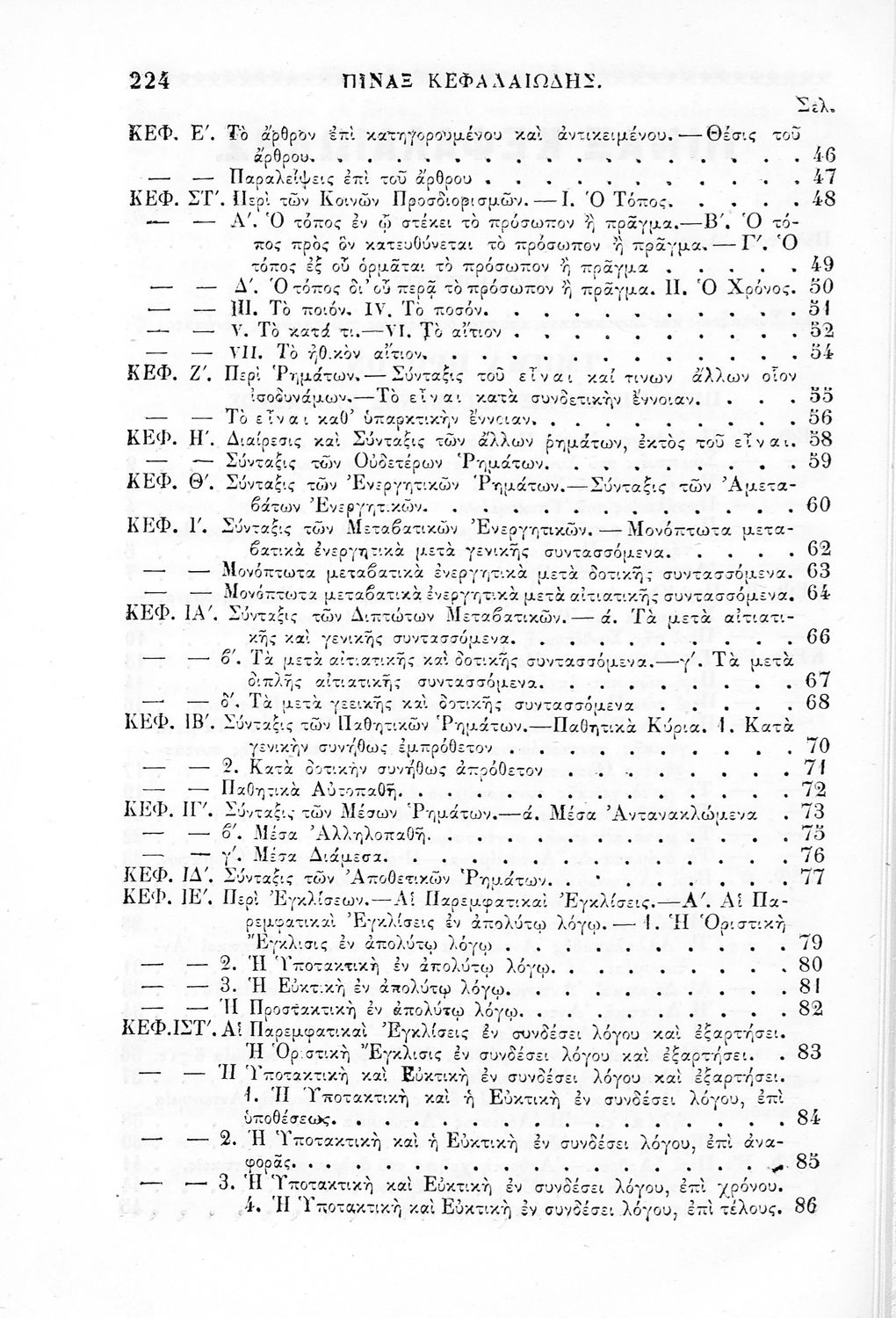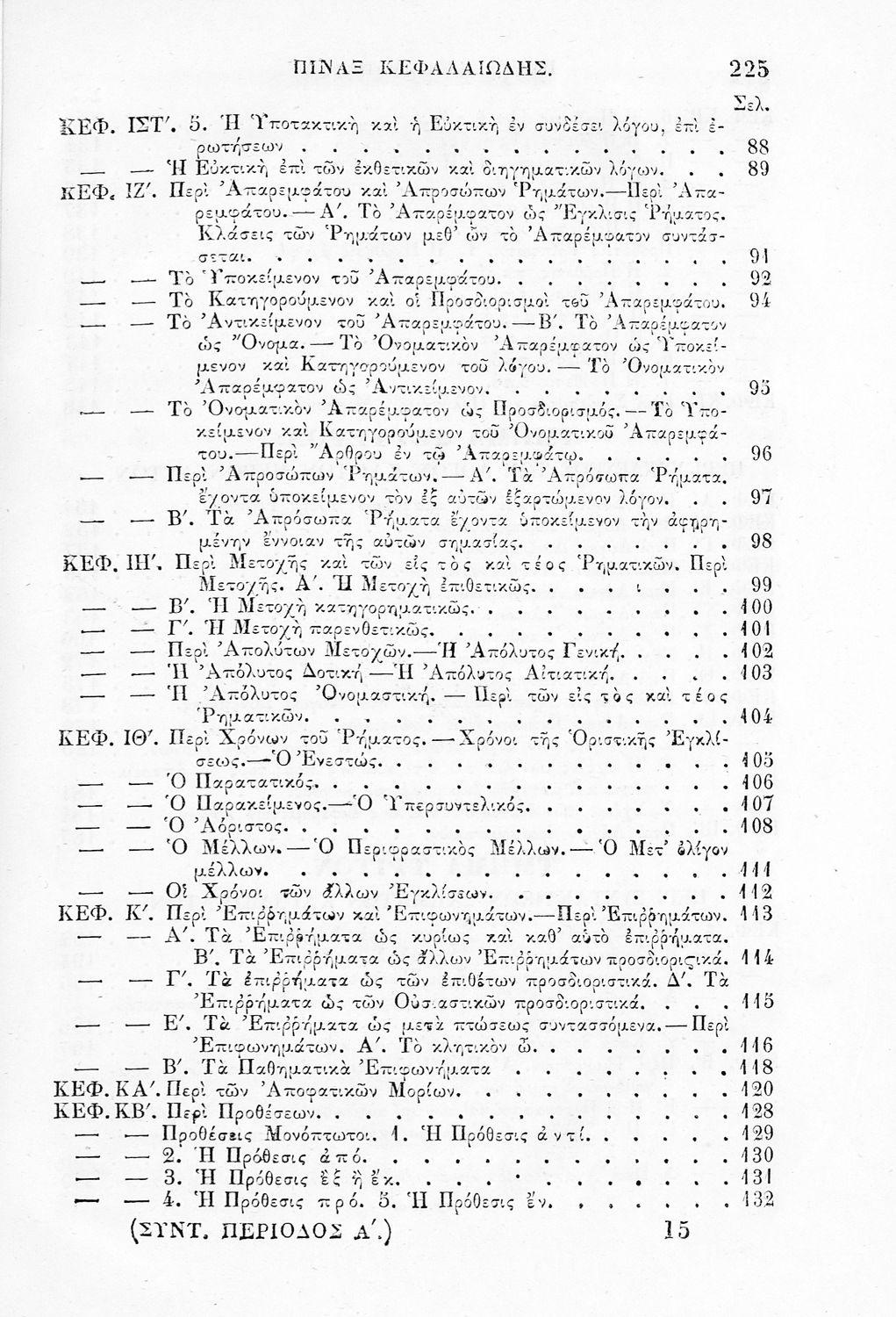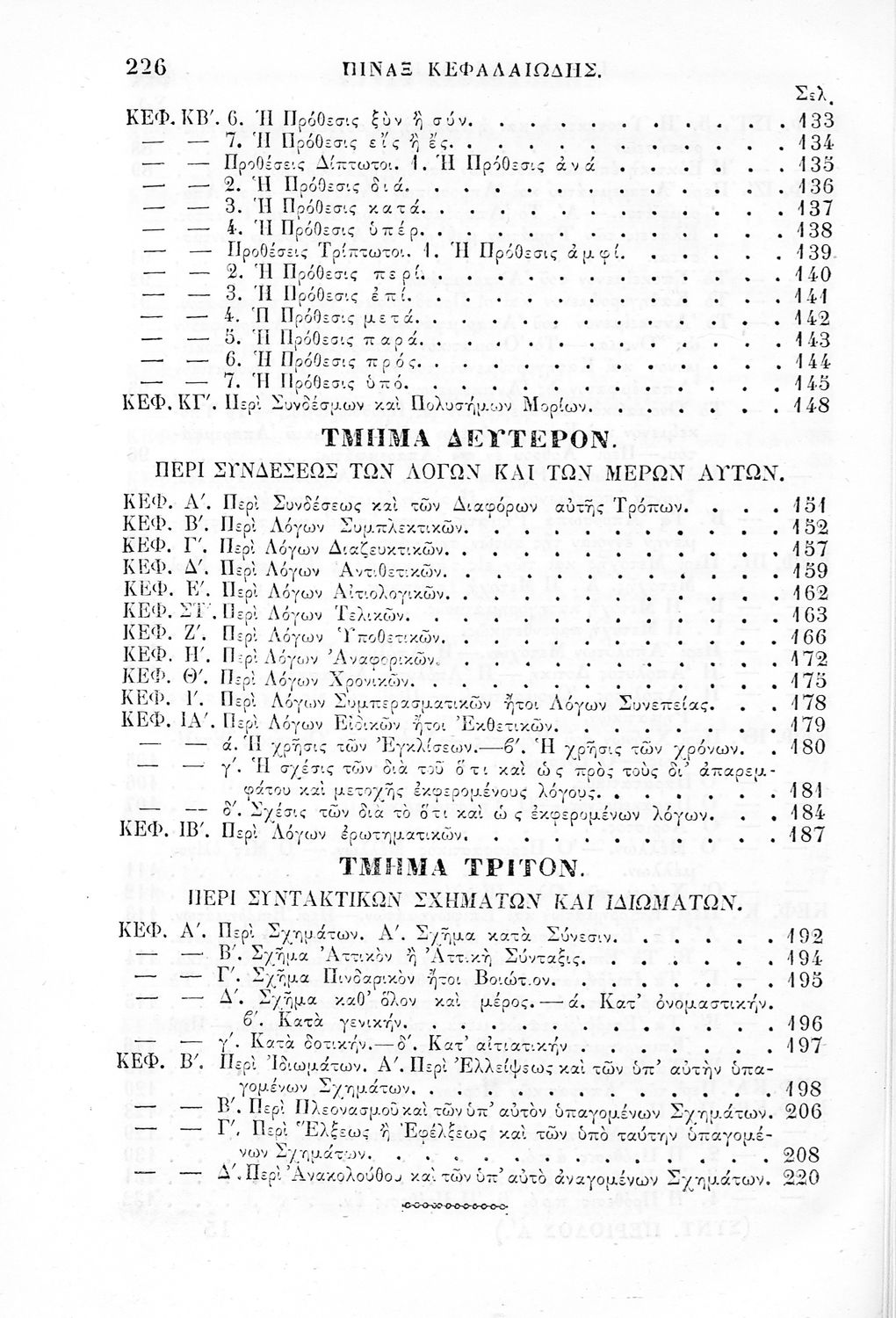 Σχολικό εγχειρίδιο για τις τάξεις του Ελληνικού και του Γυμνασίου για το μάθημα των Αρχαίων Ελληνικών και συγκεκριμένα του συντακτικού της ελληνικής γλώσσας. Το εγχειρίδιο περιλαμβάνει τους βασικούς κανόνες συντακτικού και διακρίνονται η κύρια και η υποτακτική σύνταξη, τα μέρη του λόγου και οι σύνδεσμοι, τα συντακτικά σχήματα και ιδιώματα.