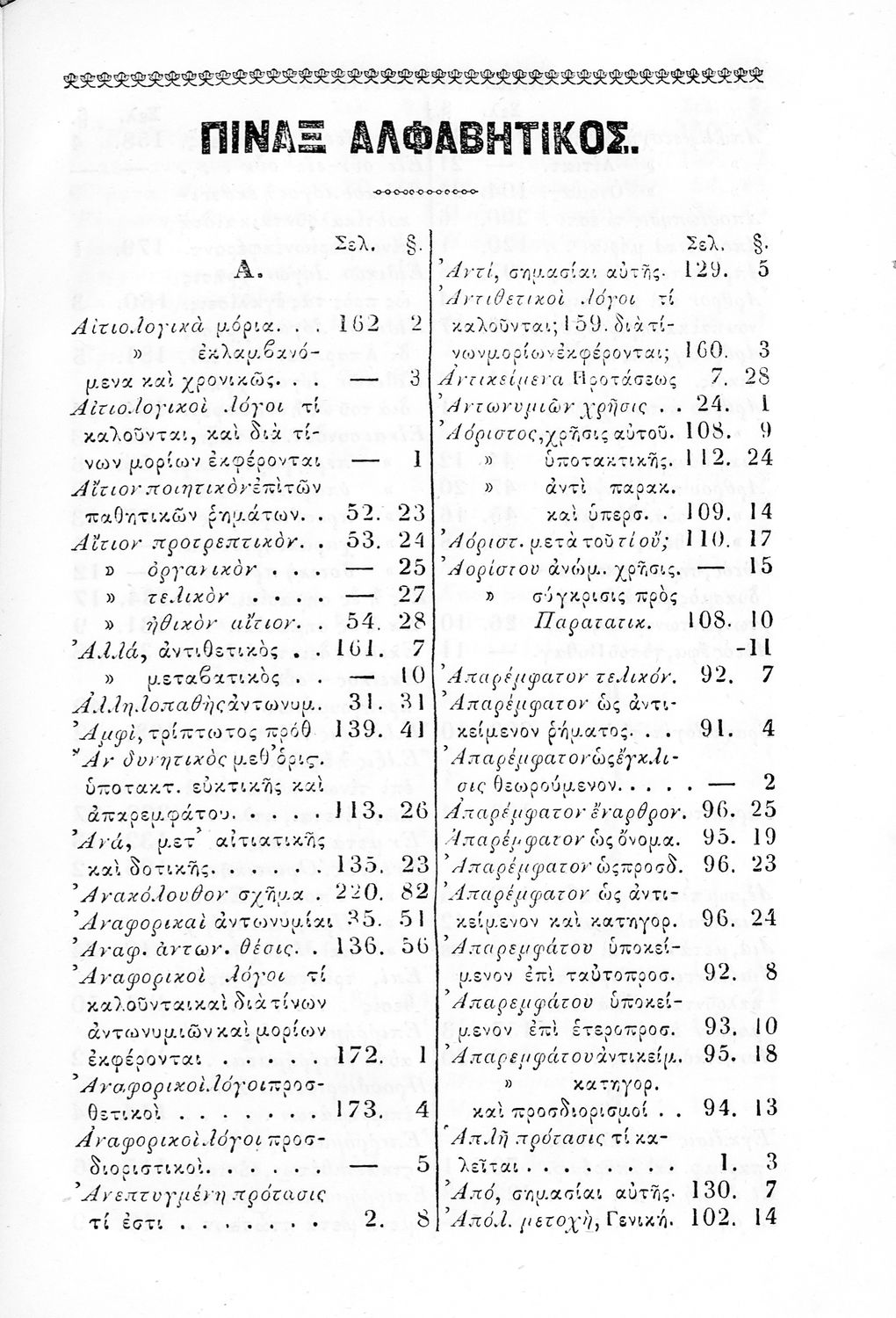 Μαθητικό βοήθημα Αρχαίων Ελληνικών για τα Ελληνικά Σχολεία, Παρθεναγωγεία και Γυμνάσια που περιλαμβάνει γραμματική της αρχαίας ελληνικής και κατάλογο ανωμάλων ρημάτων.